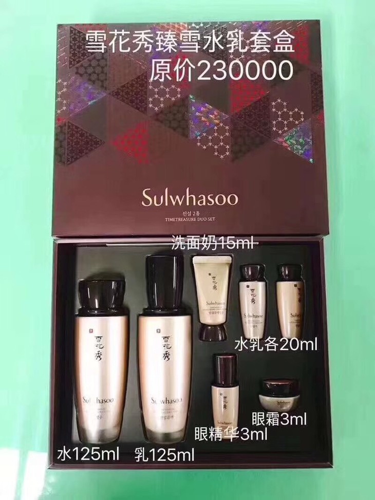 又叫“返老还童”套盒!规格:水125ML、乳125ML 赠送: 珍雪水20ml,珍雪乳液20ml,珍雪眼部精华3ml,珍雪眼霜3ml,珍雪洁面15ml。适合肤质:所有人群功效:抗皱 紧致 保湿 补水产品说明:雪花秀珍雪面水乳 蕴含取自西海大青島的生命力极强的赤松成分,提高皮肤保护能力,促进皮肤新陈代谢。