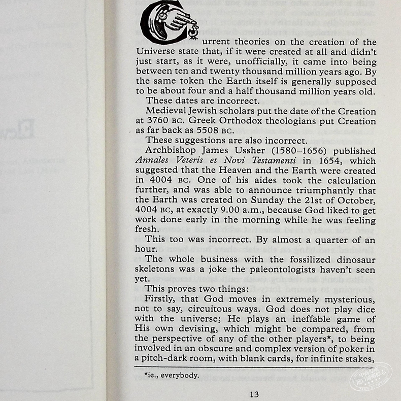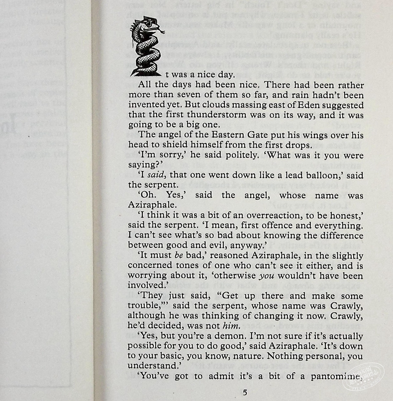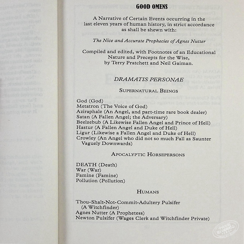 There is a distinct hint of Armageddon in the air. According to The Nice and Accurate Prophecies of Agnes Nutter, Witch (recorded, thankfully, in 1655, before she blew up her entire village and all its inhabitants, who had gathered to watch her burn), the world will end on a Saturday. Next Saturday, in fact. So the armies of Good and Evil are amassing, the Four Bikers of the Apocalypse are revving up their mighty hogs and hitting the road, and the world's last two remaining witch-finders are getting ready to fight the good fight, armed with awkwardly antiquated instructions and stick pins. Atlantis is rising, frogs are falling, tempers are flaring. . . . Right. Everything appears to be going according to Divine Plan.