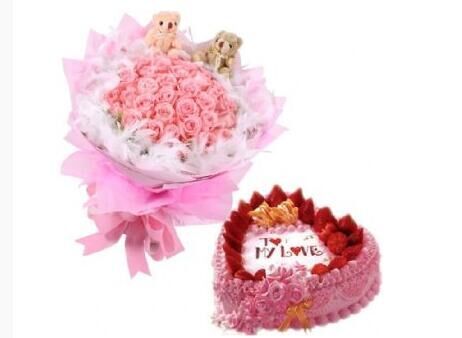 花材:33枝粉玫瑰搭配2只小熊,8寸心形水果蛋糕