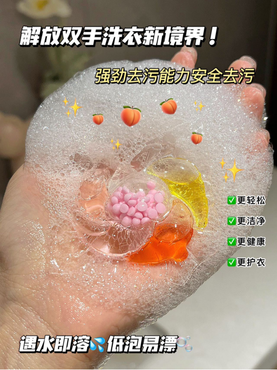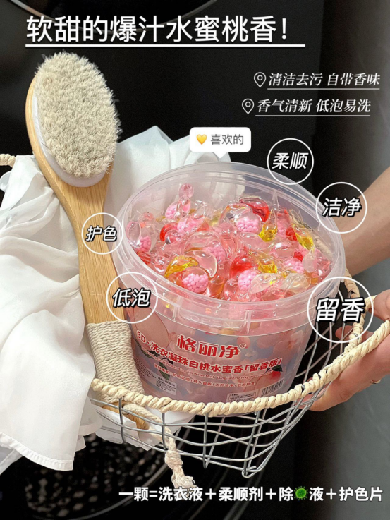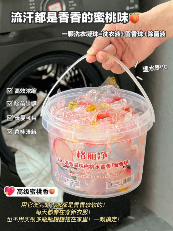 洗衣新宠来袭!格丽净-6D洗衣凝珠白桃水蜜香留香版,简直是衣物的小香氛机嘛! 每次洗衣都像在果园里漫步,白桃的清甜遇上水蜜的柔情,每一颗都是满满的幸福感💖。告别传统洗衣液的繁琐,一颗搞定全家衣物,干净又香香的,心情都变好了呢! 留香持久到不可思议,穿上用它洗过的衣服,仿佛随身携带着春天的气息,走到哪里都是行走的香氛瓶。而且,环保又高效,低泡易漂,省时省力更省心~