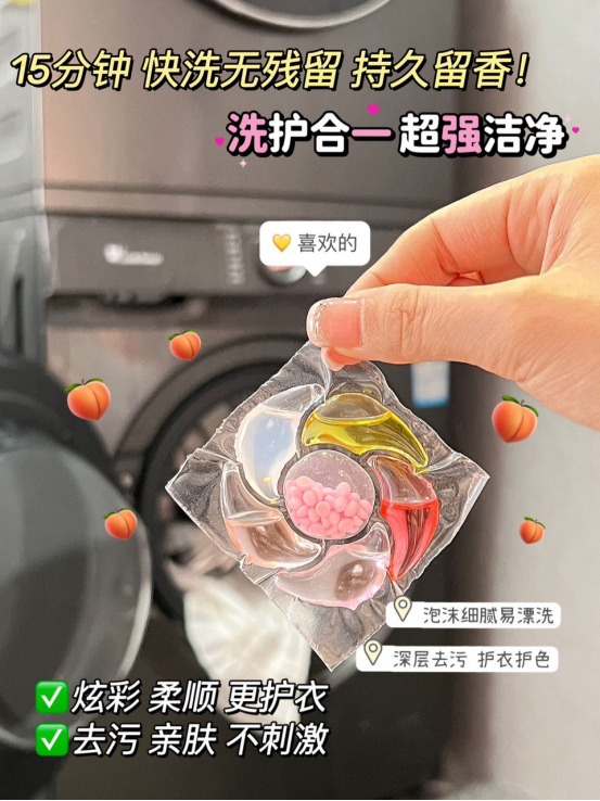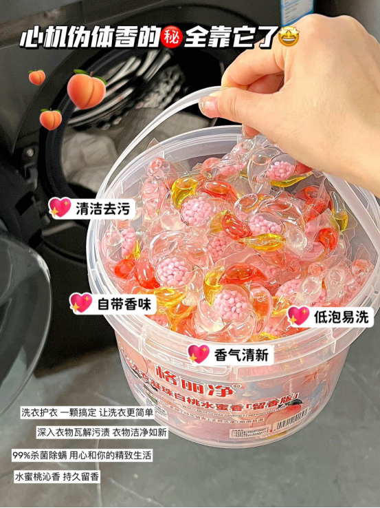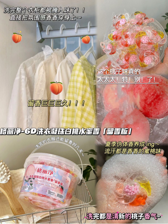 🌞夏日炎炎,就要来点不一样的清新甜蜜!🍑 铛铛铛~格丽净-6D洗衣凝珠白桃水蜜香来啦!💖 这颗小魔珠,简直是衣物的小秘密武器哦!💥 每次洗衣,丢一颗进去,洗衣机转啊转,白桃的清新与水蜜的甜蜜交织成梦幻泡泡~🧼 洗完晾干,穿上身,哇塞!整个人都散发着自然又高级的体香,好像刚从果园里走出来的小仙女~🧚♀ 留香持久,一整天都心情美美哒!无论是约会还是日常,都是最完美的隐形香水~💖
