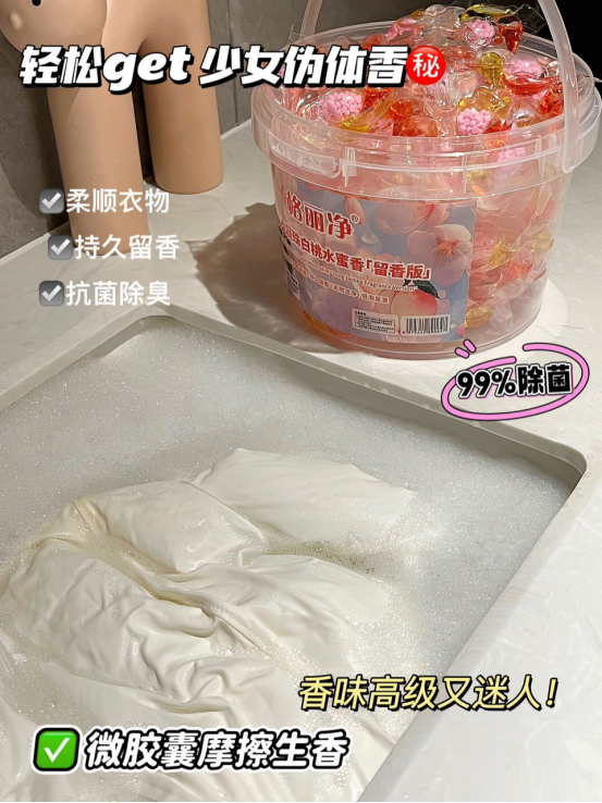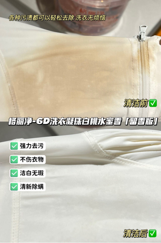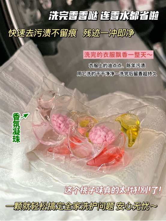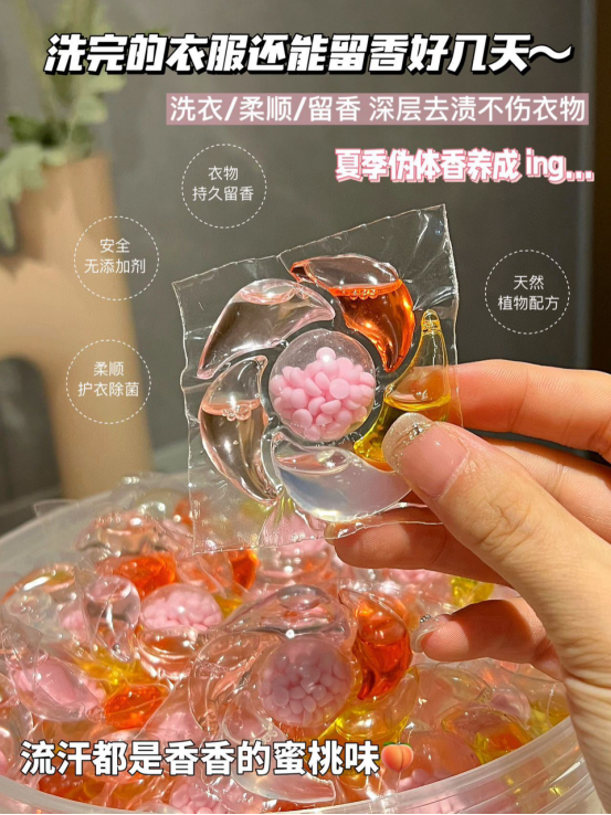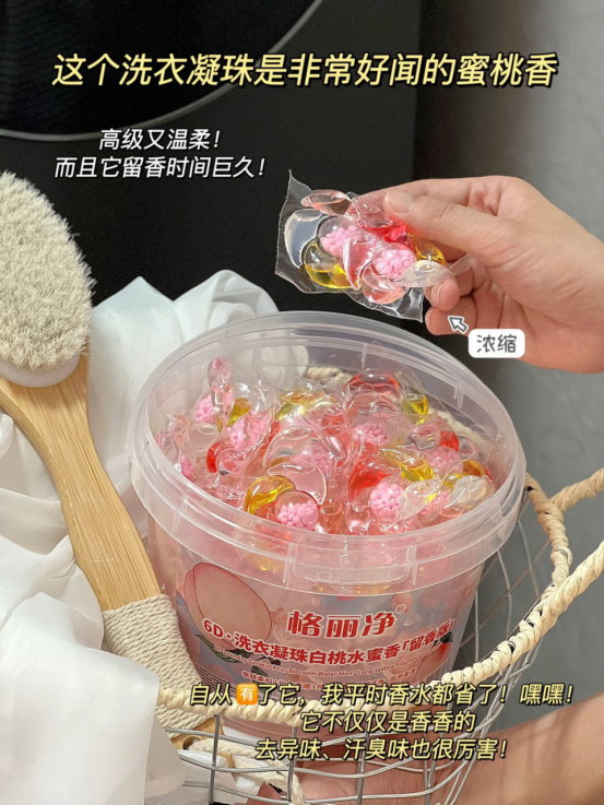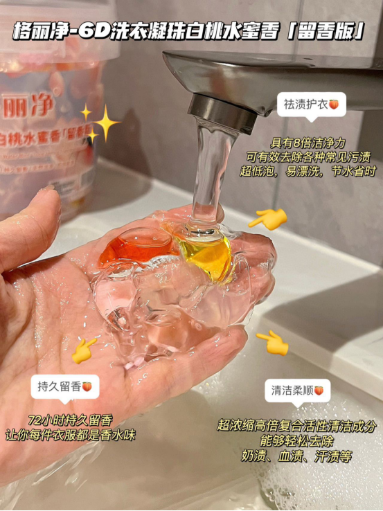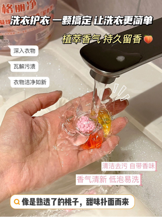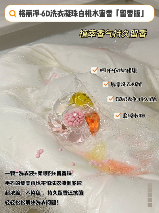 提到这款6腔洗衣凝珠 不得不提的就是 格丽净-6D洗衣凝珠白桃水蜜香「留香版」 用微胶囊壁材密封包裹起来 确保在洗衣过程中能够缓慢释放香气 实现长效留香 每一颗凝珠都仿佛是一个小小的香氛炸弹 等待着在洗衣机的旋转中绽放 为您的衣物带来一场前所未有的芳香之旅