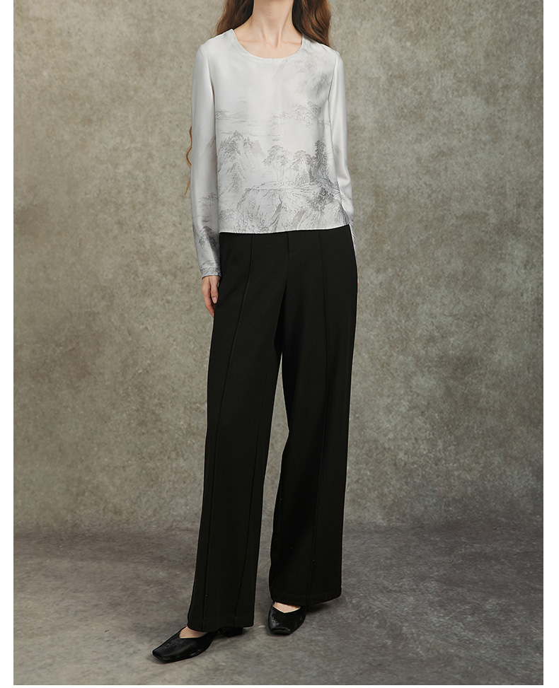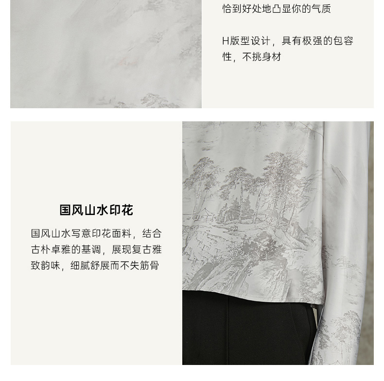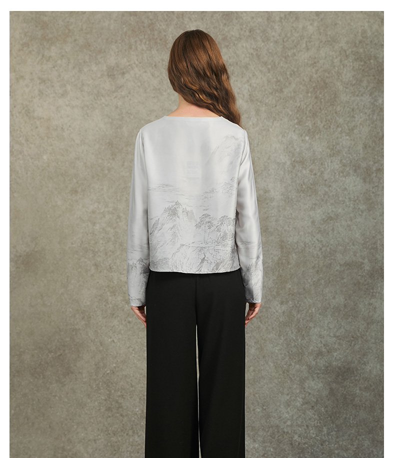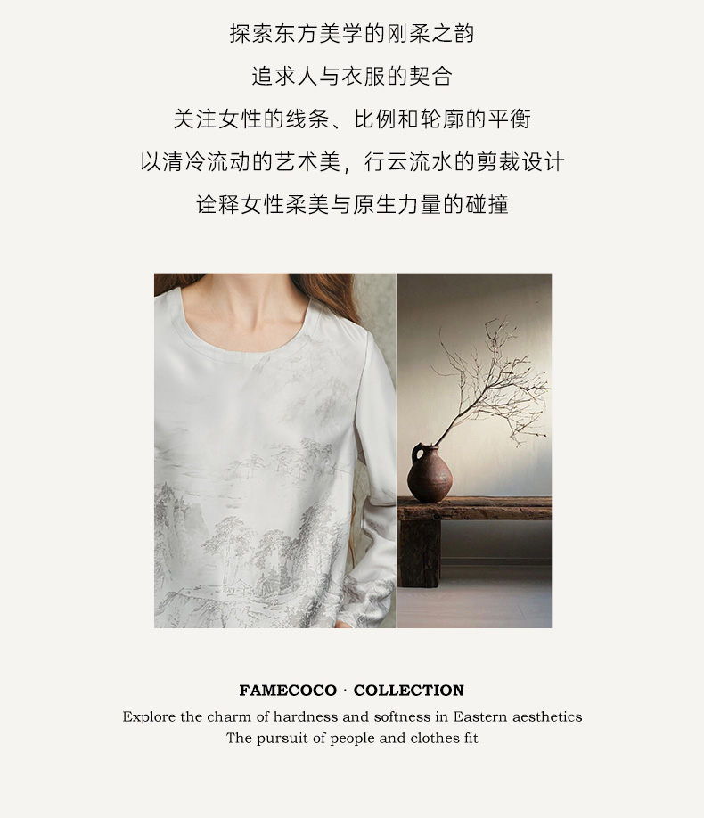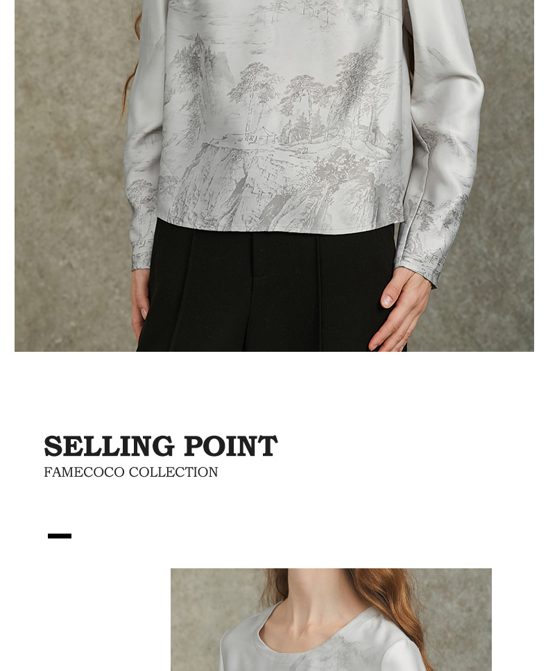 Famecoco范可儿圆领套头上衣国风山水印花锻感上衣FAC6BE002
