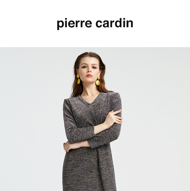皮尔卡丹女装秋冬新款条纹状碎花连衣裙知性女装A字裙P94DL23L3
