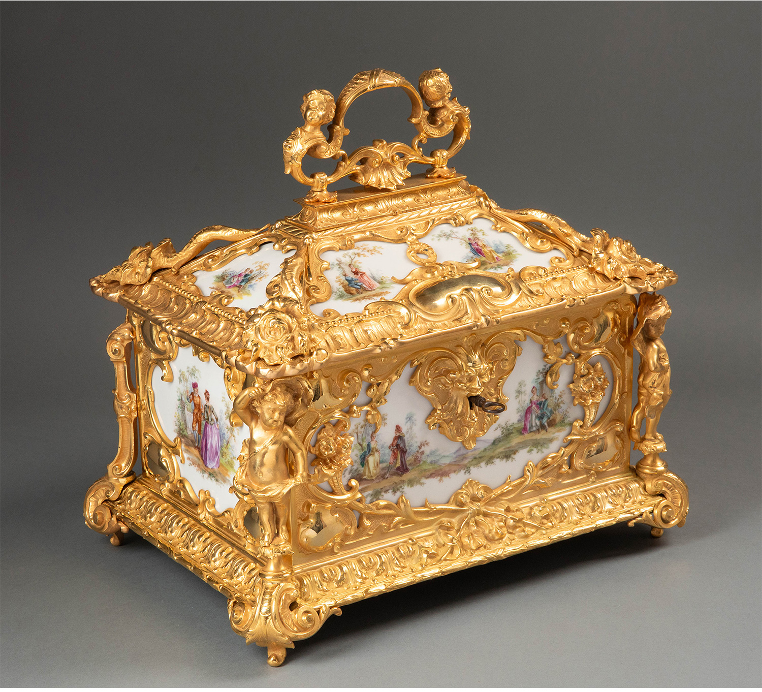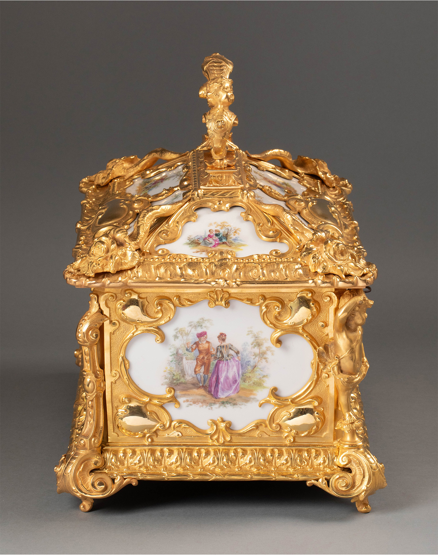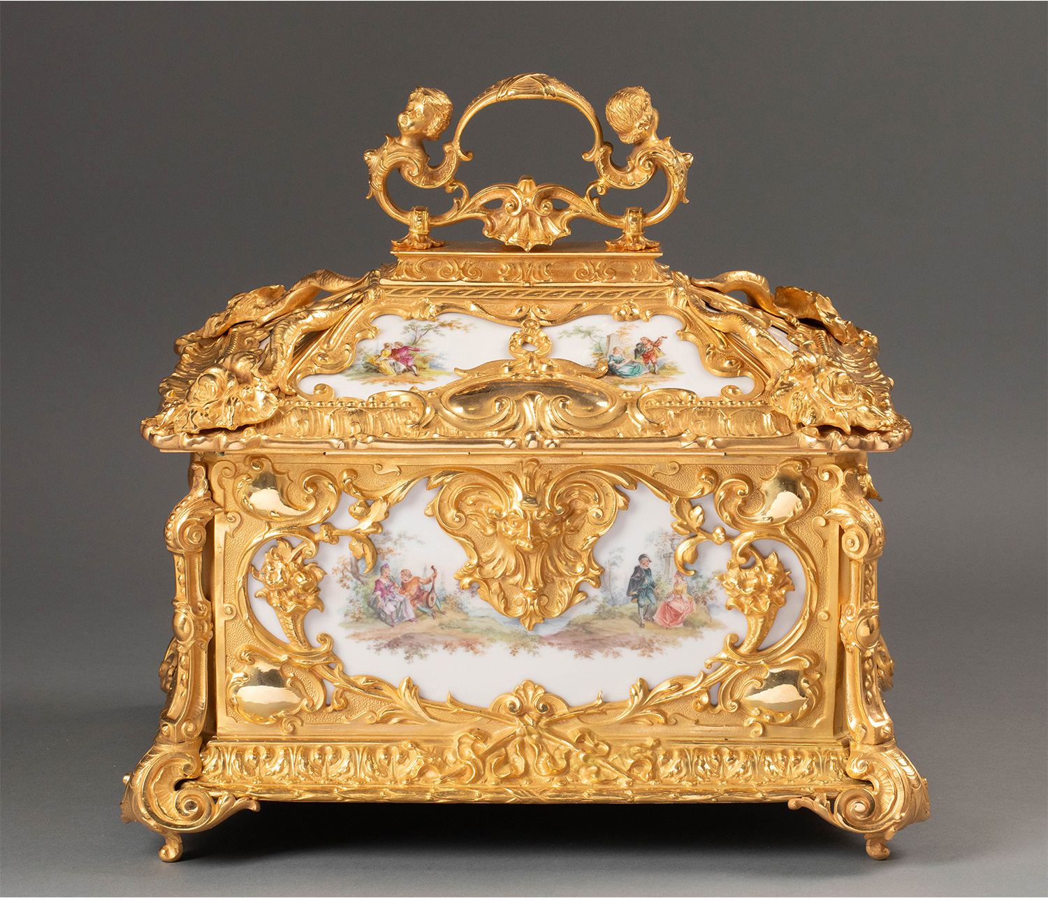 19世纪下半叶法国出品路易十五风格天使卷叶纹铜鎏金精雕装饰田园恋歌主题瓷面画珍宝盒