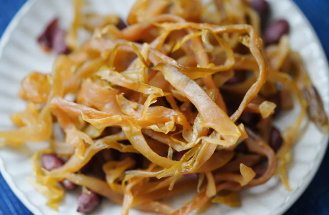 经过多道工序,烘干之后的笋丝成品,颜色就会自然变深,营养成分都锁到了这细长条的笋丝中间。