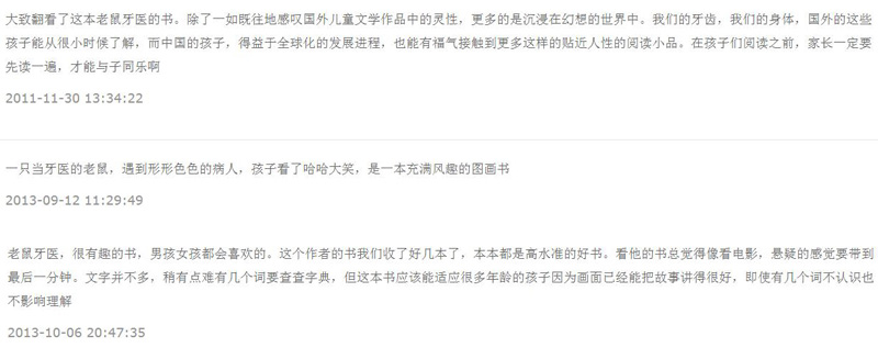 大致翻看了这本老鼠牙医的书。除了一如既往地感叹国外儿童文学作品中的灵性,更多的是沉浸在幻想的世界中。我们的牙齿,我们的身体,国外的这些孩子能从很小时候了解,而中国的孩子,得益于全球化的发展进程,也能有福气接触到更多这样的贴近人性的阅读小品。在孩子们阅读之前,家长一定要先读一遍,才能与子同乐啊