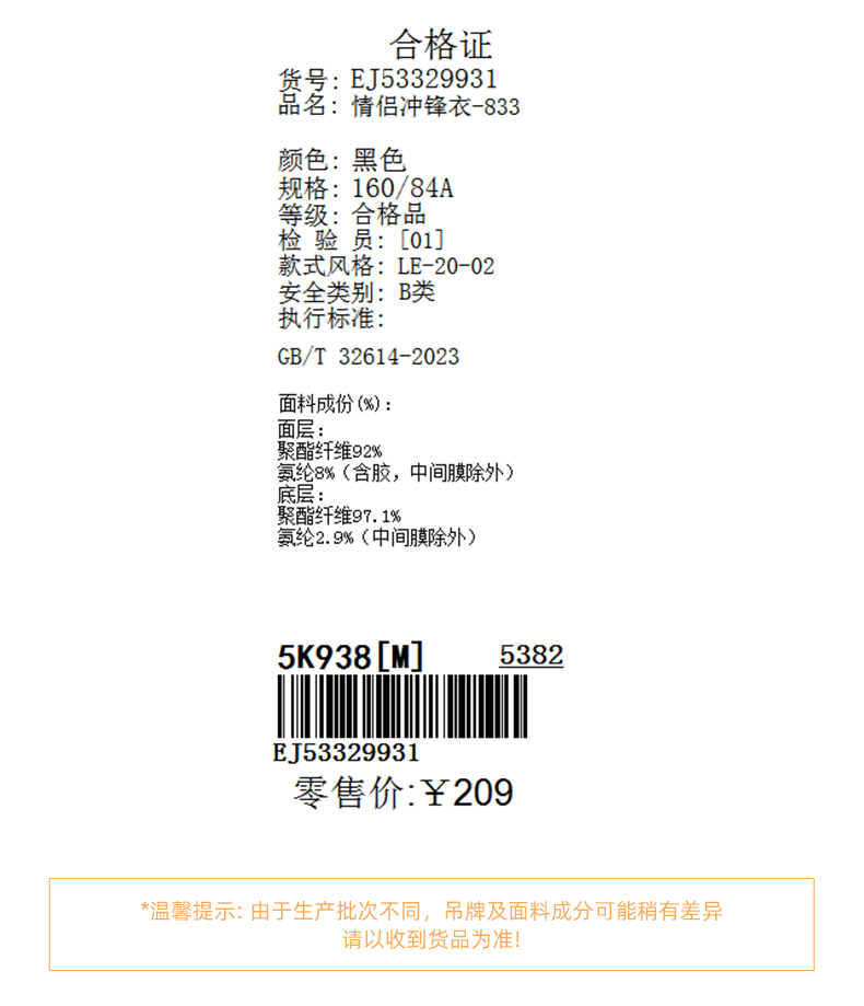 情侣装加绒冲锋衣-833J5332993