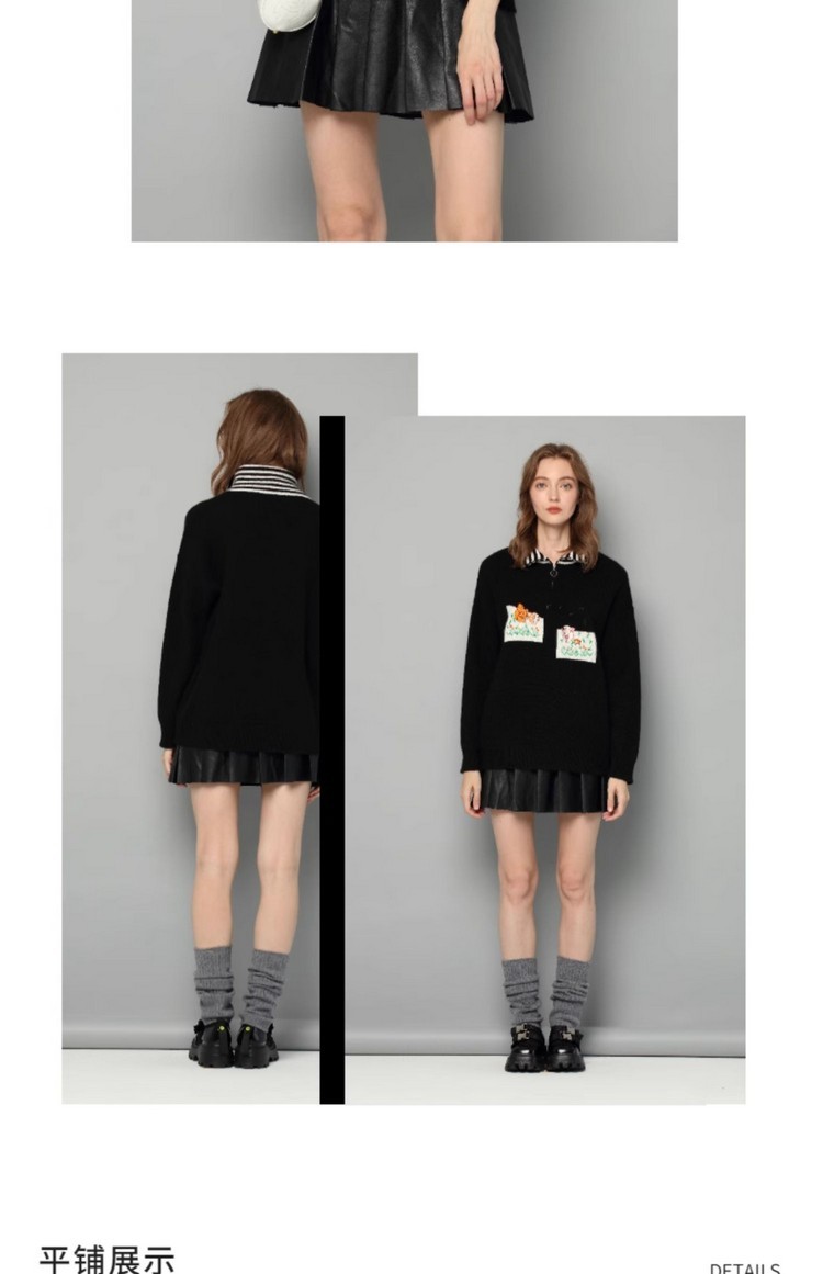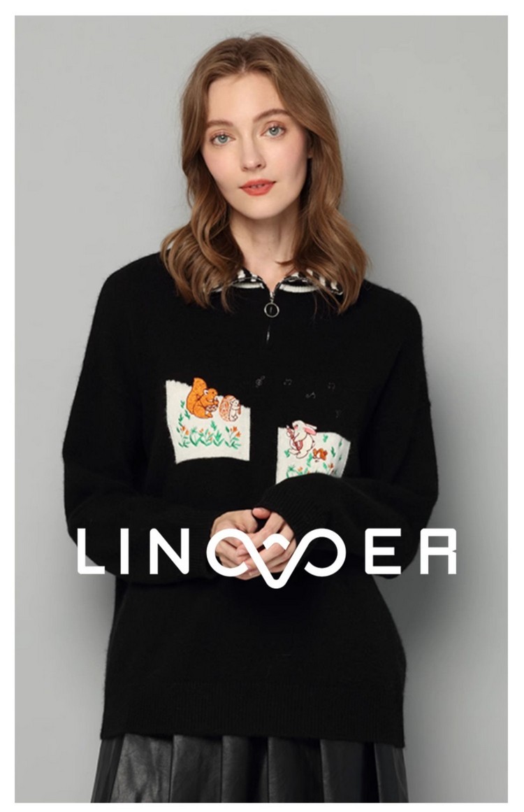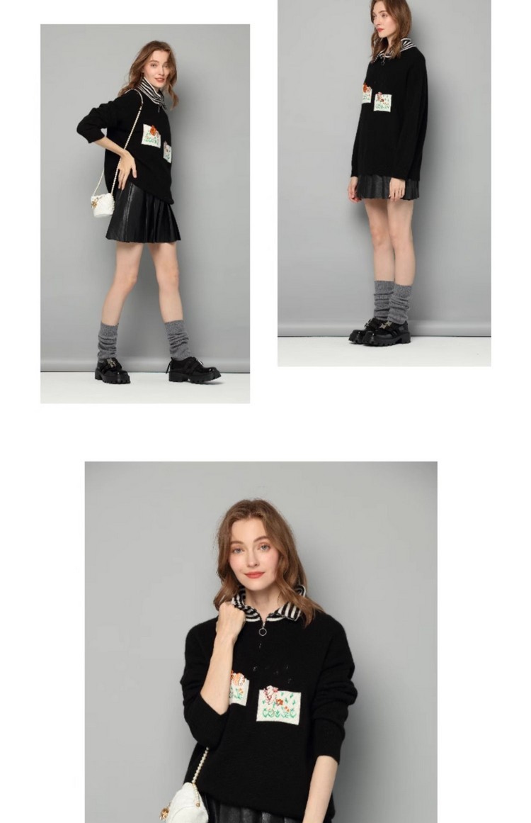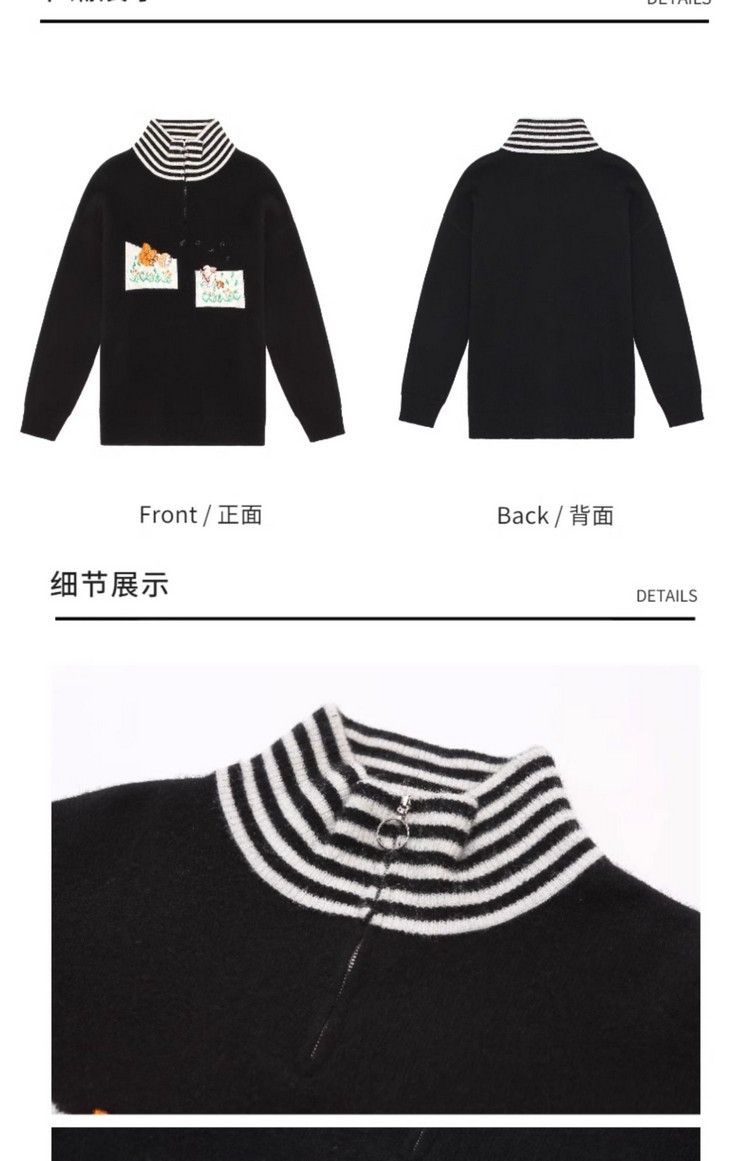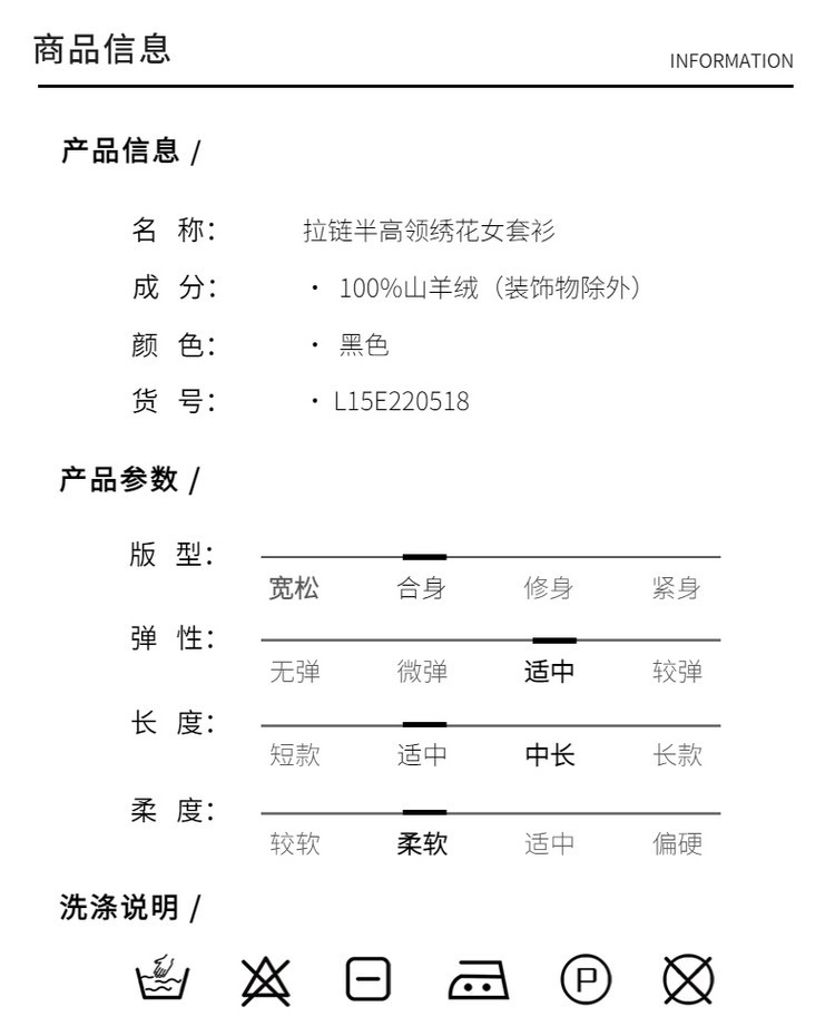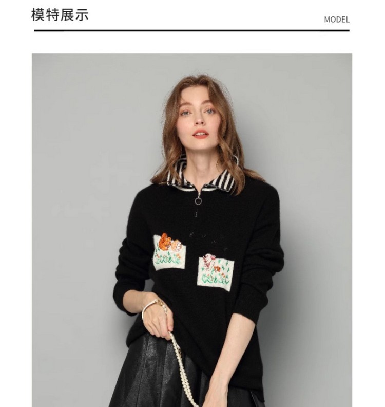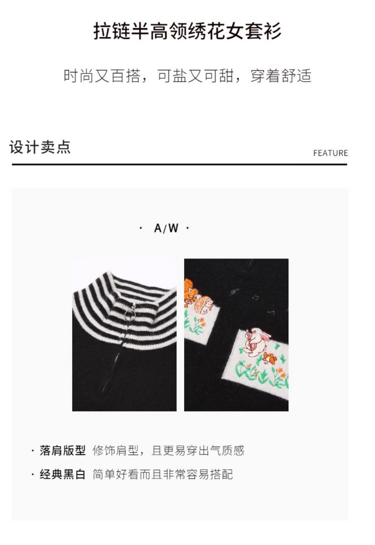 羚荌渼拉链半高领绣花落肩版型女羊绒衫