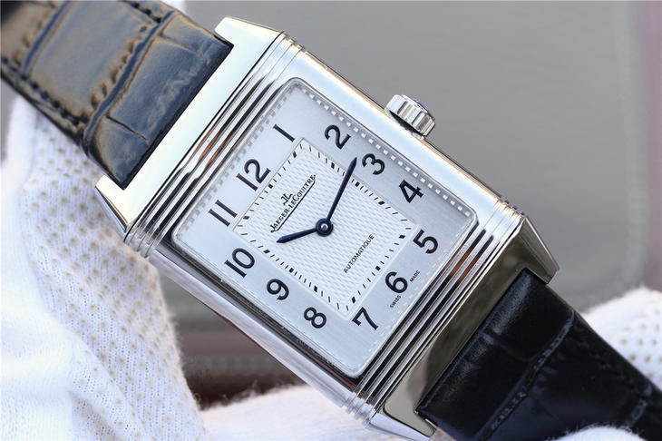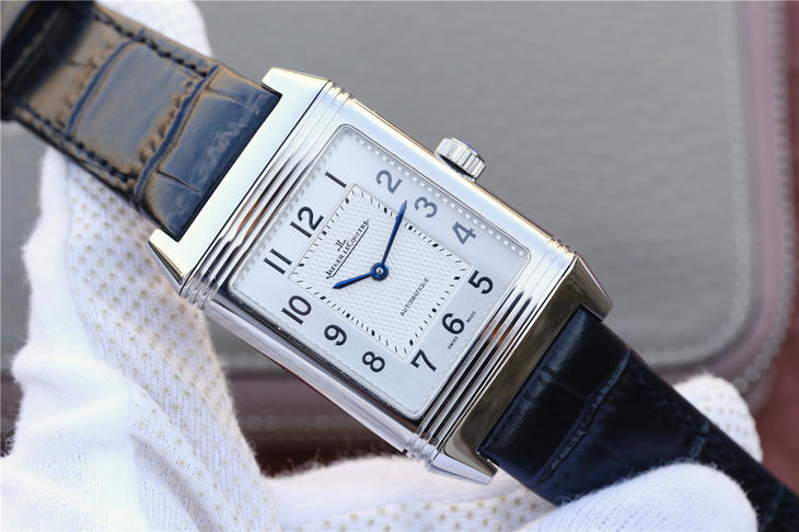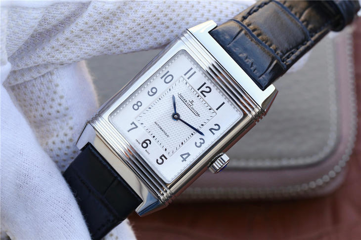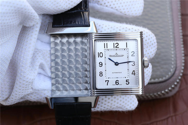 积家翻转系列Reverso腕表,表背可翻转至正面,让背面表盘的精密机械零件一览无余,彰显个性,突破常规的传统表盘。搭载原版复刻机芯,316精钢的几何外形表壳,刻有装饰刻纹,表背具有手动打造的鱼鳞纹饰。黄金分割比例尺寸48.5×30mm,意大利小牛皮表带搭配原装折叠扣,镜面采用高通透蓝宝石玻璃,直体阿拉伯数学表盘是积家weiyi的标志性腕表!矩形可翻转的特点是你优雅时尚风格的象征
