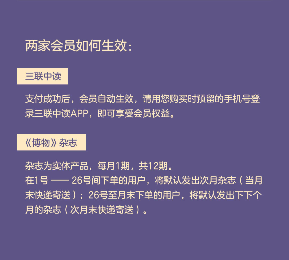 《博物》杂志发货:在1号-26号间下单的用户,将默认发出次月杂志(当月末快递寄送);26号至月末下单的用户,将默认发出下下个月的杂志(次月末快递寄送)。