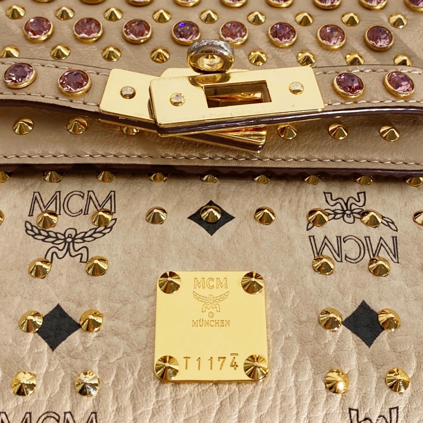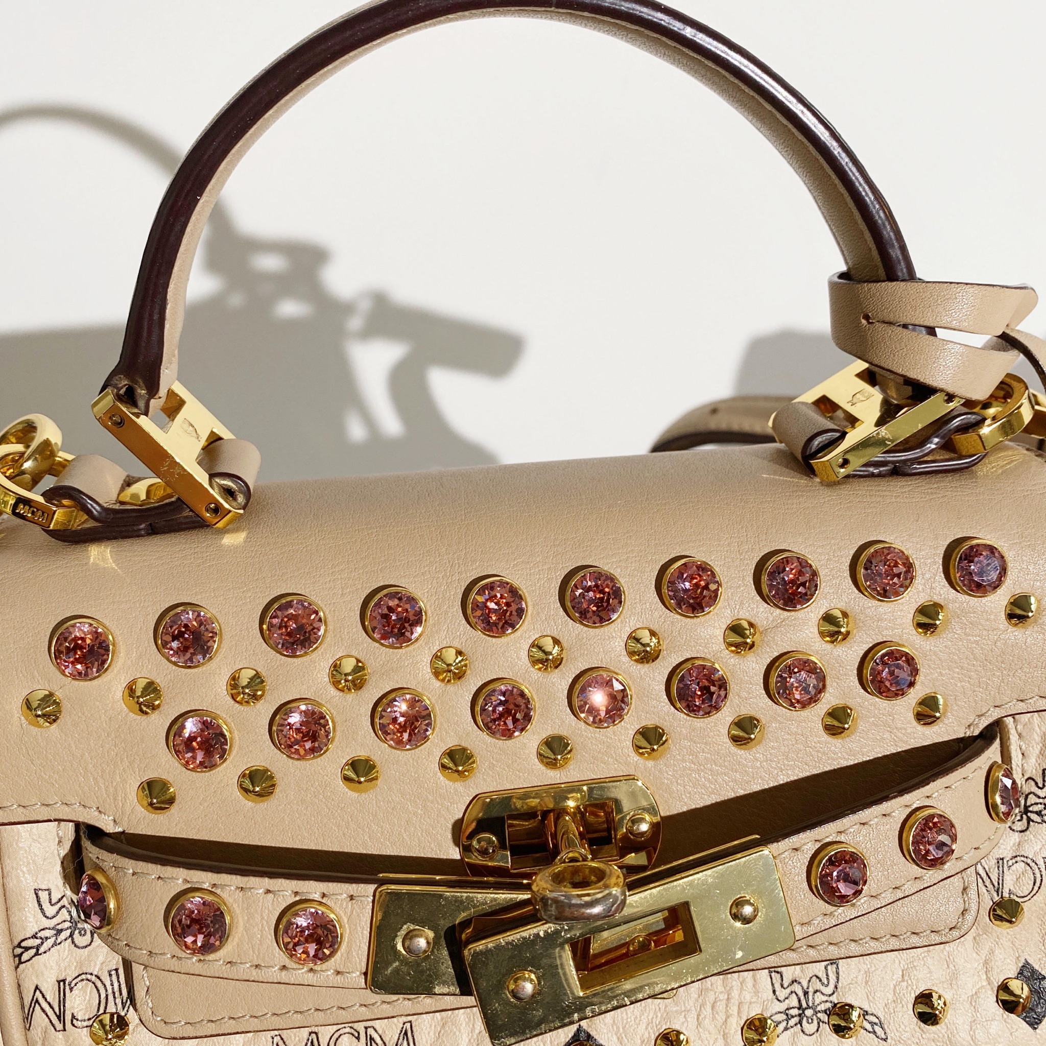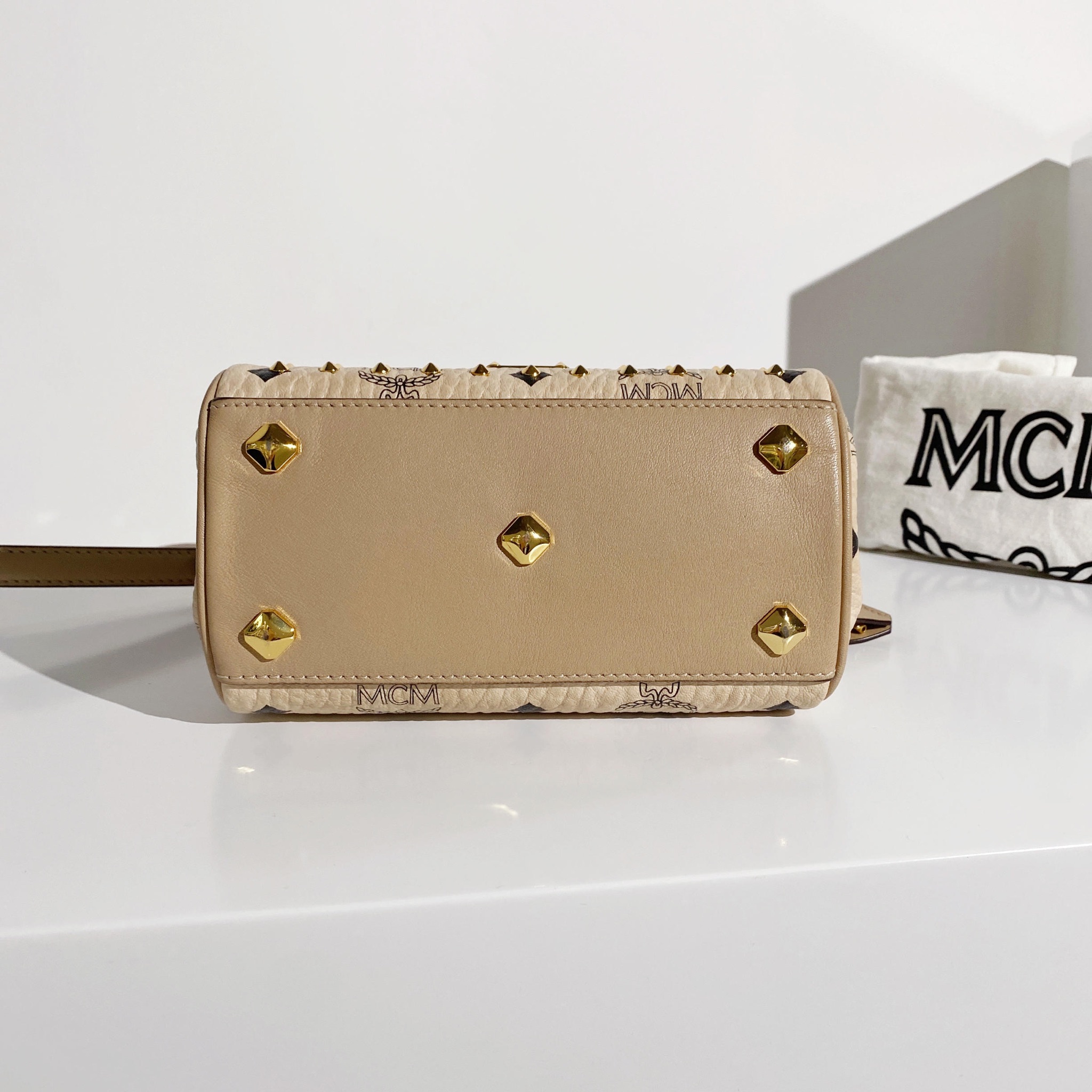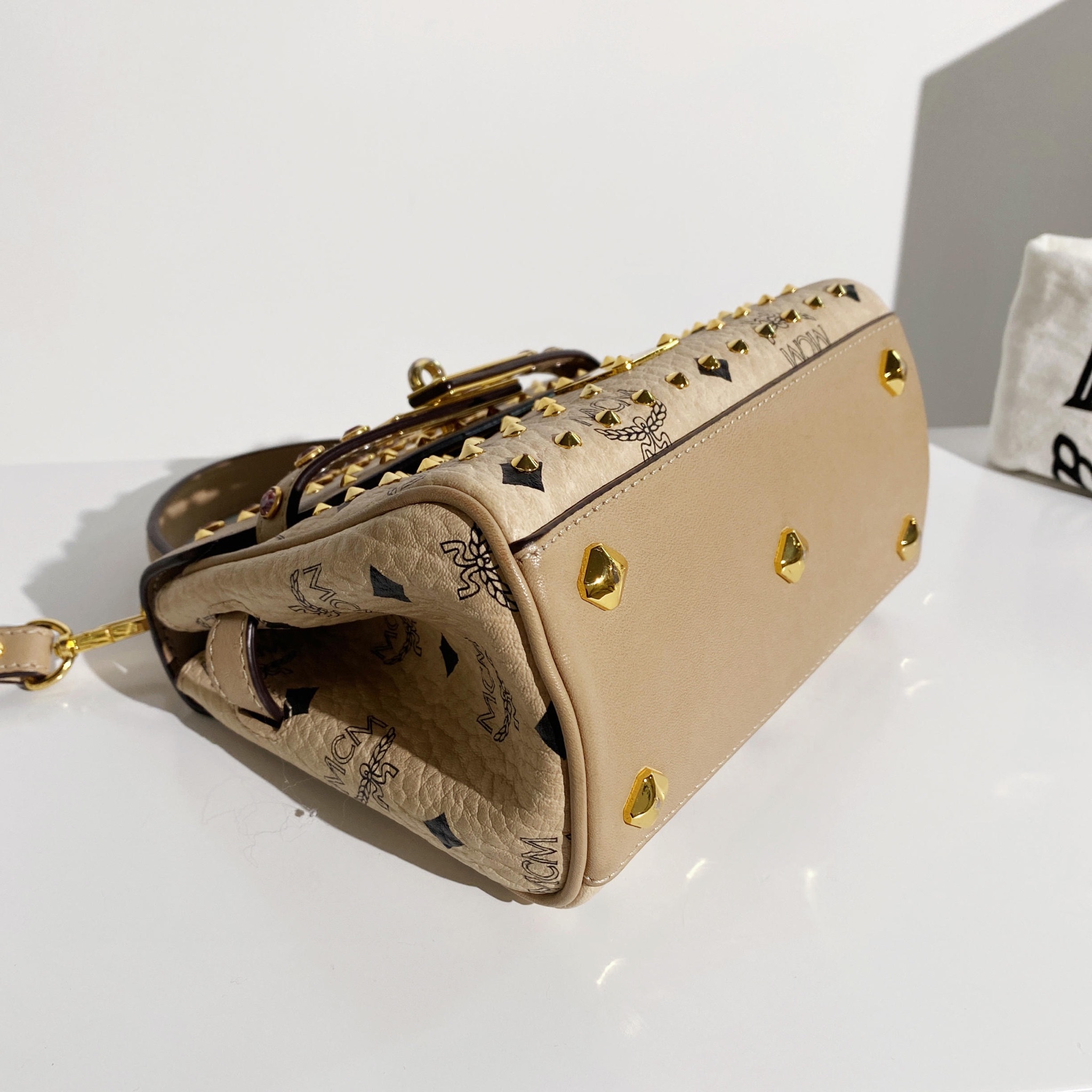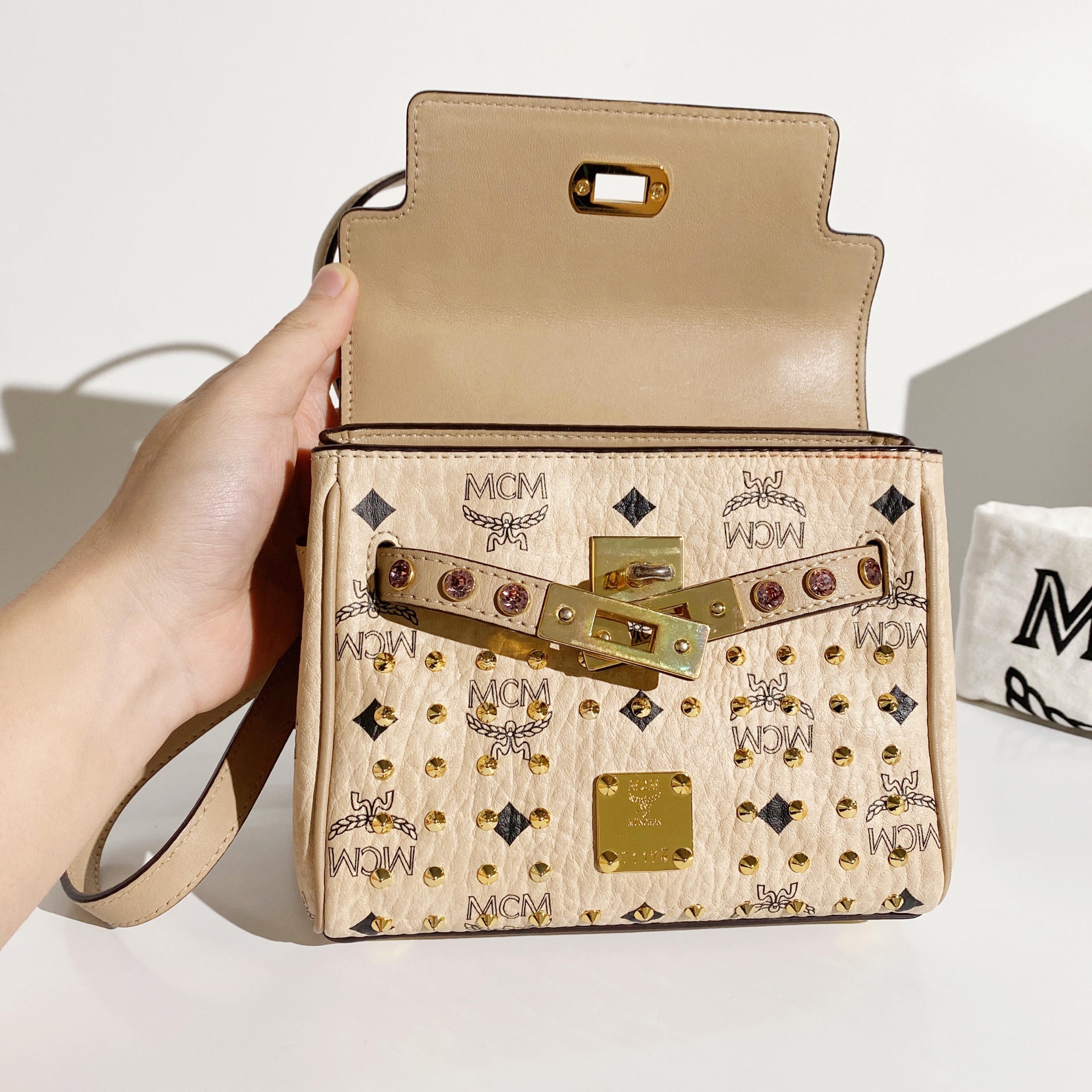 【商品描述】 正品二手 MCM 奶茶色铆钉碎钻牛皮 Kelly 斜挎包🧡97新 19×15 配件:钥匙、肩带、防尘袋。缺锁碎钻完好扣子轻微使用痕迹🌸大气儒雅,时尚女神