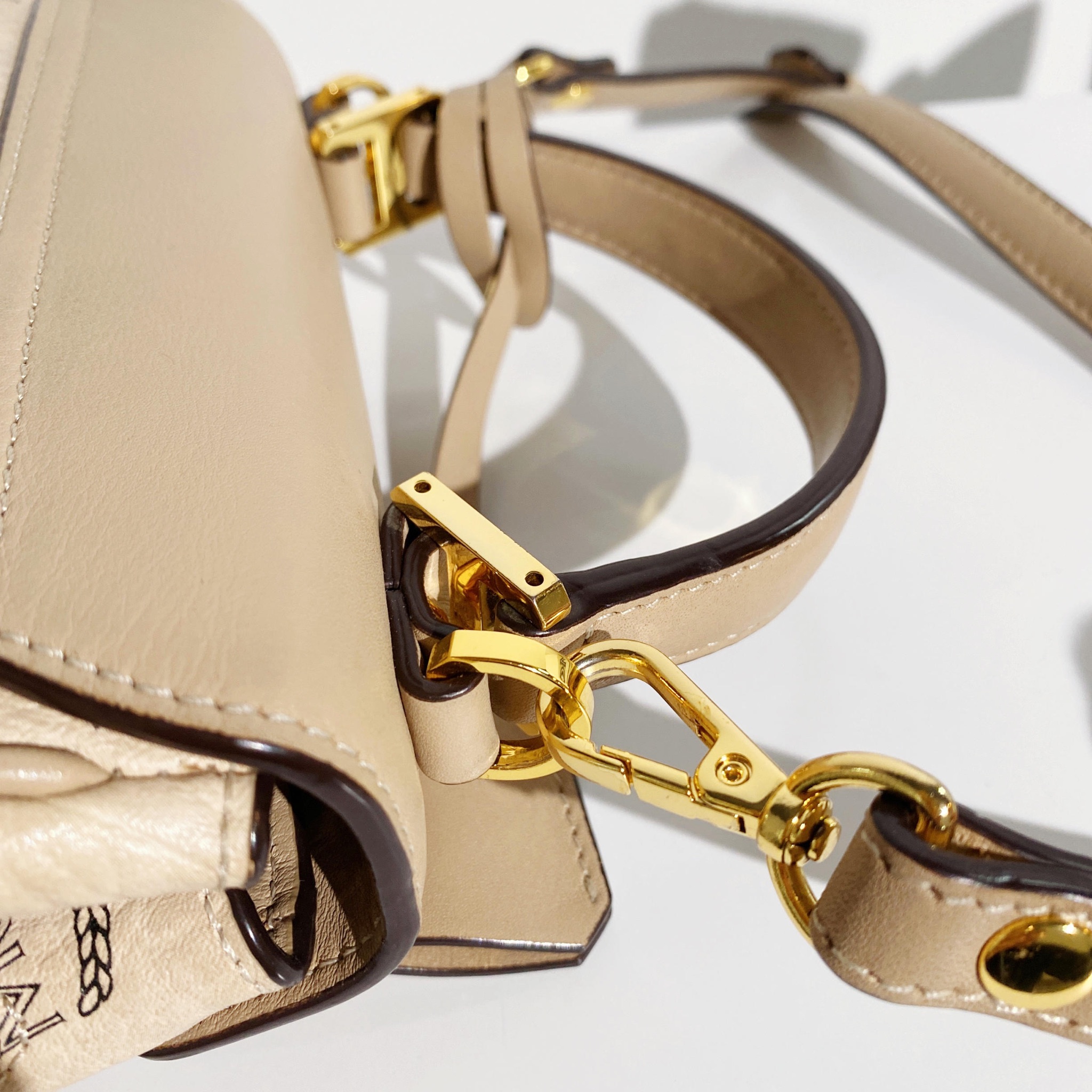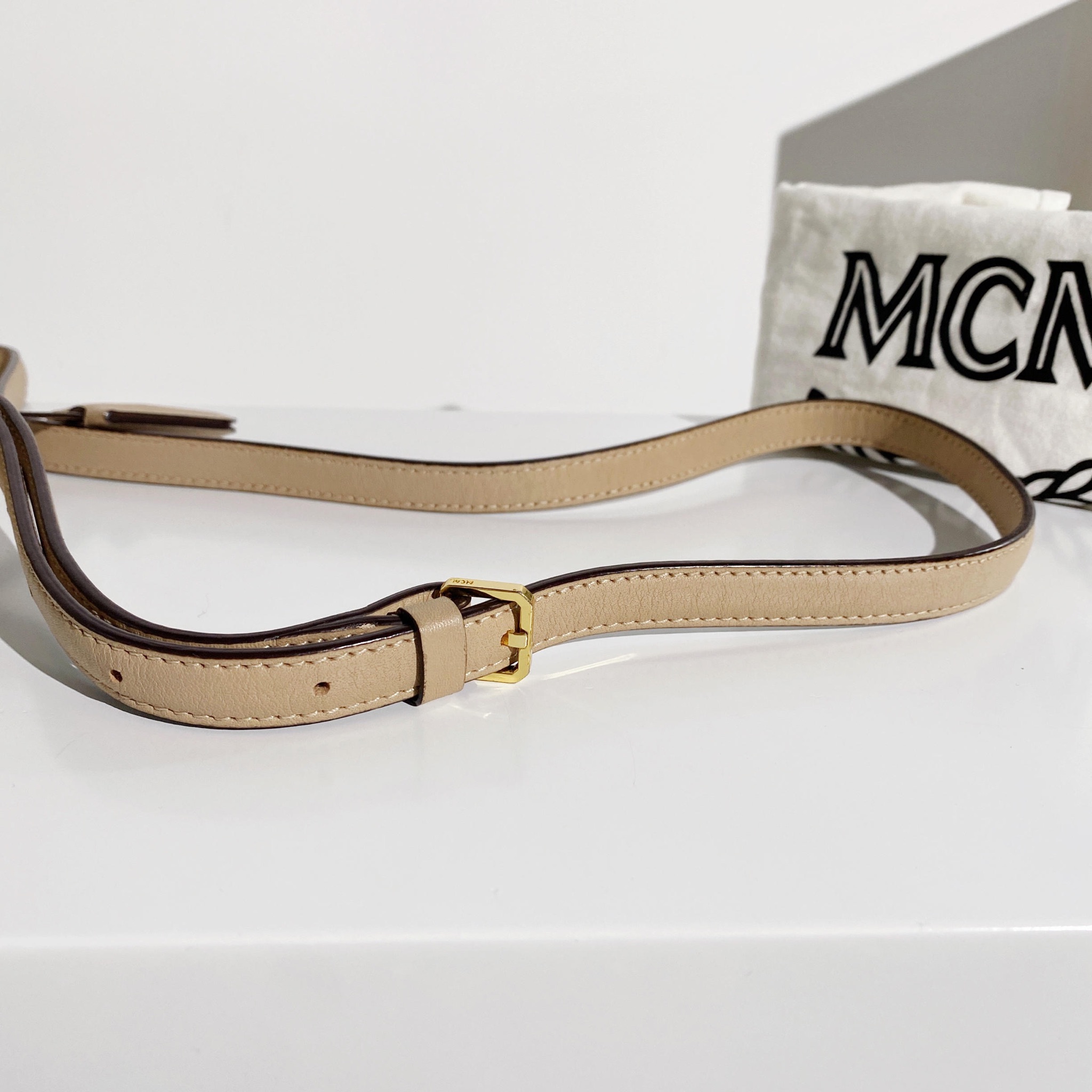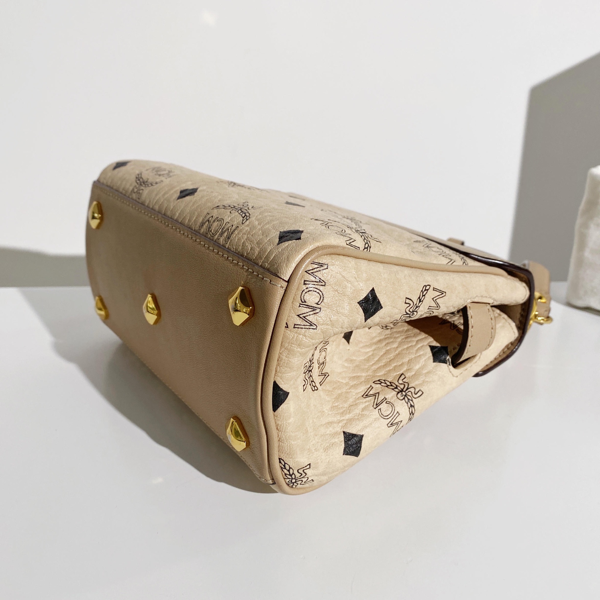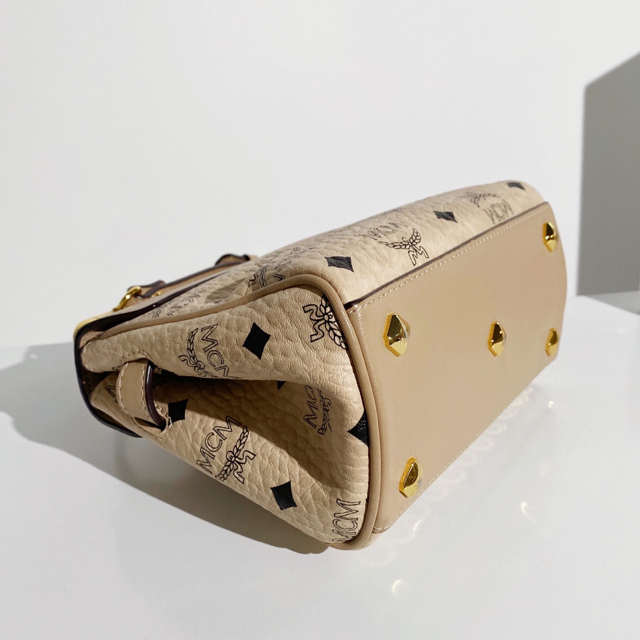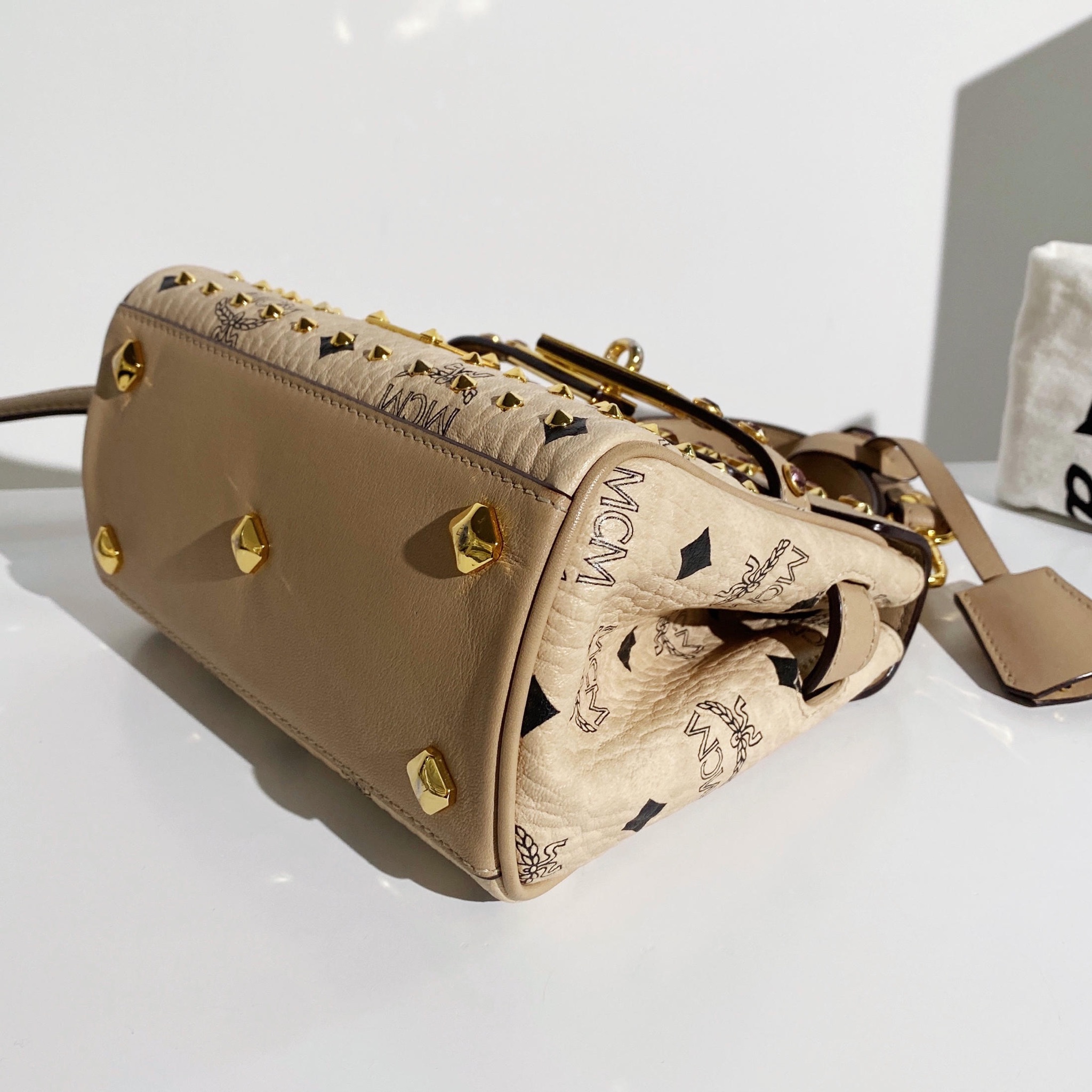 【商品描述】 正品二手 MCM 奶茶色铆钉碎钻牛皮 Kelly 斜挎包🧡97新 19×15 配件:钥匙、肩带、防尘袋。缺锁碎钻完好扣子轻微使用痕迹🌸大气儒雅,时尚女神