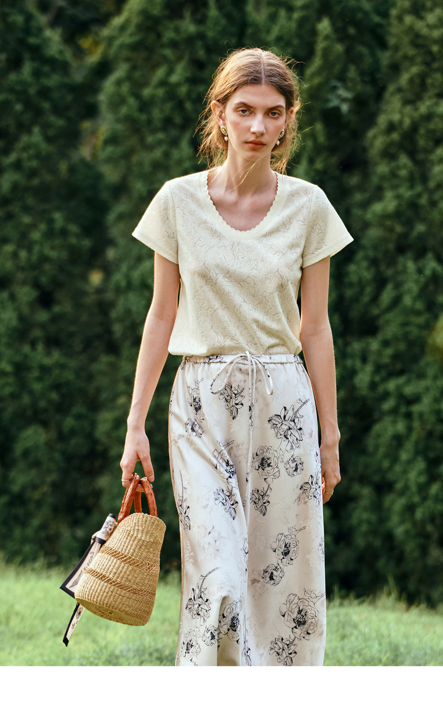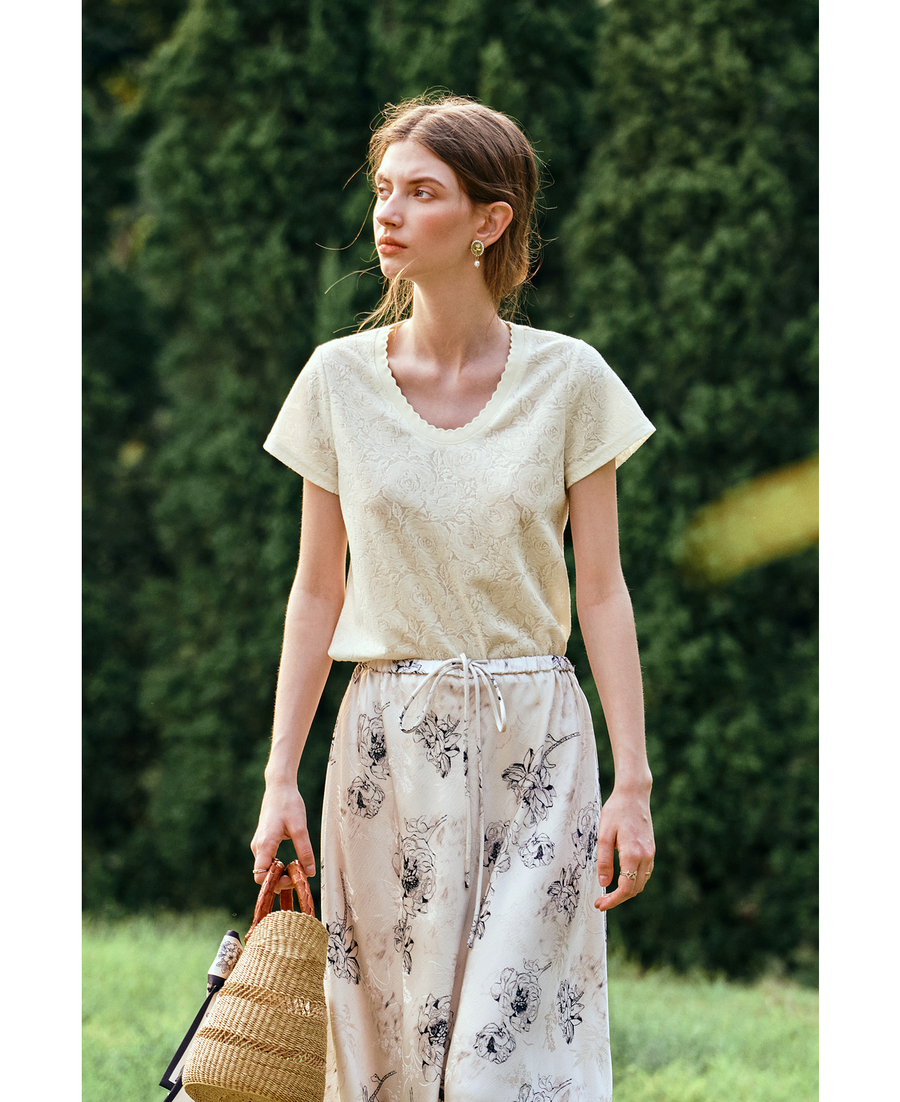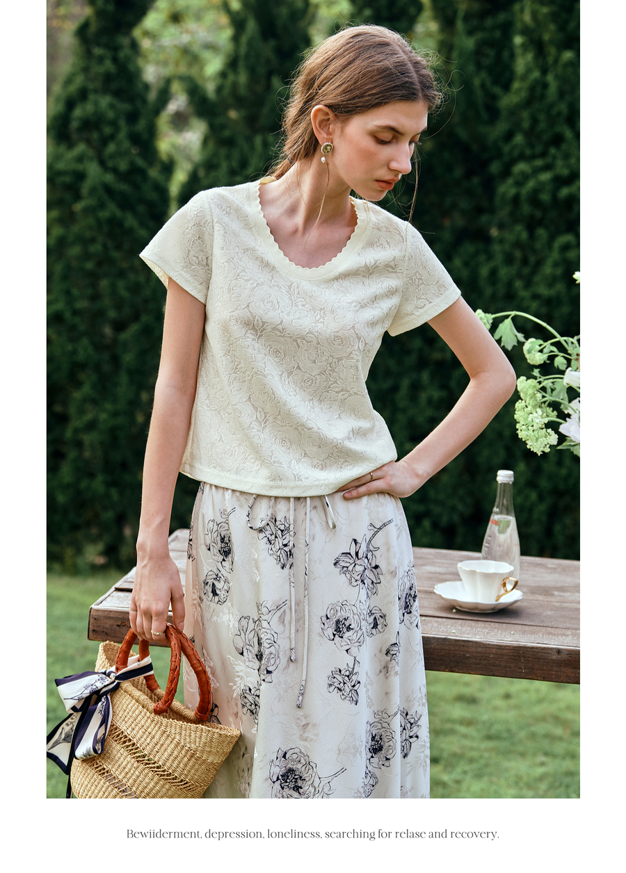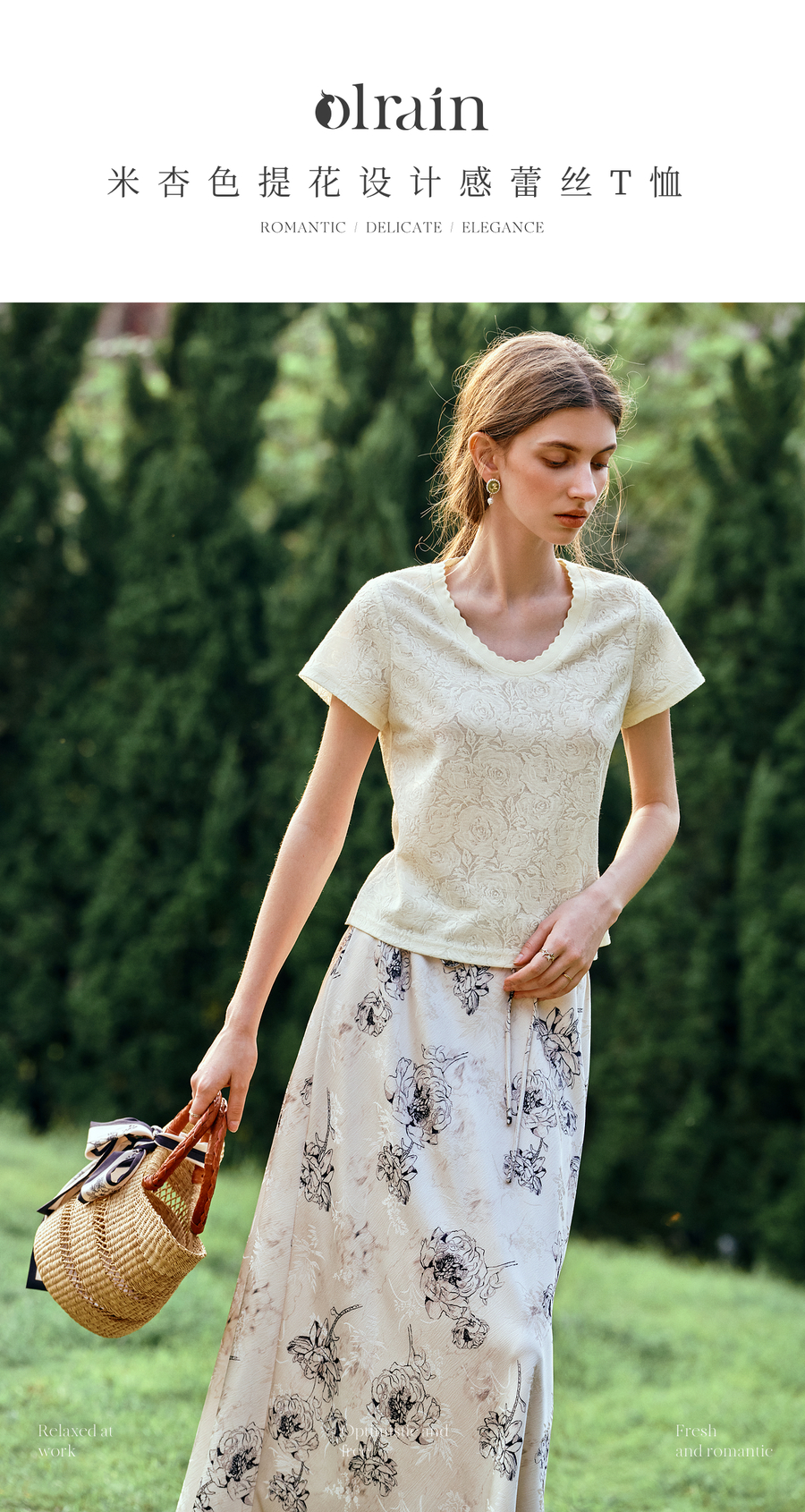 OLrain欧芮儿米杏色提花设计感蕾丝T恤夏季2025新款修身显瘦上衣