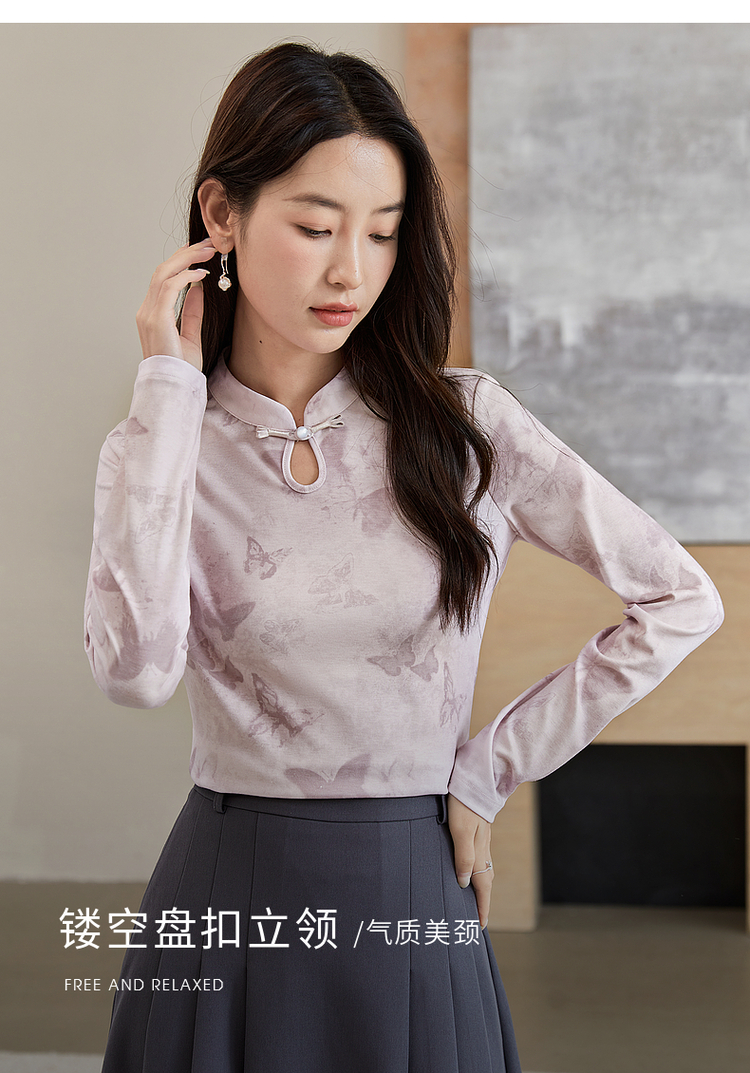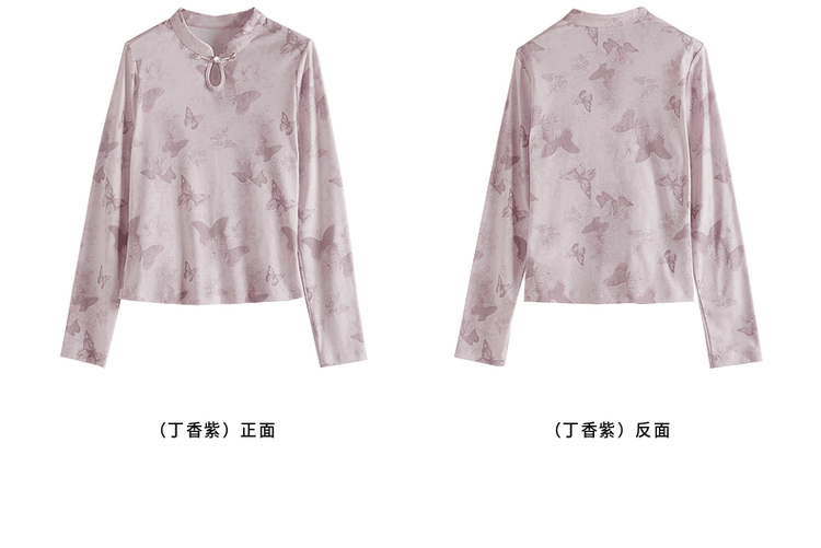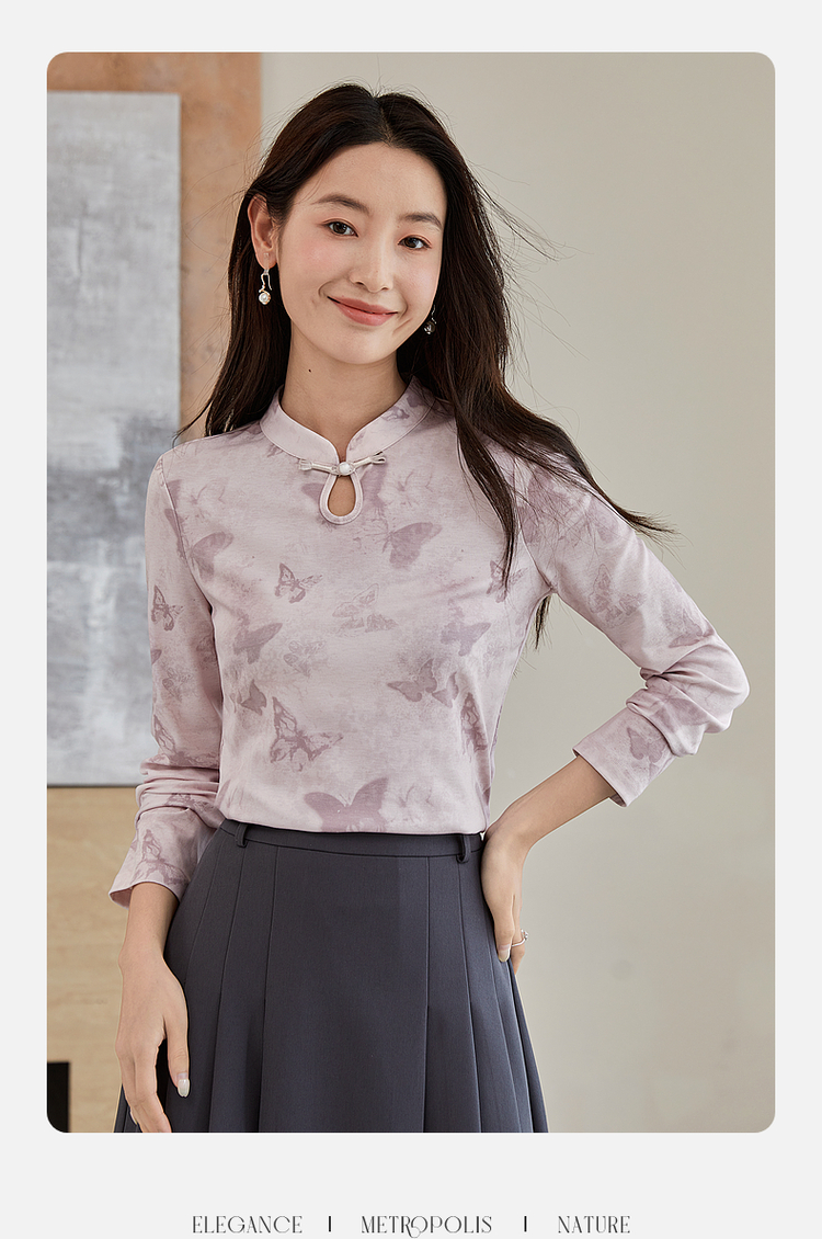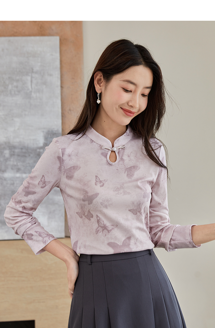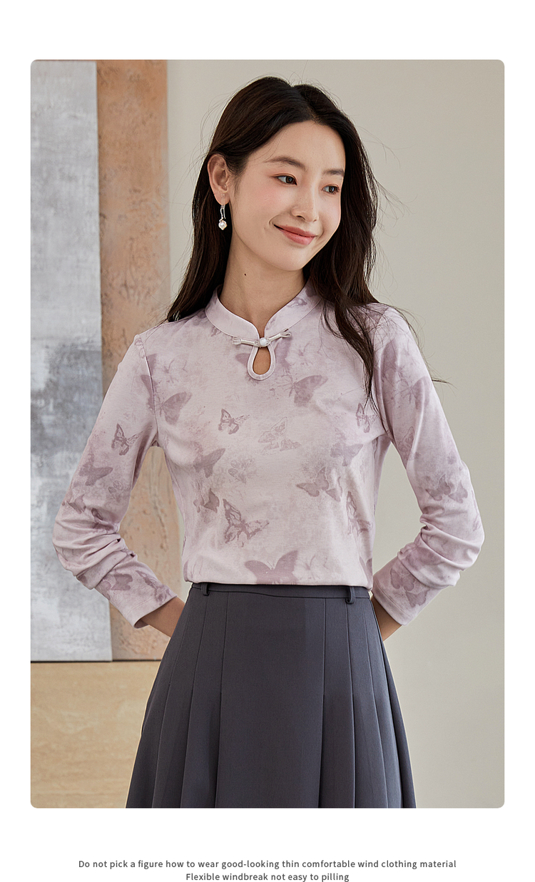 【年终特卖】熙世界国风新中式水墨蝴蝶印花T恤长袖盘扣立领上衣2025秋新款