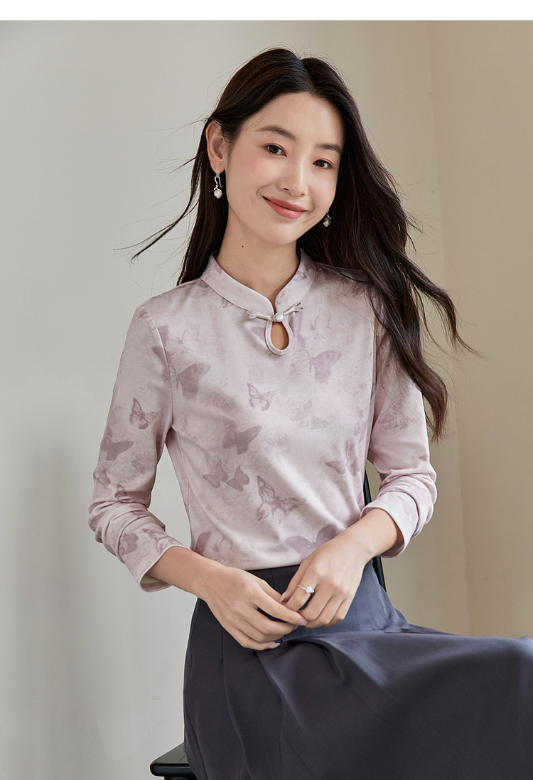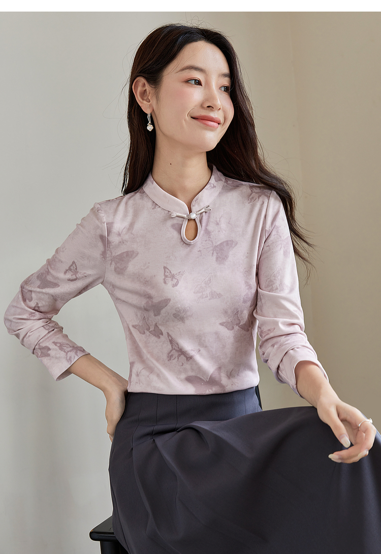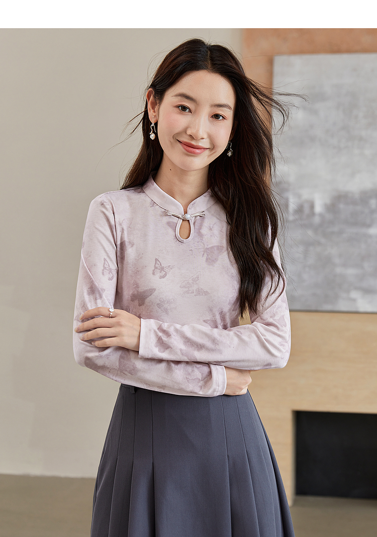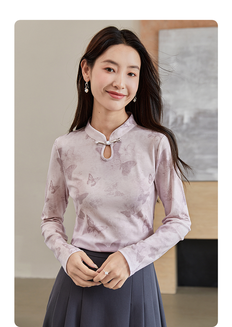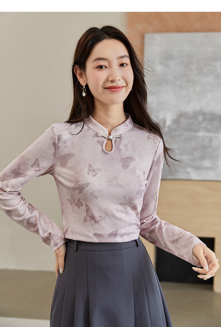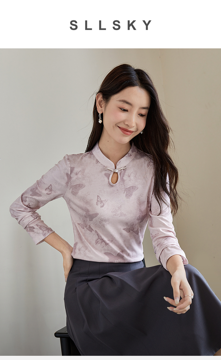 【年终特卖】熙世界国风新中式水墨蝴蝶印花T恤长袖盘扣立领上衣2025秋新款