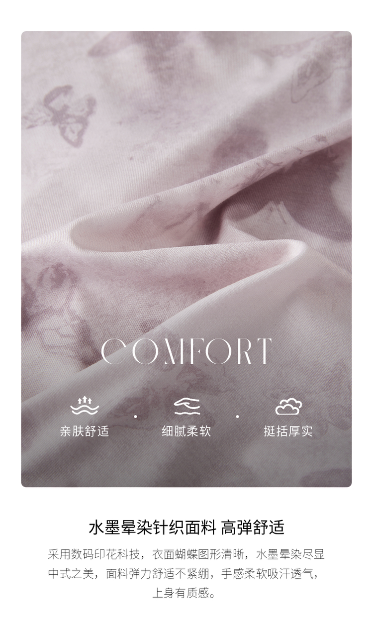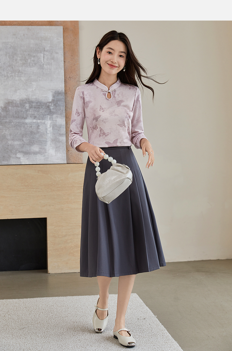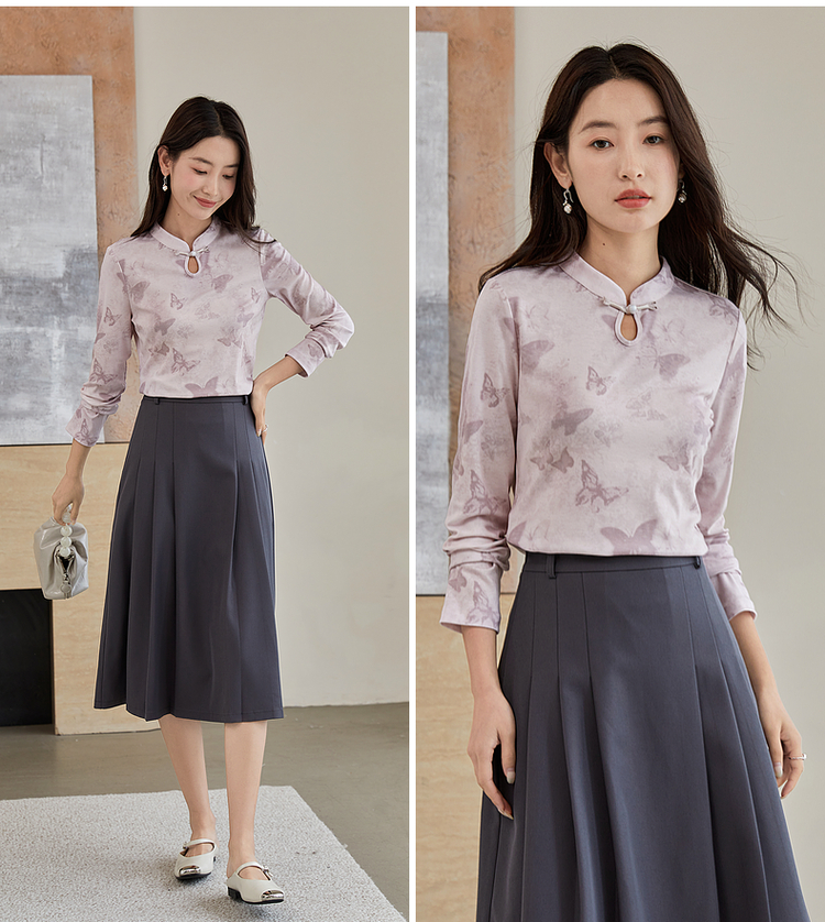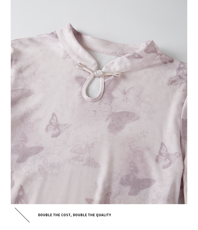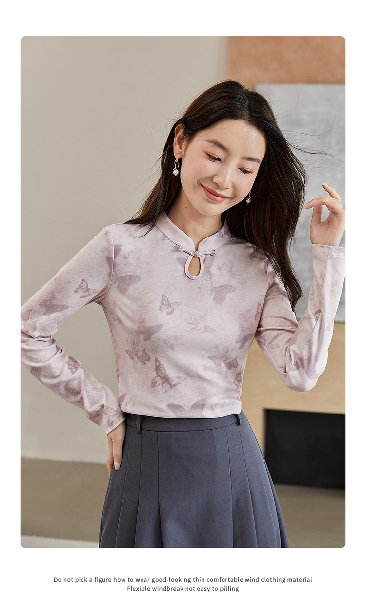 【年终特卖】熙世界国风新中式水墨蝴蝶印花T恤长袖盘扣立领上衣2025秋新款