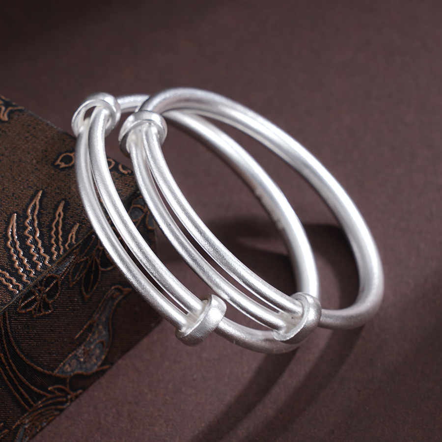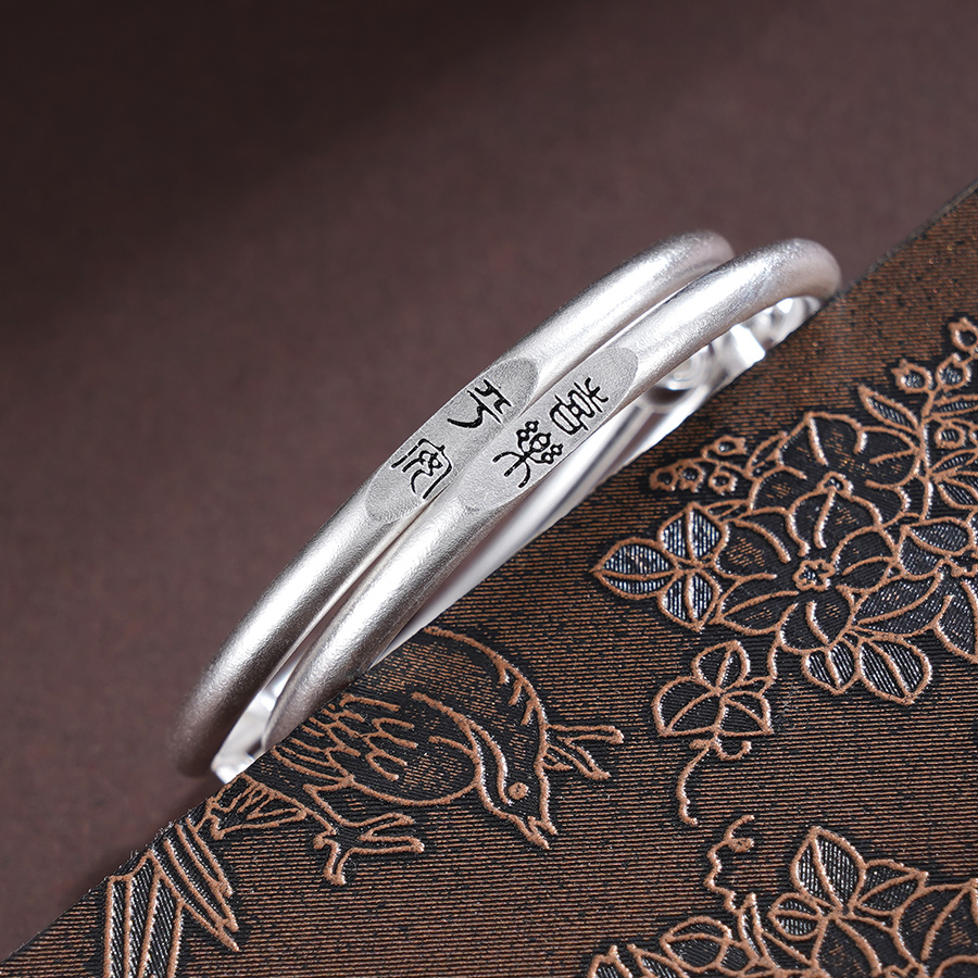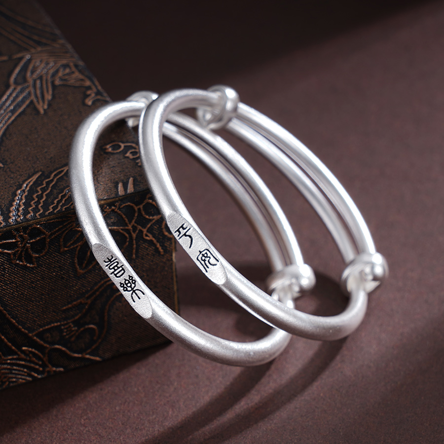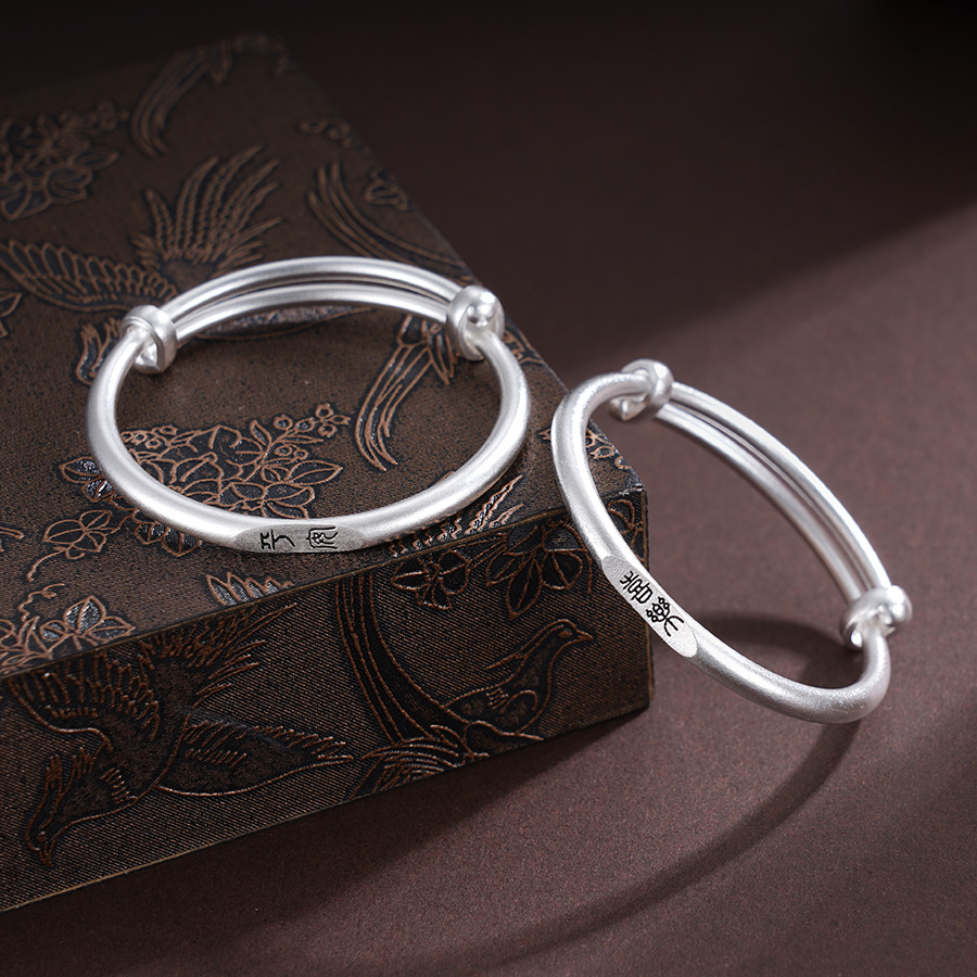 【寓意】:纯银哑光童镯,镯面錾刻古文字“平安喜乐”,寓意平安喜乐常相随。推拉可调节设计,宝宝轻松佩戴,福泽安康。