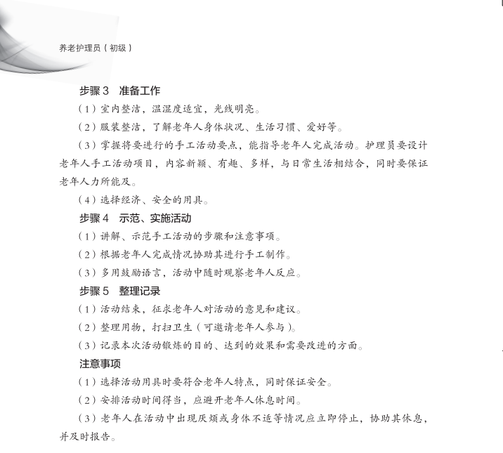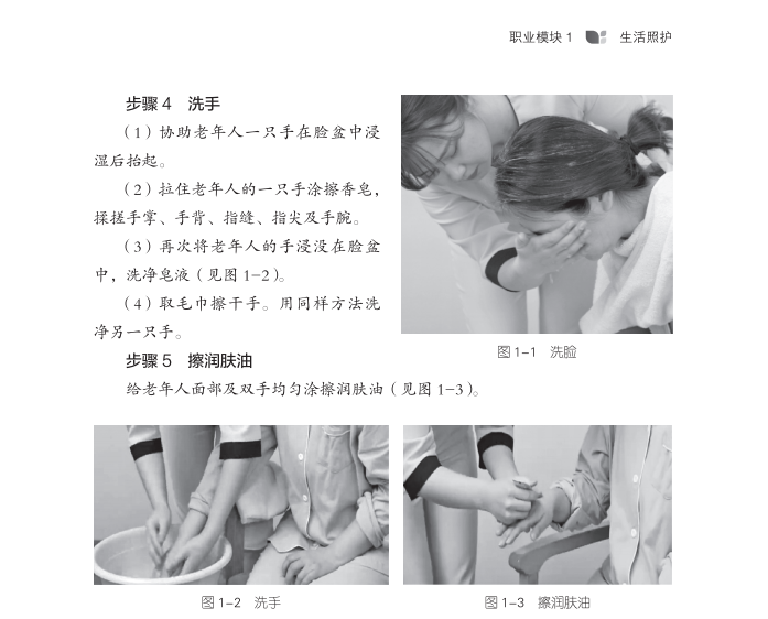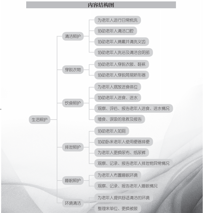 本书是养老护理员等级教材中的一本, 是职业技能等级认定推荐教材, 也是职业技能等级认定题库开发的重要依据, 已纳入国家基本职业培训包教材资源, 适用于职业技能等级认定培训和中短期职业技能培训。本书在编写过程中得到全国卫生职业教育教学指导委员会、 全国民政职业教育教学指导委员会、 解放军总医院、 北京大学医学部医大时代教育发展中心、兰州大学护理学院、 青岛长期照护协会、 北京老年医院、 北京市第一福利院、北京社会管理职业学院、 天津城市职业学院、 北京协力人口与社会发展研究所、广东省社会福利服务中心、 北京中民福祉教育科技有限责任公司、 共好福报( 北京) 养老科技有限公司、 山东颐合华龄养老咨询有限公司等单位的大力支持与协助, 在此一并表示衷心感谢。