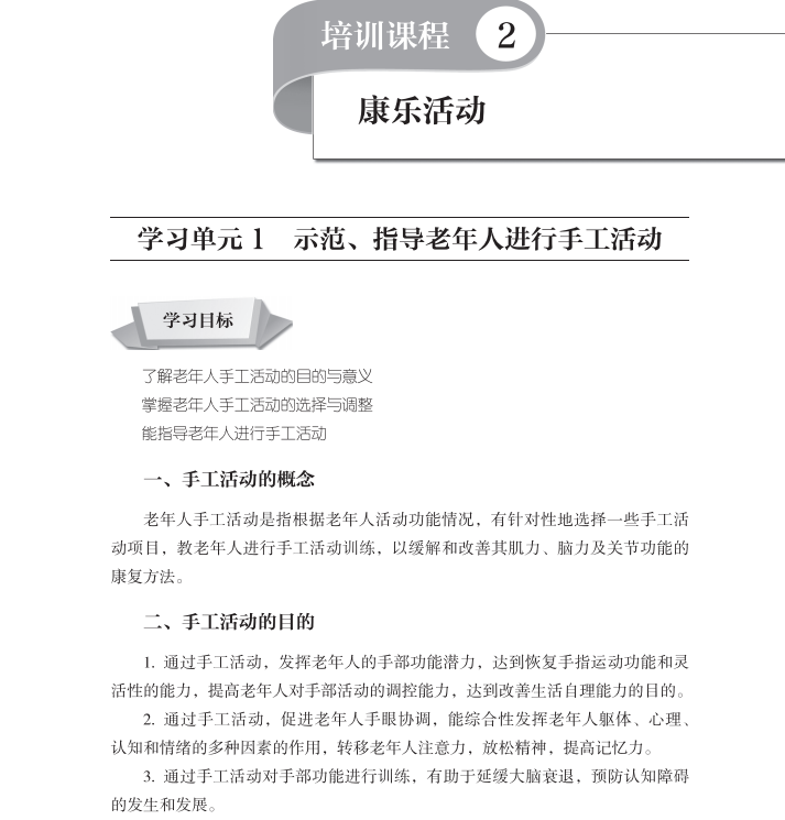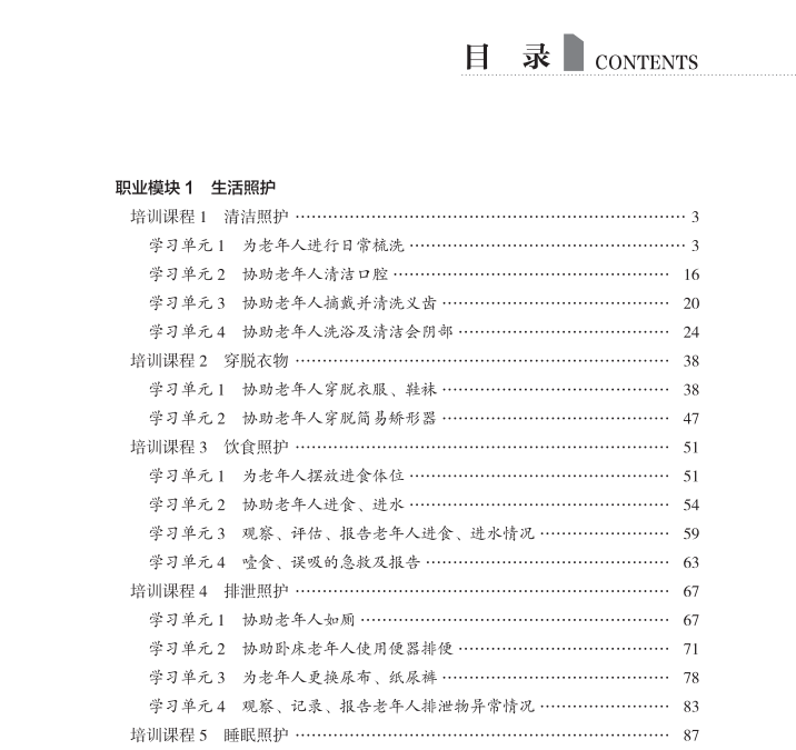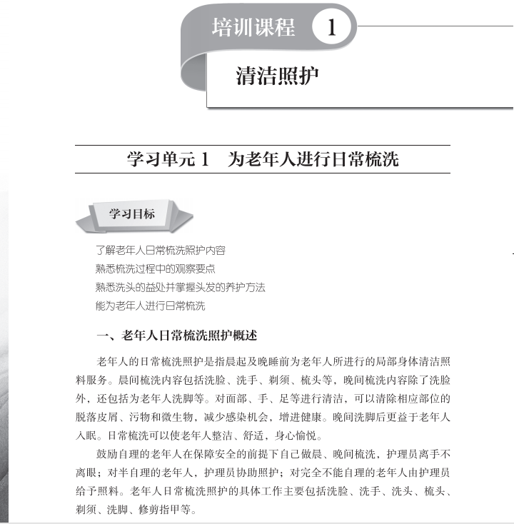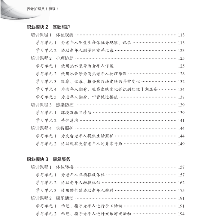 为加快建立劳动者终身职业技能培训制度, 大力实施职业技能提升行动,全面推行职业技能等级制度, 推进技能人才评价制度改革, 促进国家基本职业培训包制度与职业技能等级认定制度的有效衔接, 进一步规范培训管理, 提高培训质量, 人力资源社会保障部教材办公室组织有关专家在《养老护理员国家职业技能标准》( 以下简称《 标准》) 和国家基本职业培训包( 以下简称培训包)制定工作基础上, 编写了养老护理员国家职业技能等级认定培训系列教材( 以下简称等级教材)。养老护理员等级教材紧贴《 标准》 和培训包要求编写, 内容上突出职业能力优先的编写原则, 结构上按照职业功能模块分级别编写。 该等级教材共包括《 养老护理员( 基础知识)》《 养老护理员( 初级)》《 养老护理员( 中级)》《 养老护理员( 高级)》《 养老护理员( 技师? 高级技师)》5 本。《 养老护理员( 基础知识)》 是各级别养老护理员均需掌握的基础知识, 其他各级别教材内容分别包括各级别养老护理员应掌握的理论知识和操作技能。