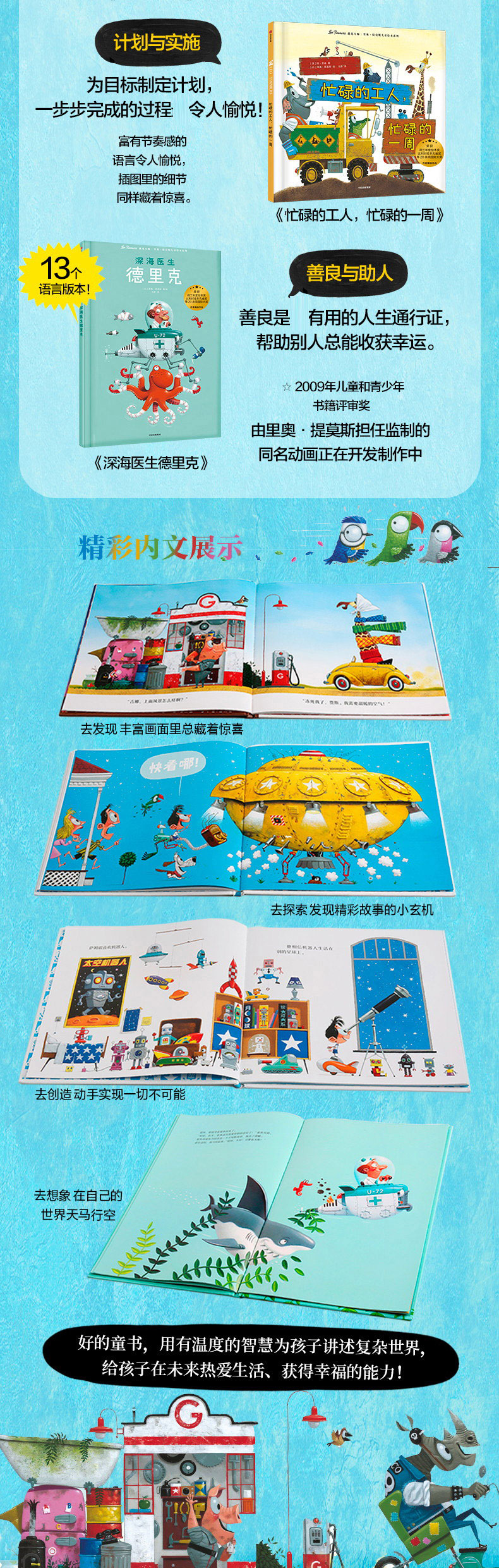 《遇见大师:里奥·提莫斯儿童绘本系列》收录了7个关于梦想与心灵成长的故事,分别是《贾斯的修车厂》《哈里的新家》《我居住的小镇》《机器人弗兰奇》《彩色的乌鸦》《深海医生德里克》《忙碌的工人,忙碌的一周》。系列绘本囊括欧洲多项大奖,部分作品被译成25种语言畅销16个国家,出版后便不断登上各类推荐榜单。其中,《深海医生德里克》同名动画正在制作中。