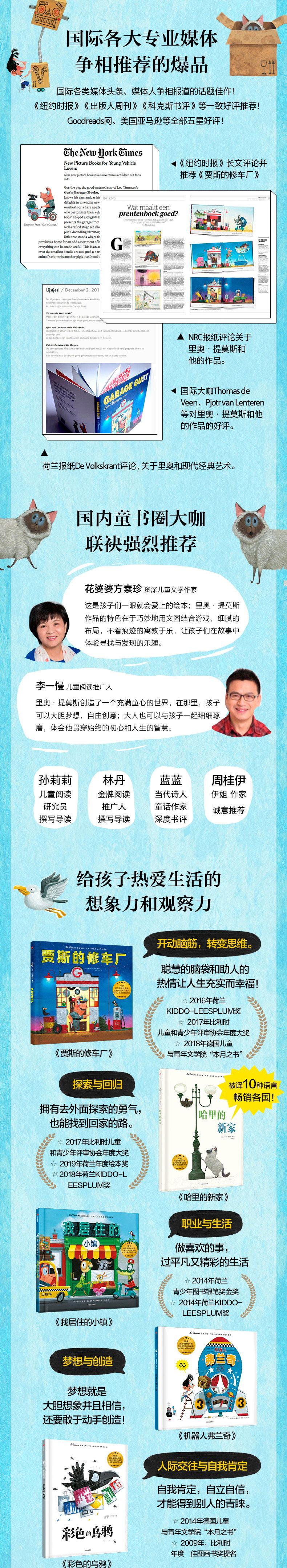 “贾斯的车库外面少了什么?”“机器人弗兰奇身上的部件是用什么做的?”“乌鸦在模仿哪一只鸟?”……提莫斯的作品非常适合亲子共读,每一页都可以提出很多有趣的问题,而答案就隐藏在画面中。引导孩子观察,发现线索,找到答案,这就是阅读里奥·提莫斯作品的乐趣。