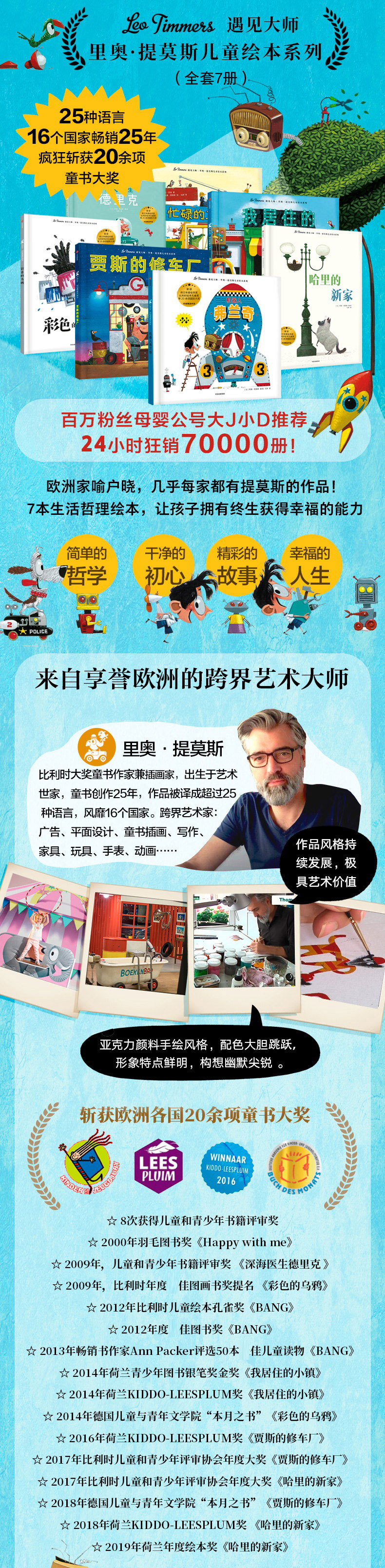 里奥·提莫斯于1970年出生于艺术世家,是比利时童书作家兼插画家,也是欧洲颇具影响力的跨界艺术家。涉及的领域横跨广告、平面设计、童书插画、写作、画展、家具、玩具、手表、动画等,在童书创作上的成就尤其显著。他深受艺术家父亲影响,11岁出版*一部作品,创作25年,收获近20项文学、插画类大奖,作品被译为25种语言畅销16个国家。有孩子的地方,就有提莫斯!他是风靡欧洲的帅气大叔!