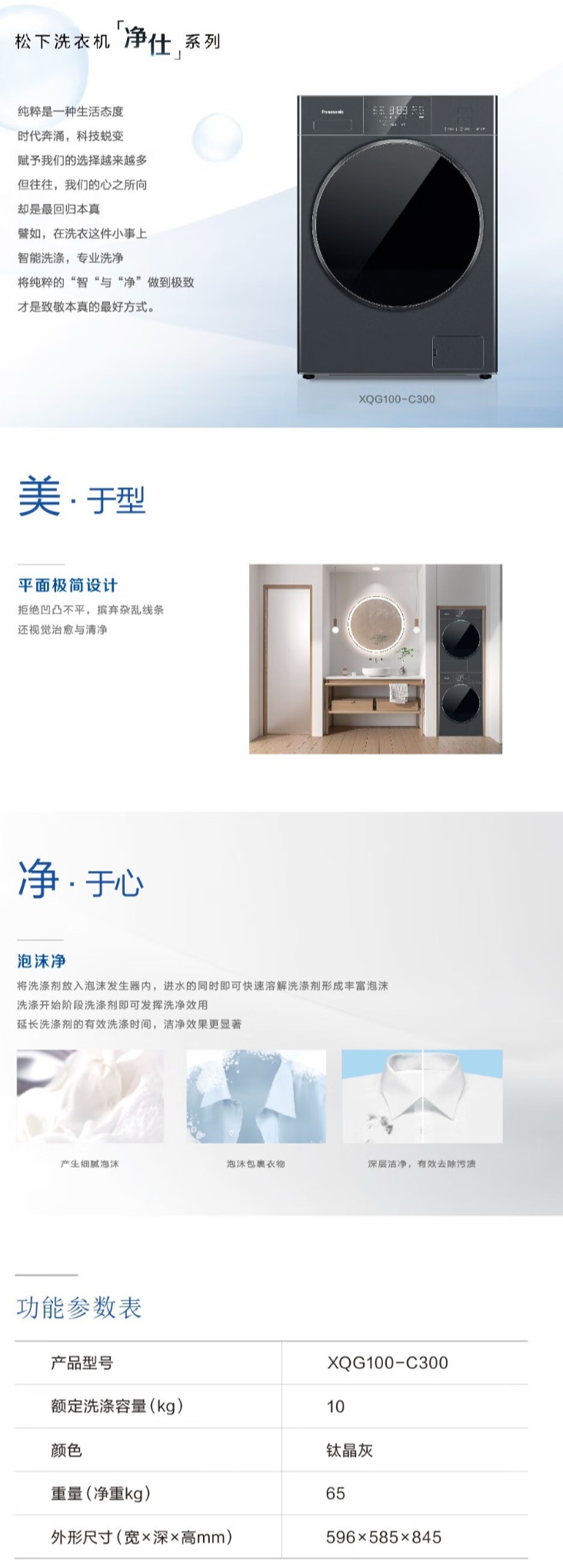 松下 洗衣机 XQG100-C300 10KG 滚筒 变频 一级能效 纯平嵌入 不锈钢内筒