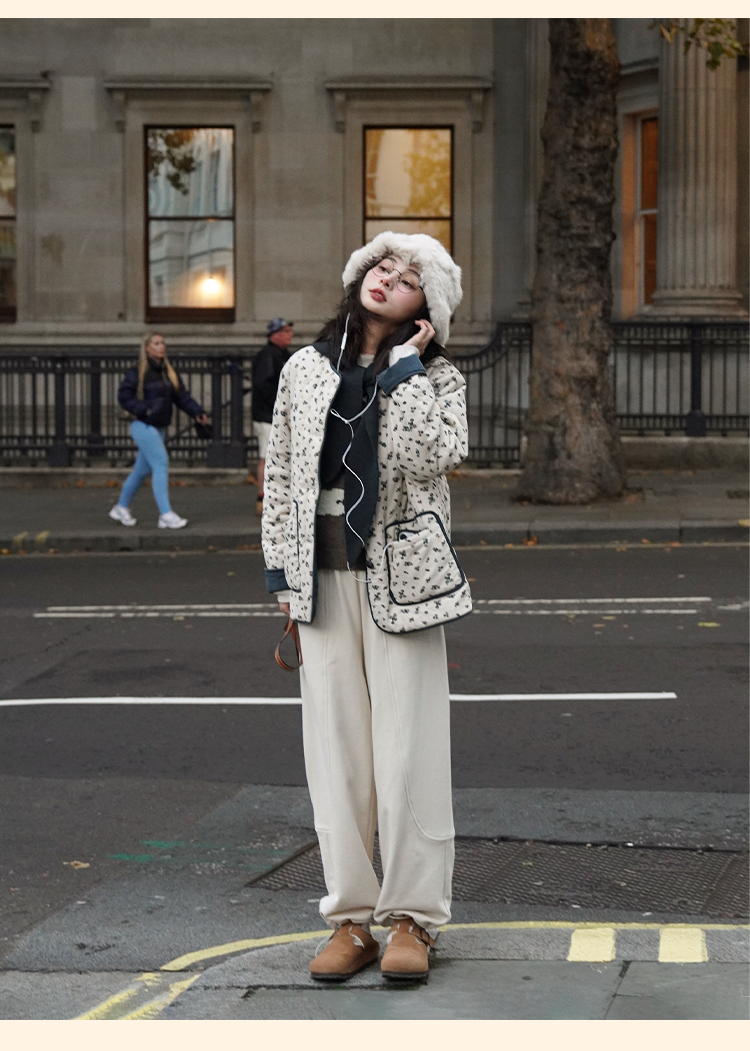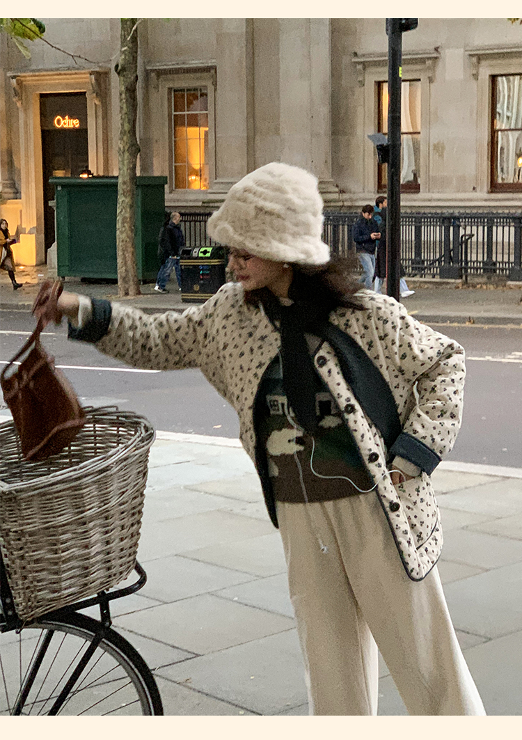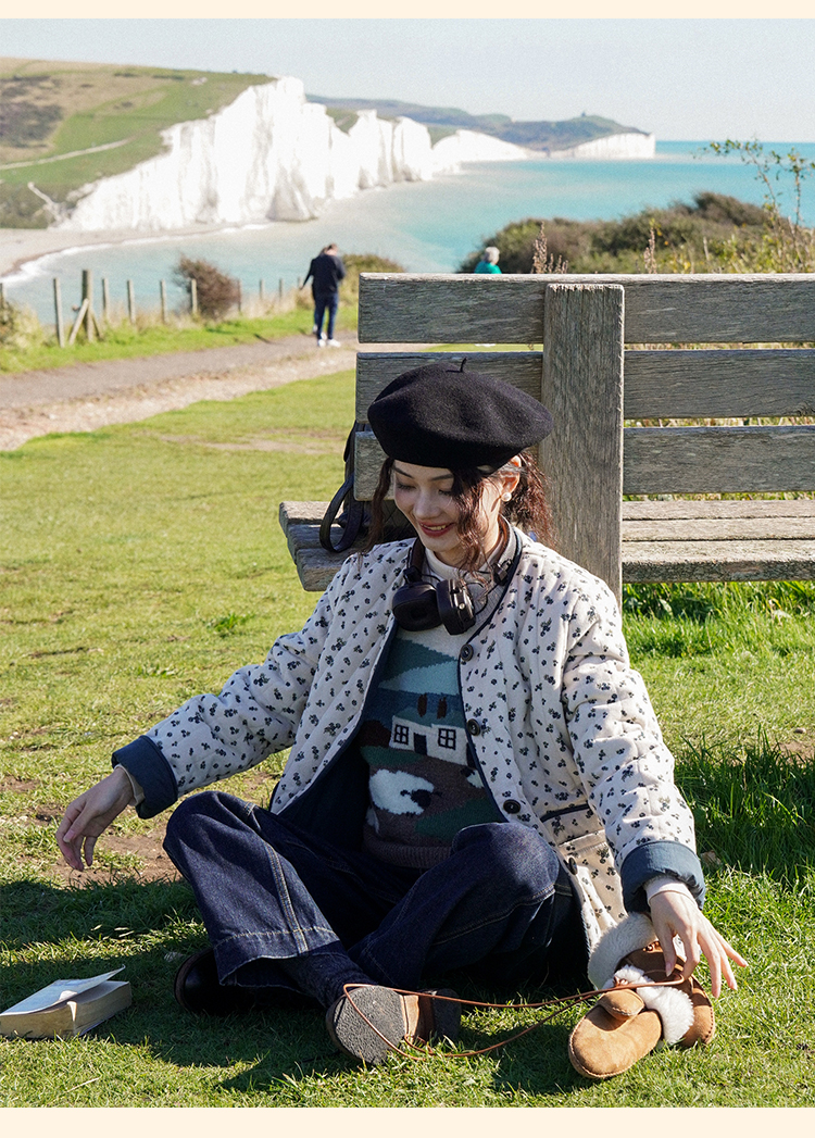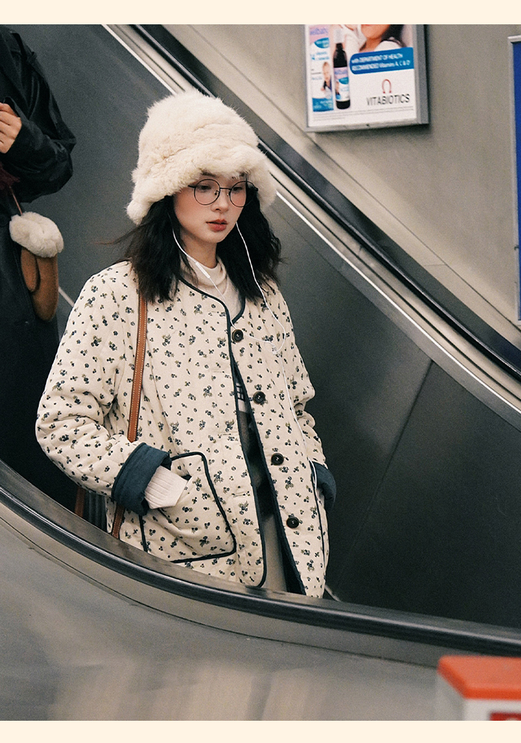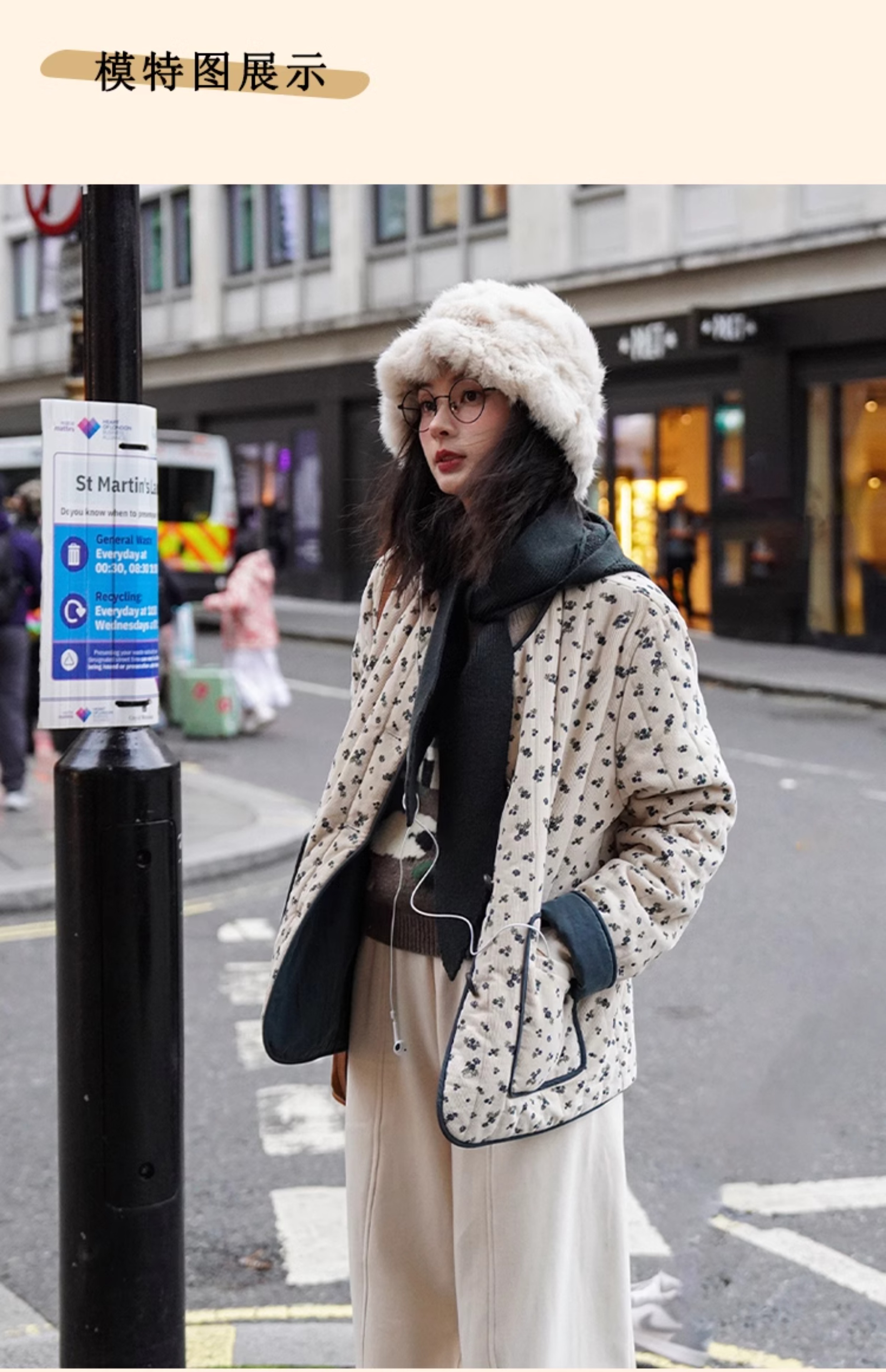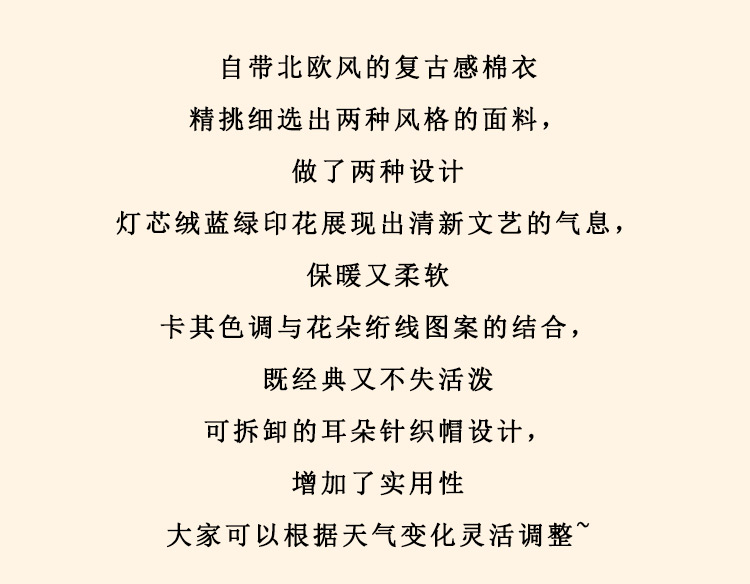 浮生八记/24D166/可拆耳朵针织帽绗缝花朵棉衣
