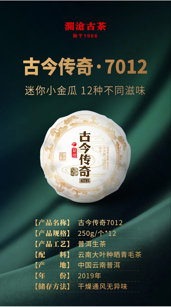 澜沧古茶古今传奇7012名山古树头春茶纯料普洱茶生茶250g金瓜*12