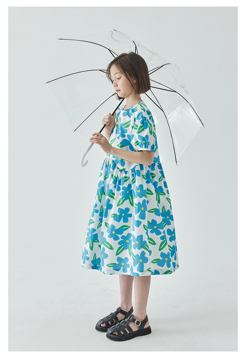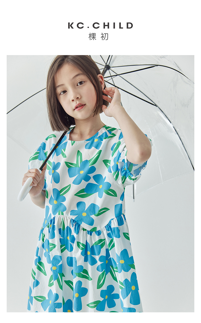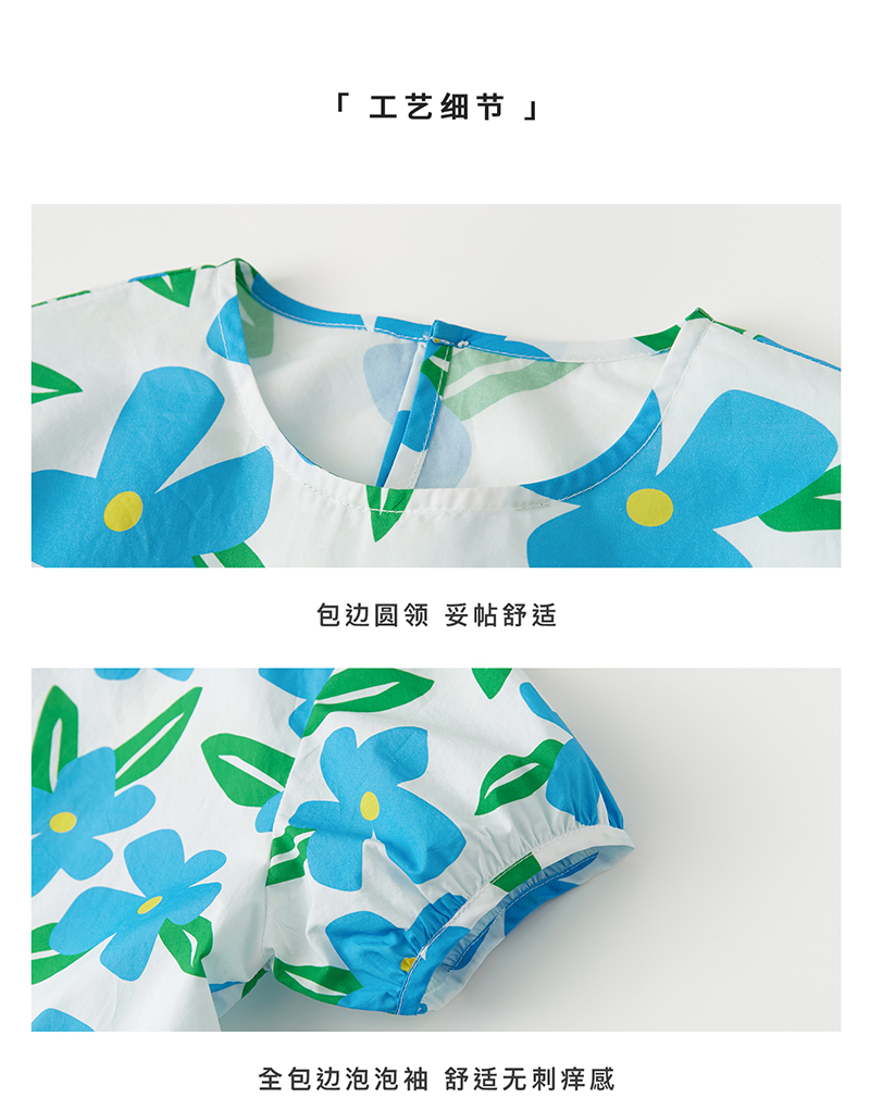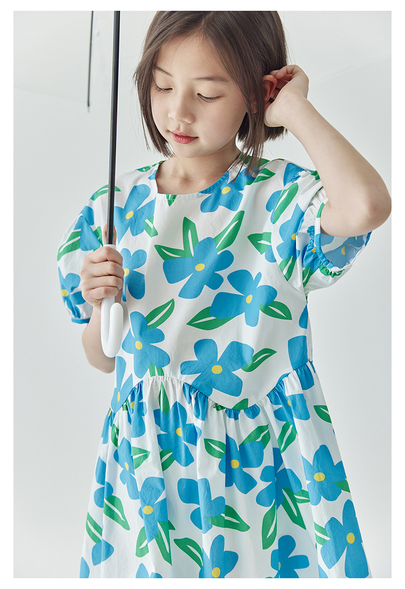 【代发】蓝色印花连衣裙 棵初夏季女童蓝花色全棉印花裙子中大童泡泡袖褶皱碎花裙