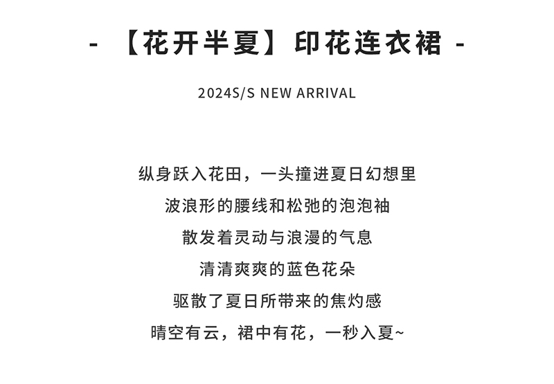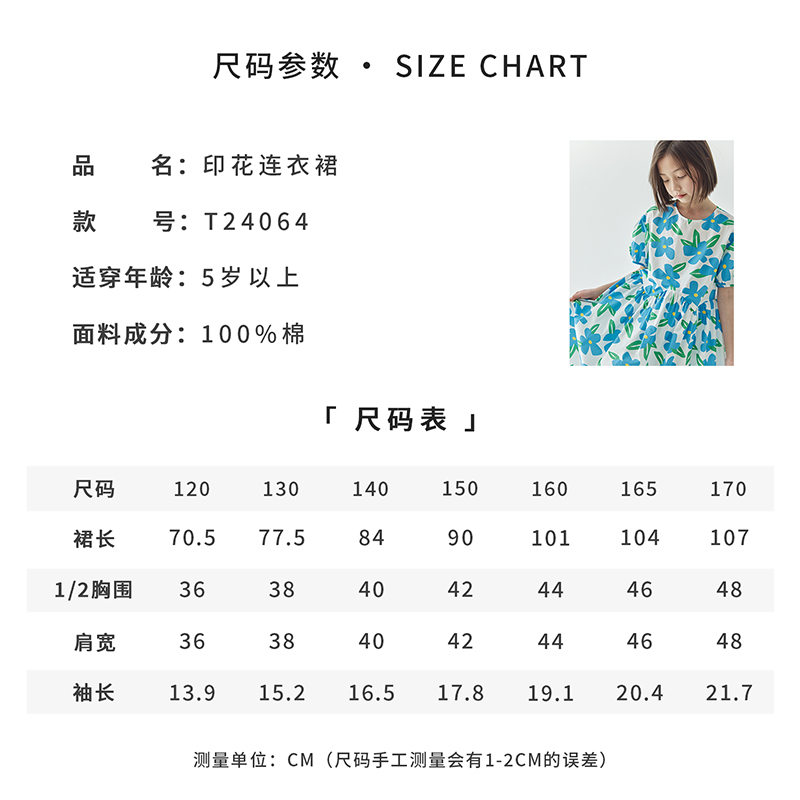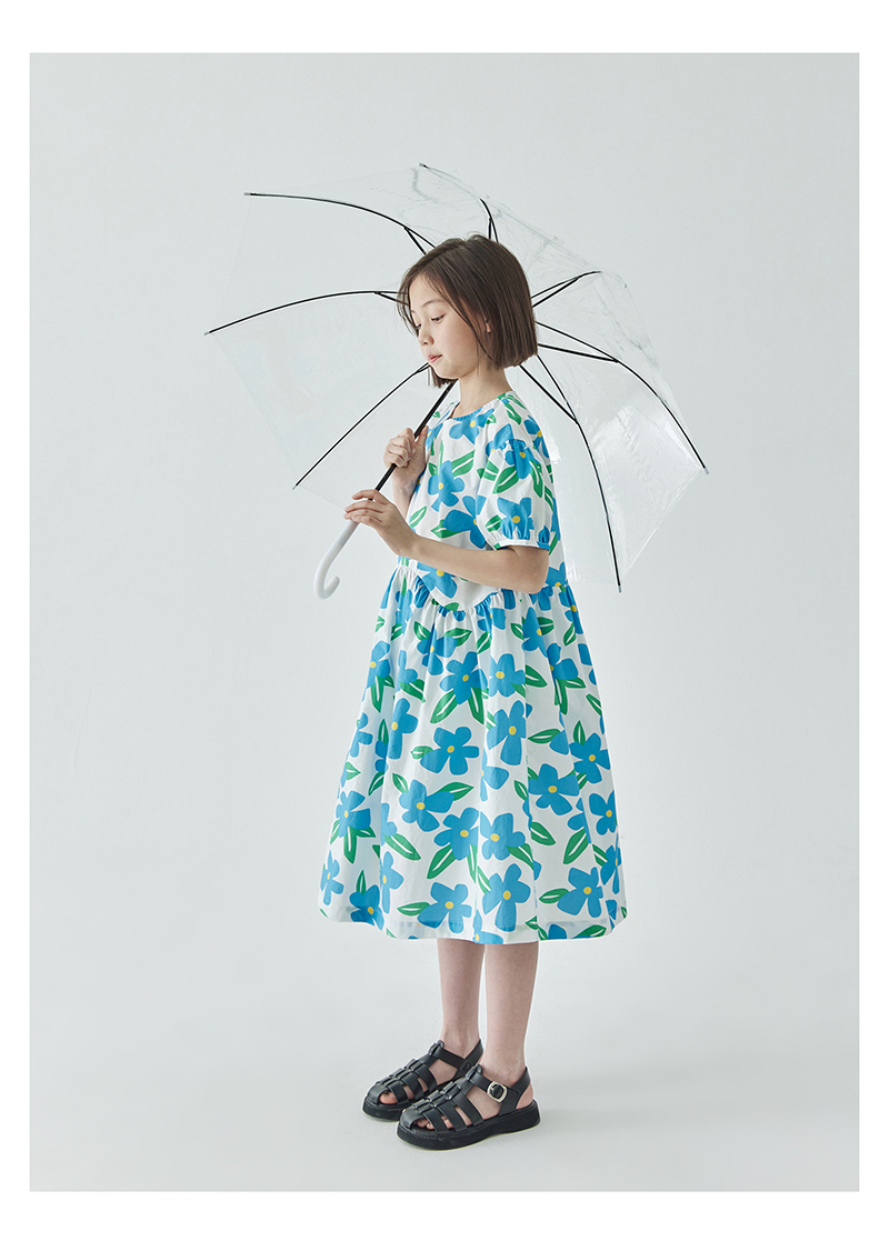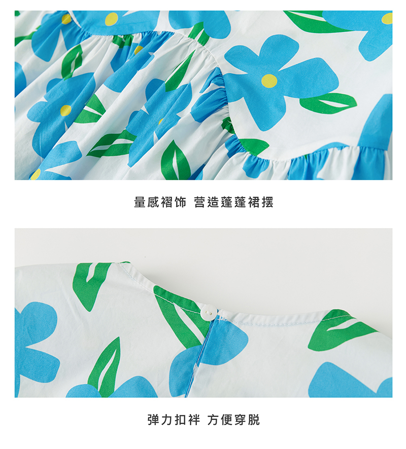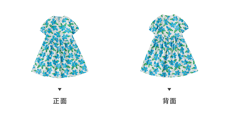 【代发】蓝色印花连衣裙 棵初夏季女童蓝花色全棉印花裙子中大童泡泡袖褶皱碎花裙