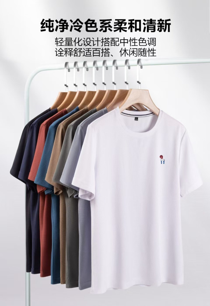 男生们夏天别只穿纯棉了!这件“会呼吸”的T恤才是真香! •瞬间凉感:一上身就有冰冰凉的感觉,像贴了降温贴,夏天通勤必备。 •吸湿速干:出汗不粘身,风一吹就干,告别“湿身”尴尬。 •8色任选:白色、藏青、黑色、军绿、卡其、蓝灰、浅灰、砖红,满足商务和休闲所有搭配。 ✅面料与版型: 100%聚酯纤维华夫格面料,立体纹理,质感高级, 比纯棉更抗皱、更挺括。微宽松版型,遮肉显瘦,正肩设计不垮塌。 ✅价格:限时团购价,性价比极高!