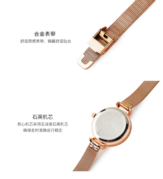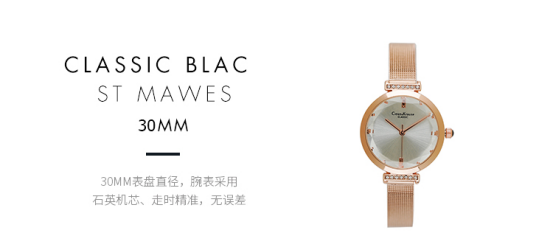 Clous Krause女士石英手表81339363 吊牌价:999 颜色:玫金 机芯:石英机芯 表镜材质:矿物质强化玻璃 表带材质:SUS304L 表盘直径/厚度:30mm*7mm 时光跌跌撞撞,季节来来往往。 戴上这款休闲时尚女士手表成为时间童话里的女王↵ 璀璨时光既是腕表更是 时间从未停止向前,我们也一样 每个女生都该拥有的浪漫气质 拥有游弋在优雅自信里的美↵