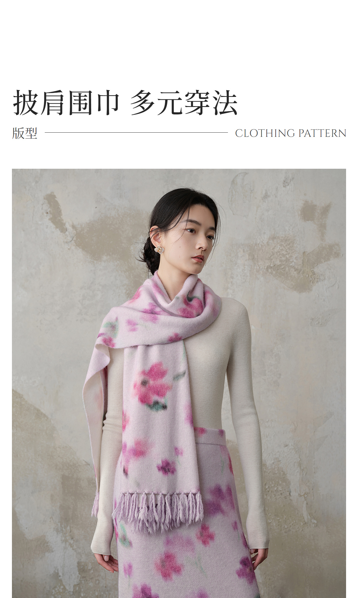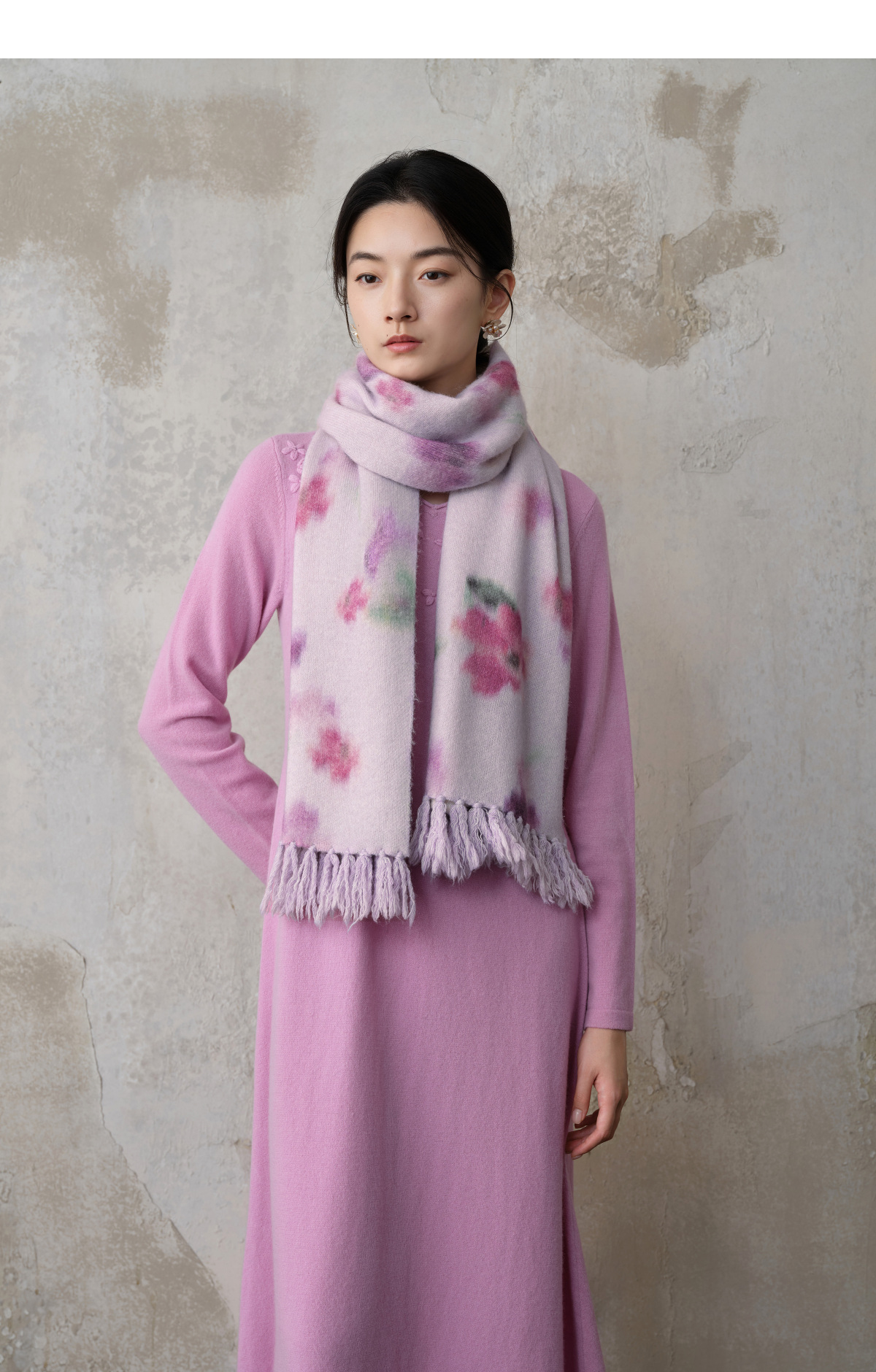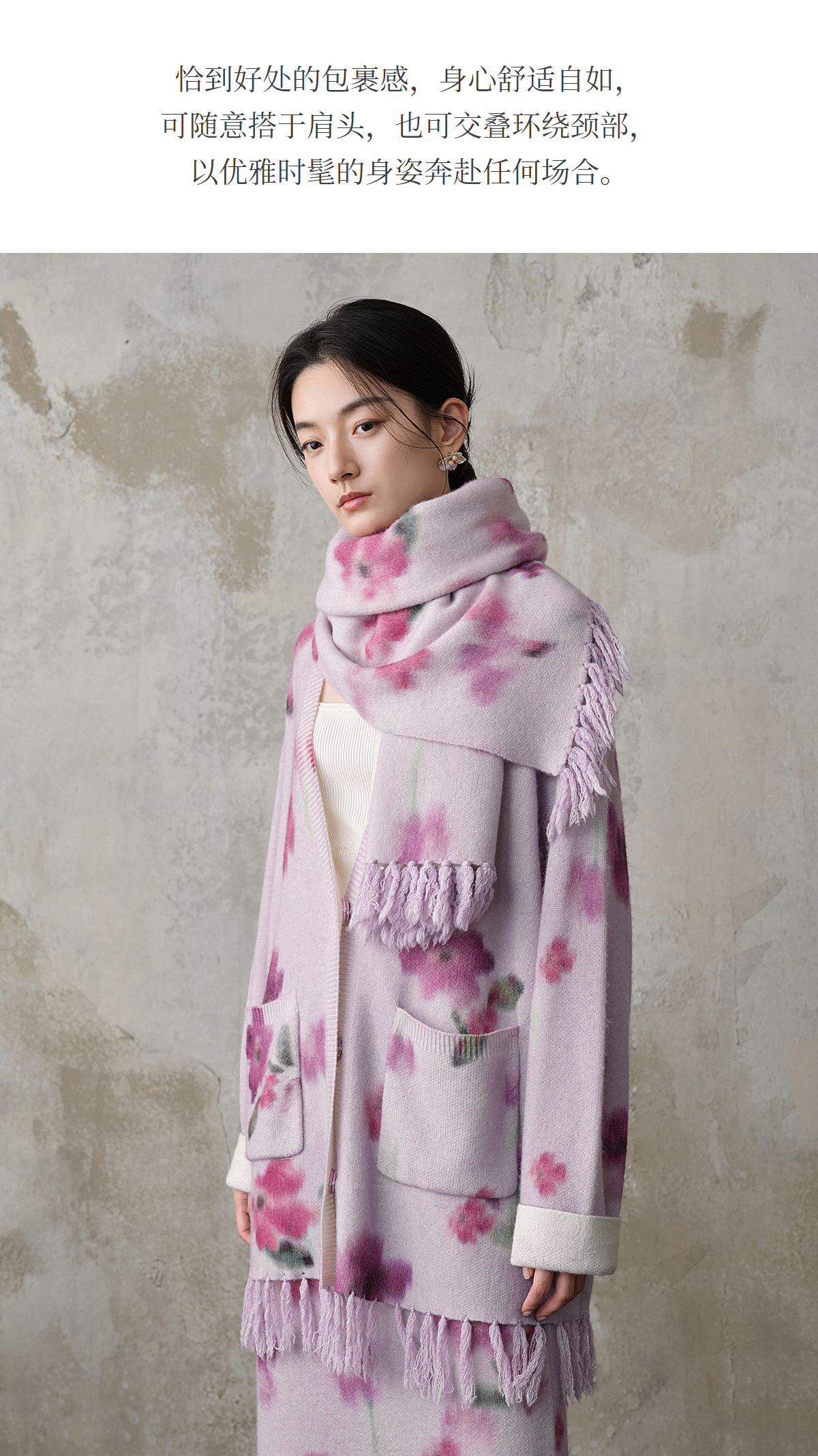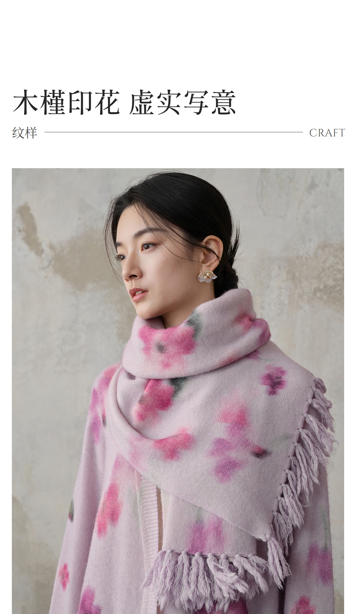 【林栖设计小店】木槿紫听风系列印花围巾流苏羊驼毛优雅保暖百搭2025秋冬新款毛织披肩女2954080