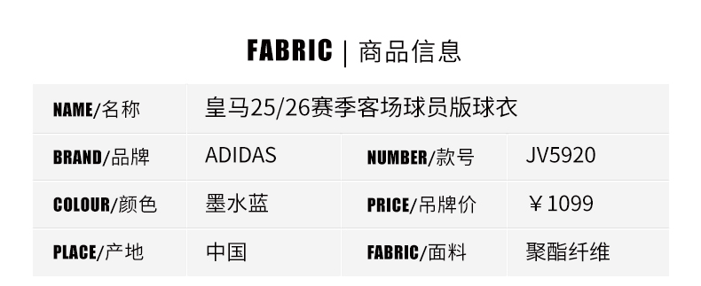 SFS阿迪达斯Adidas 25/26皇马客场球员版球衣短袖足球服JV5920