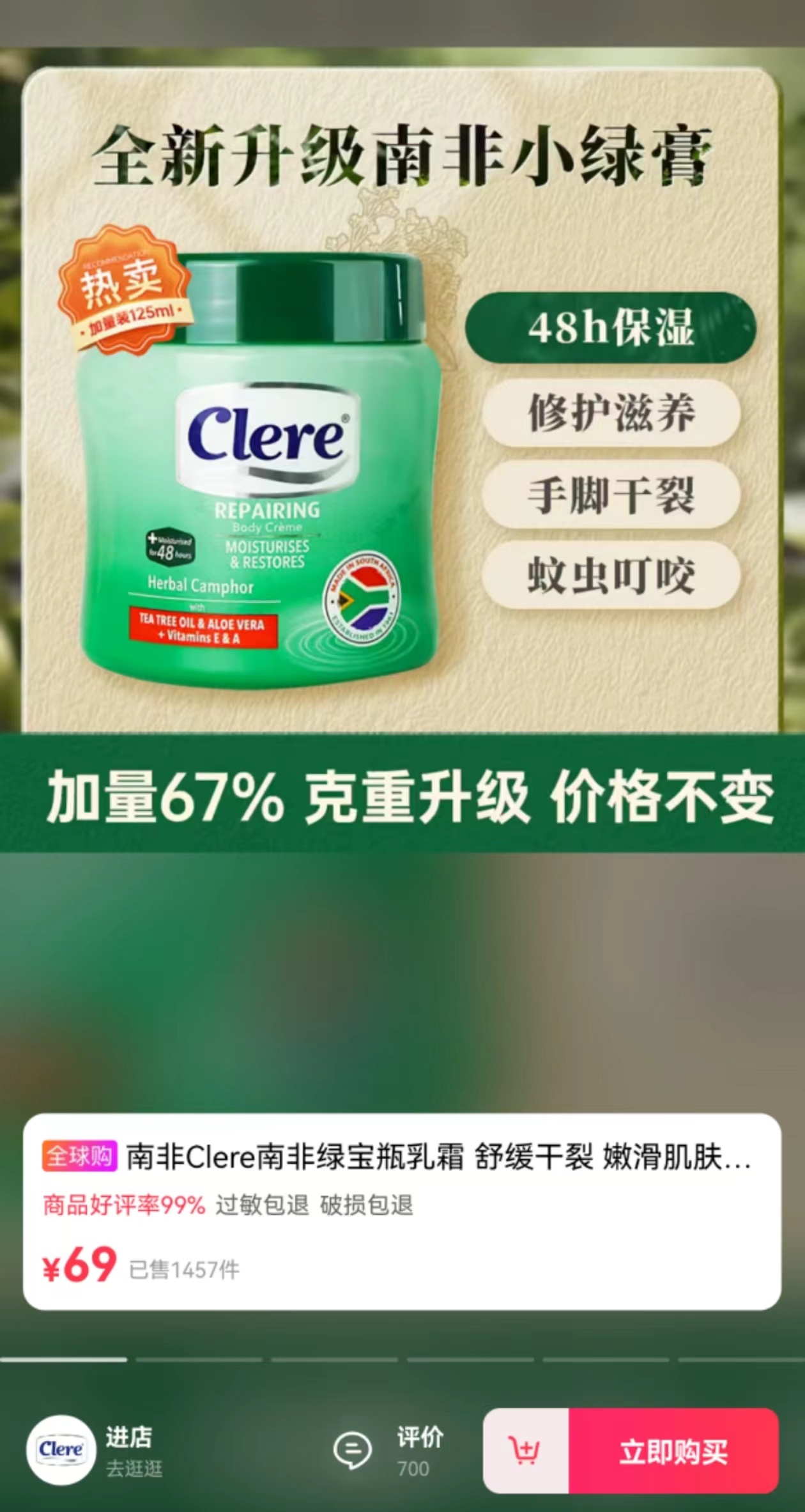🌳【南非Clere万用小绿膏】1罐=身体乳+干裂膏+手足膜+保湿修复霜+止痒膏+驱蚊膏