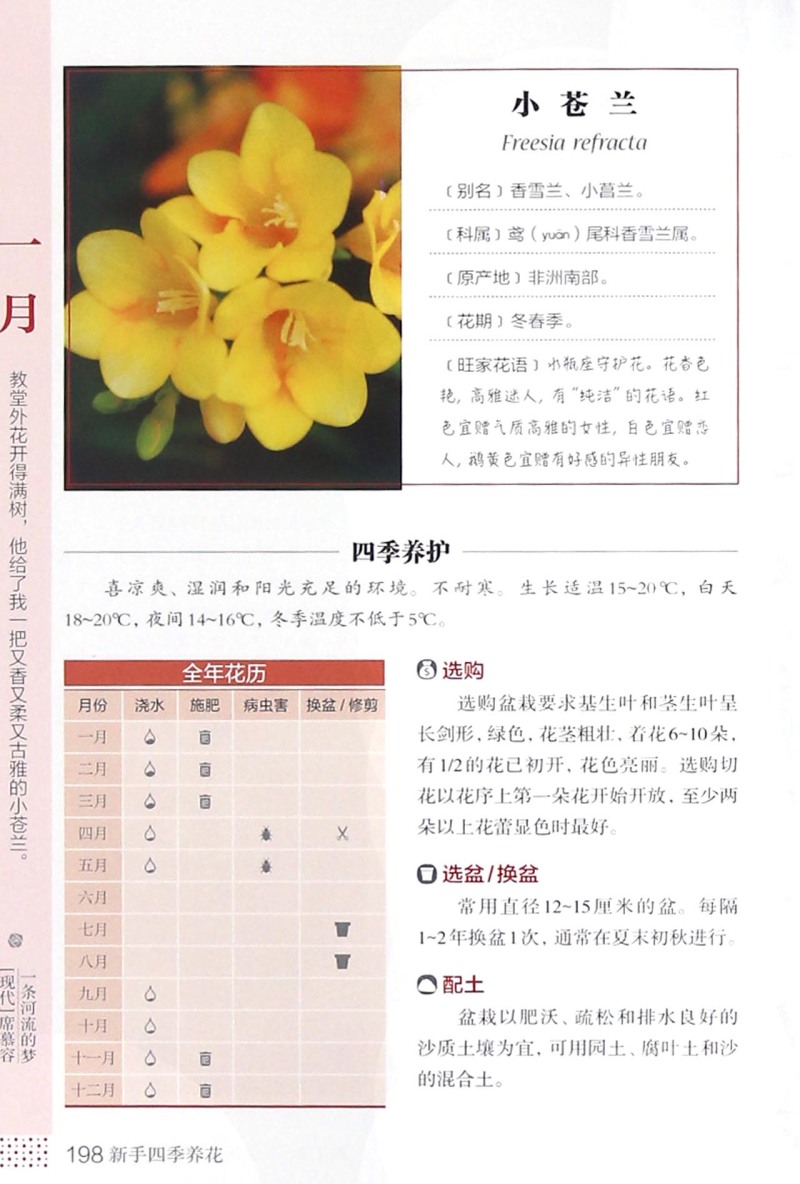 收录了适合春、夏、秋、冬四季栽培的80种常见花卉,从花盆、土壤、肥料的挑选开始,讲到每种花的选购、摆放、浇水、光照、施肥、修剪、换盆、繁殖以及病虫害的防治,帮你的爱花平安度过一年四季,常伴你身边。