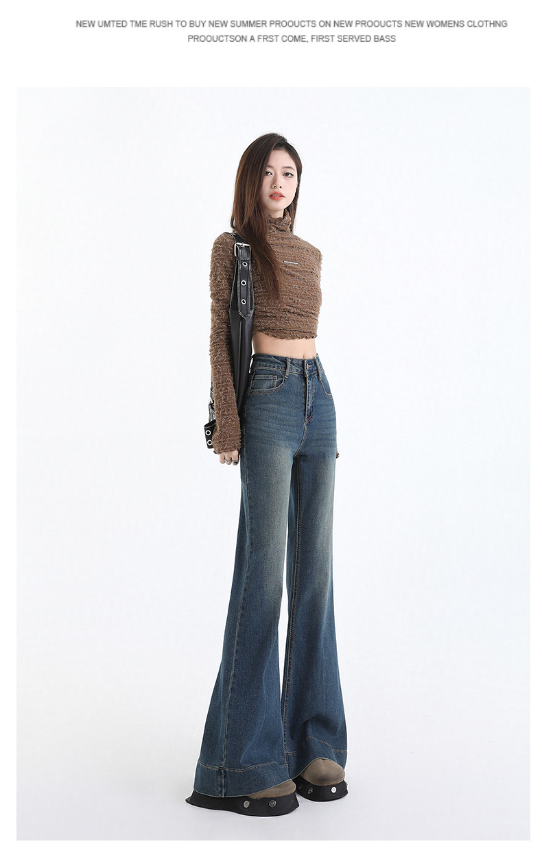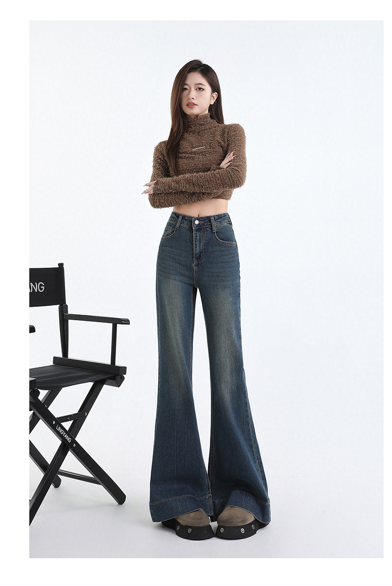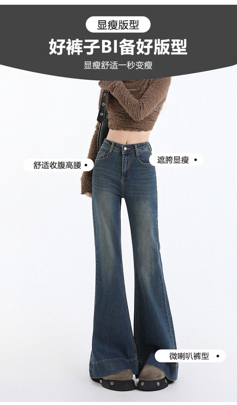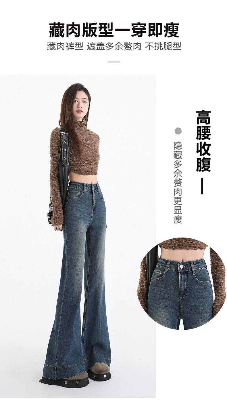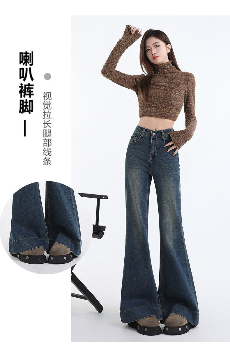 【美式复古蓝色加长喇叭裤】春秋高腰宽松修身显瘦微喇牛仔裤