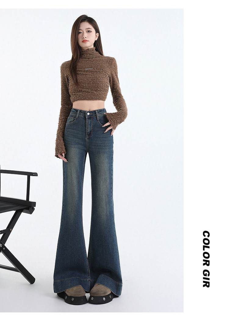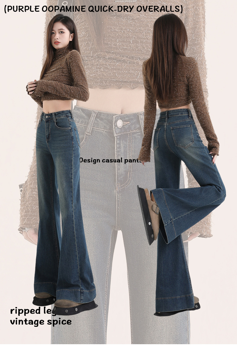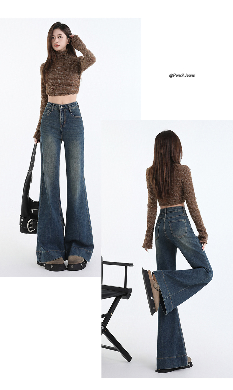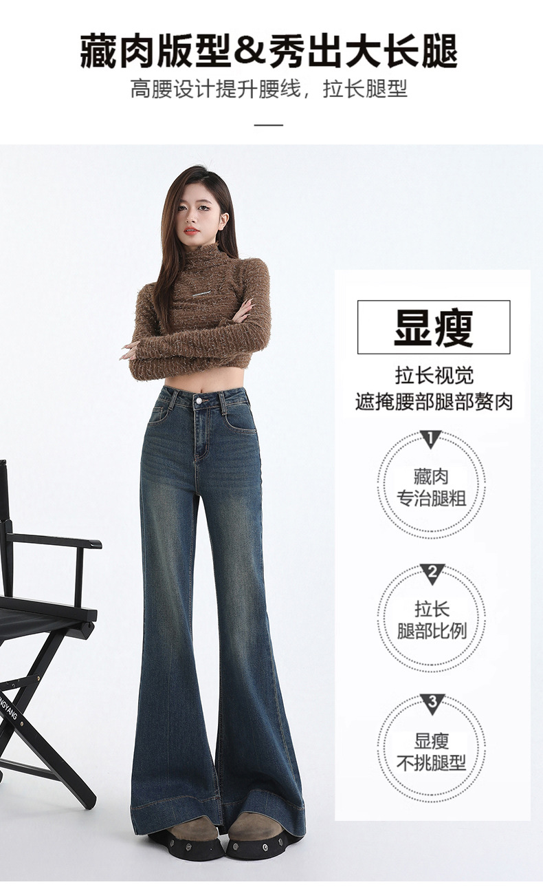 【美式复古蓝色加长喇叭裤】春秋高腰宽松修身显瘦微喇牛仔裤