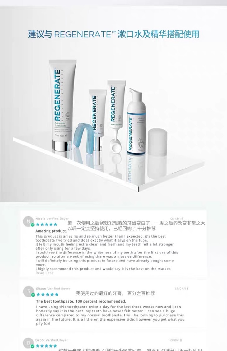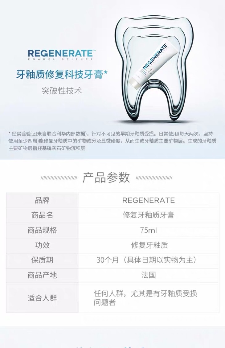 法国Regenerate进口瓷白美白修护牙釉质牙膏75ml/支/园园最爱牙膏