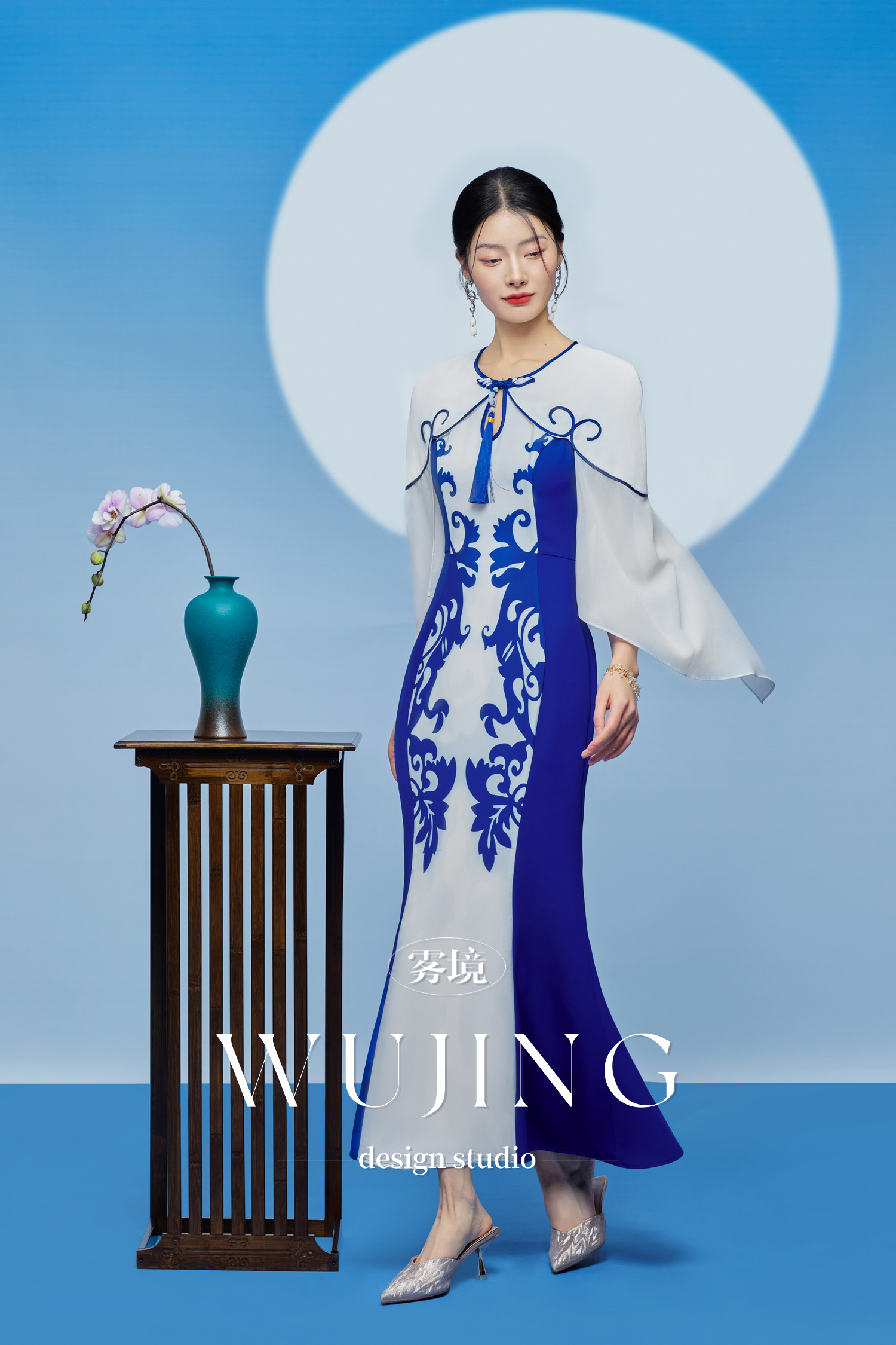 3205042 青花古韵 进口纹理蜂窝缎/韩国进口水晶乔其纱青花瓷定位印花连衣裙 雾境