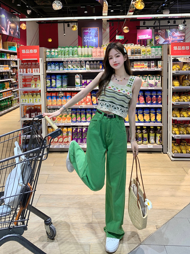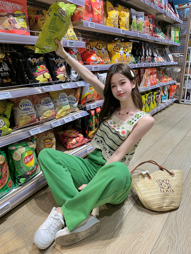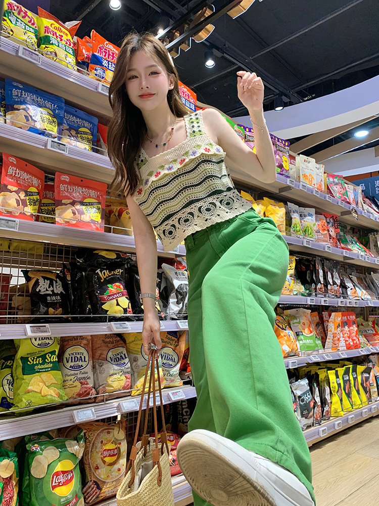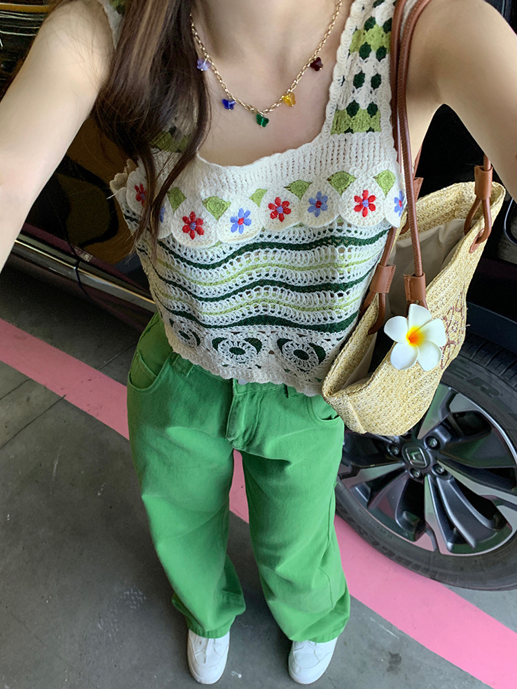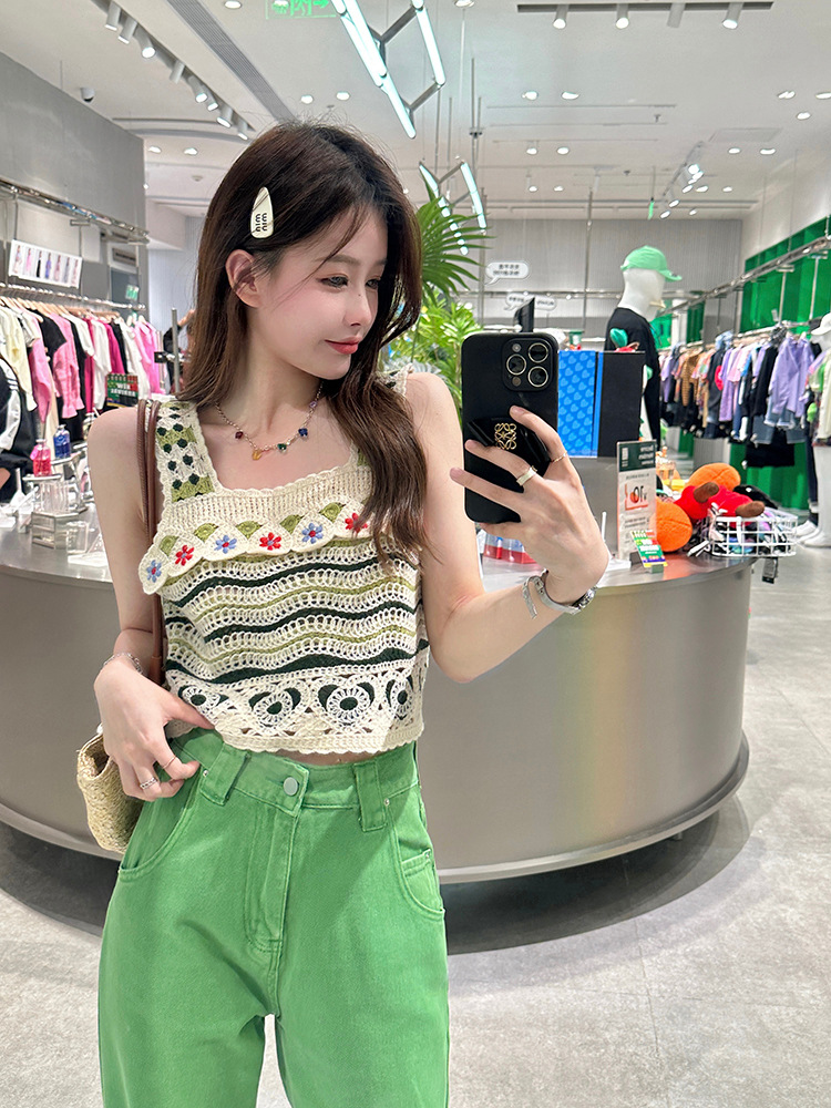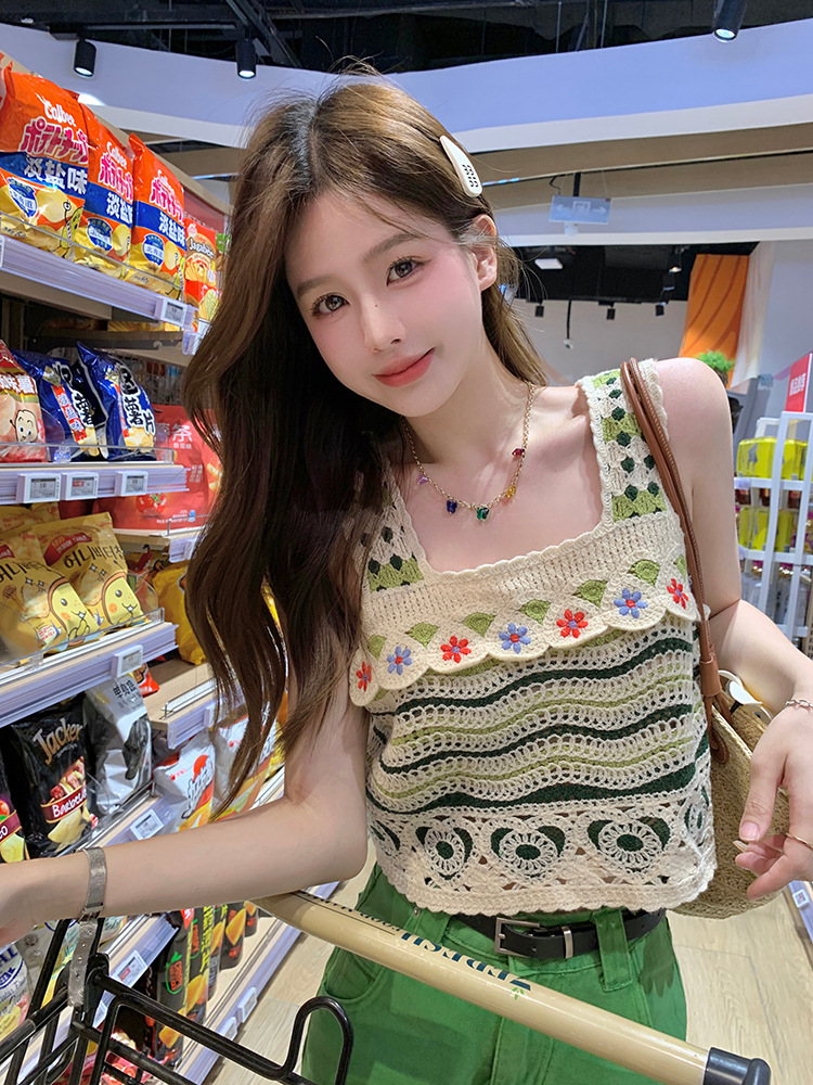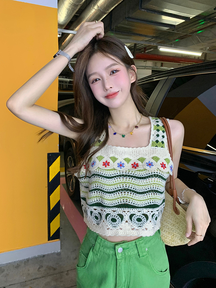 【辣妹方领吊带背心】镂空针织上衣女 夏季新款 甜美设计感 显瘦条纹上衣