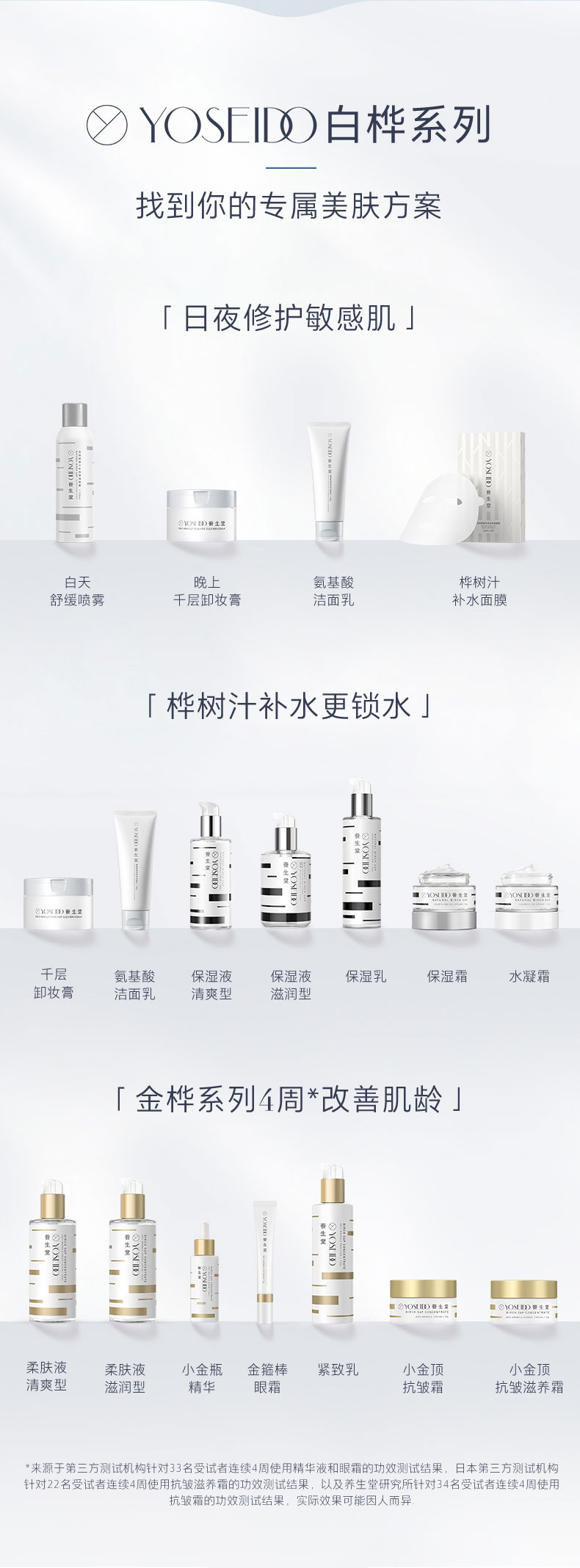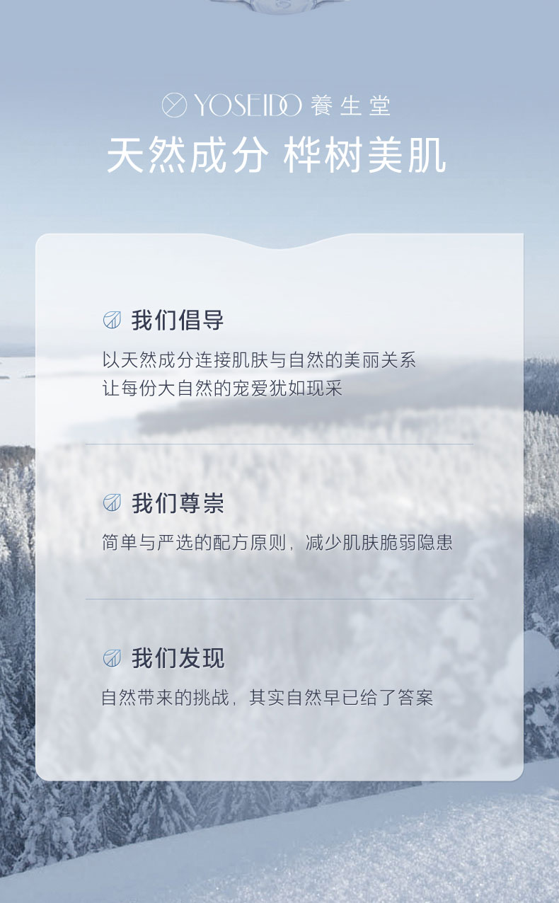 - 养生堂YOSEIDO,高端护肤品牌。专研白桦原液•来自北纬45° 的细胞抗老成分,源自1772年《丹麦药典》。不额外添加一滴水,让青春永续。