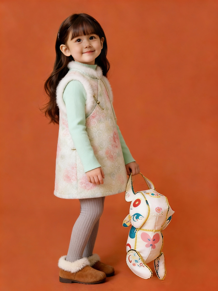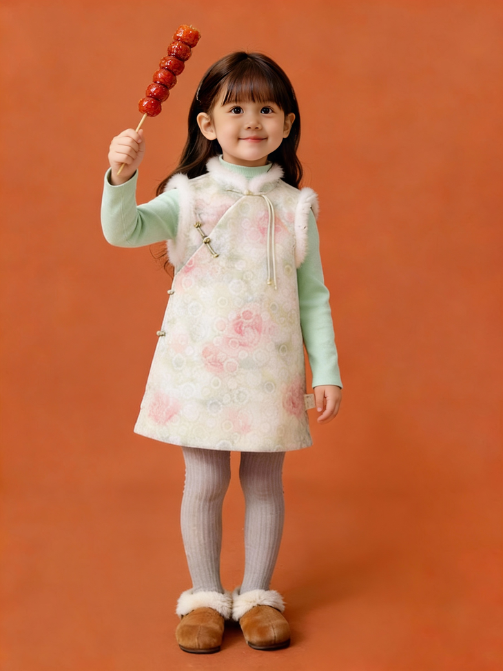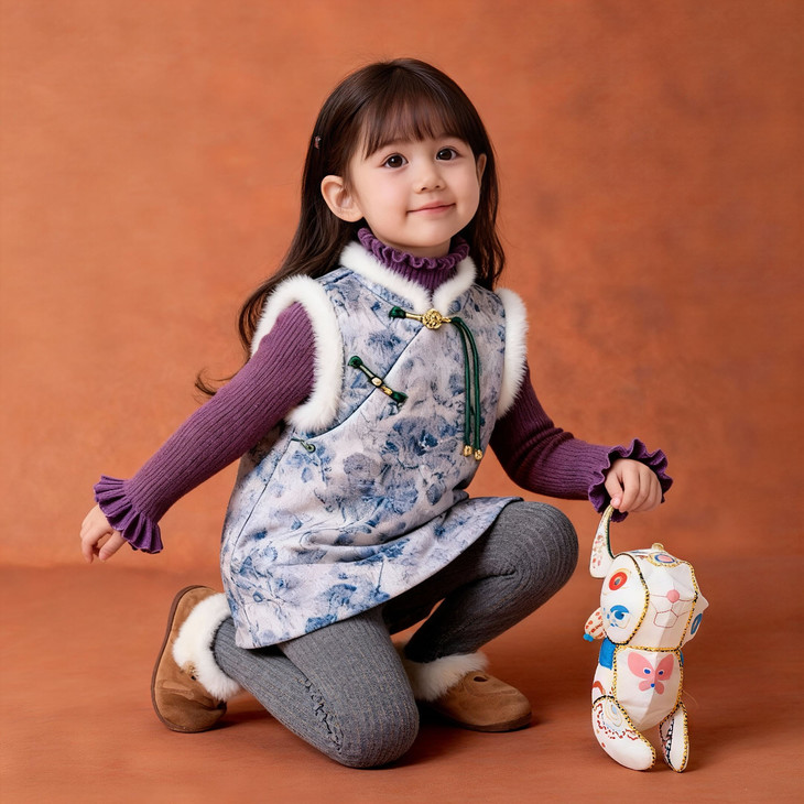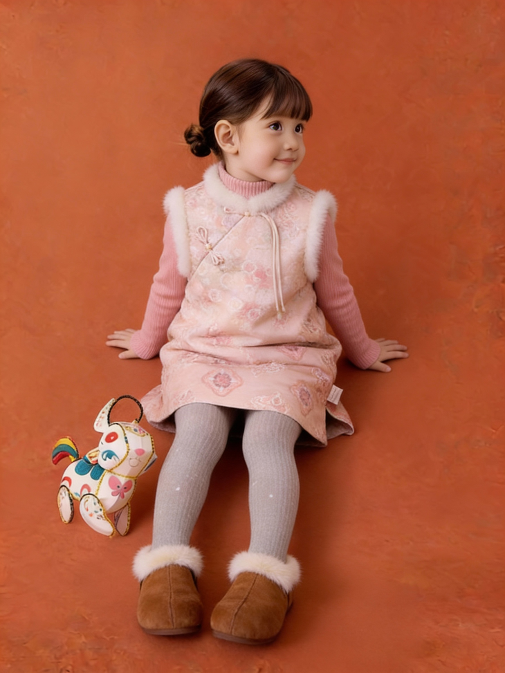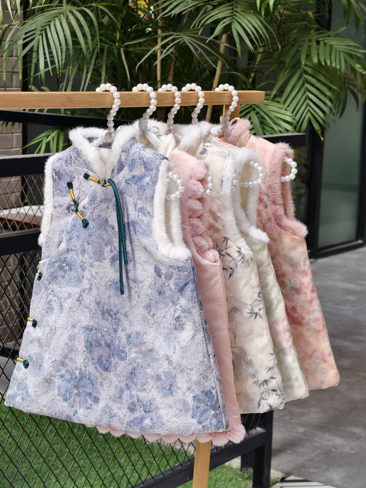 🔺裙式马甲款(懒人妈妈的福音!) ✅这是马甲和连衣裙二合一的设计,真的太省心了! ✅长度刚刚好,在膝盖上面一点 日常穿完全不会夸张 花色选择最多:粉绫、烟紫、素瓷、粉芍、青荷... 名字都很好听,都是温温柔柔的颜色。 ✅ 穿上就是完整的一套 不用再烦心怎么搭配上衣和裙子 国风氛围感直接拉满! ✅ 里面是加绒的,冬天穿不会冷 腰身那里稍微收一点,看起来很乖巧。
