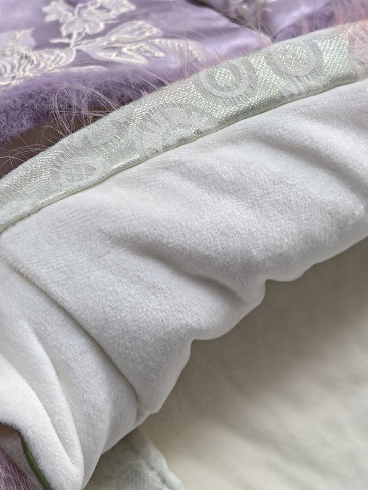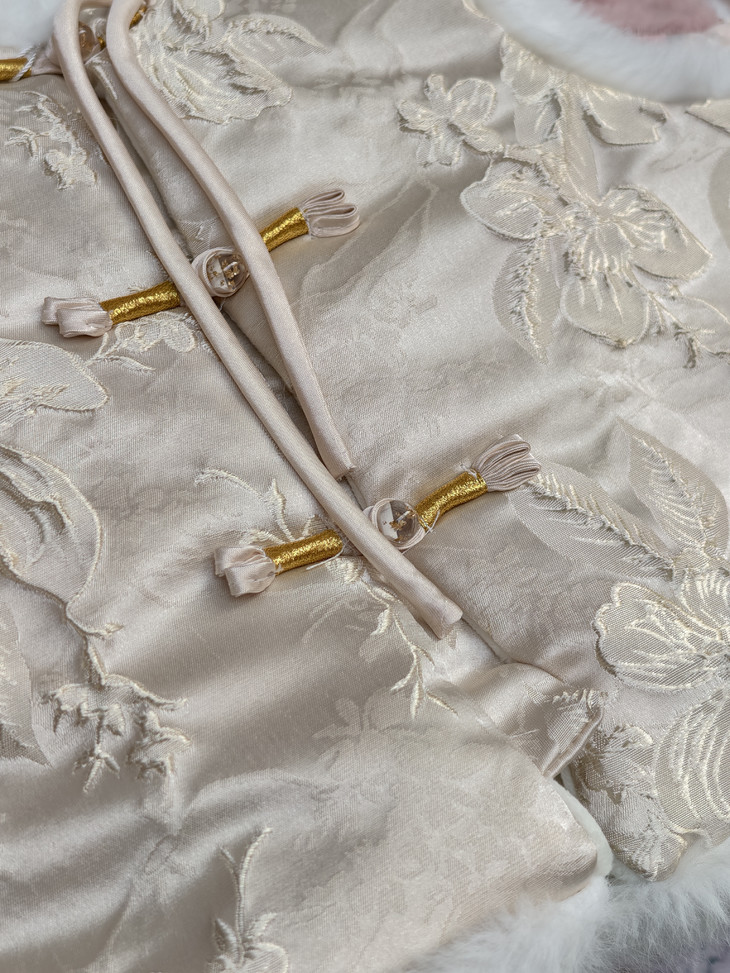 🔺织纹盘扣款(日常穿最多的一款) ✅ 这款特别适合想低调点 但又想有点中式味道的妈妈。 ✅ 面料仔细看有细细的纹理,不是光面的 摸起来很有质感 颜色是粉棠、淡紫、月白这种淡淡的,很素净。 ✅ 版型是短款的,穿上显得腿长,不压个子 小个子宝宝穿特别精神! ✅ 经典盘扣设计,简单大方 里面加了薄绒,保暖但是不厚重 孩子活动起来很方便