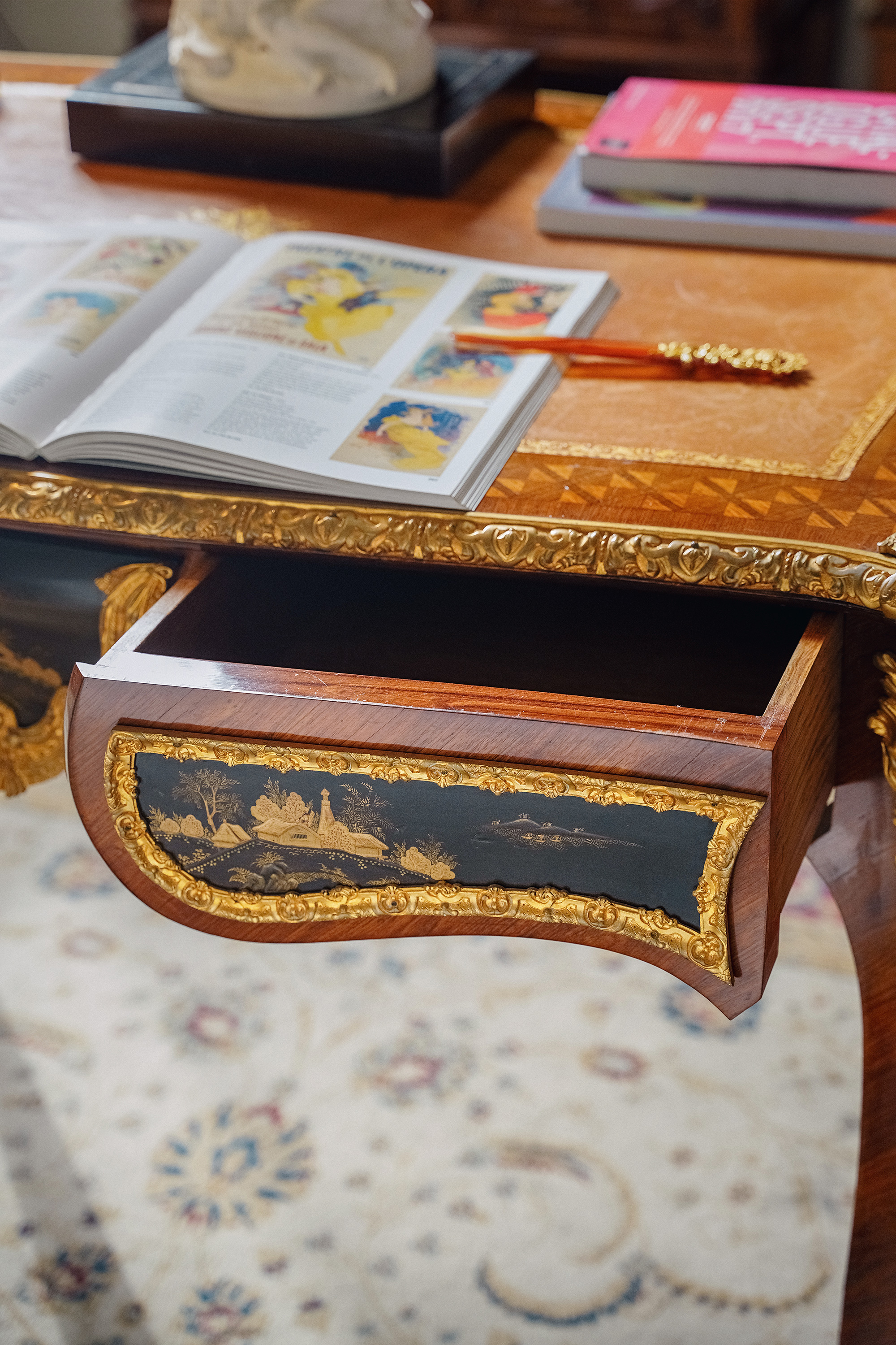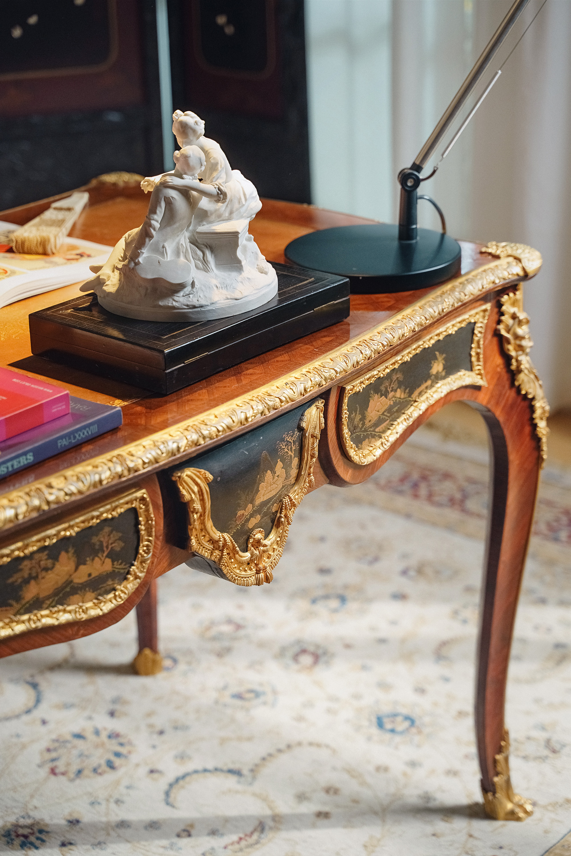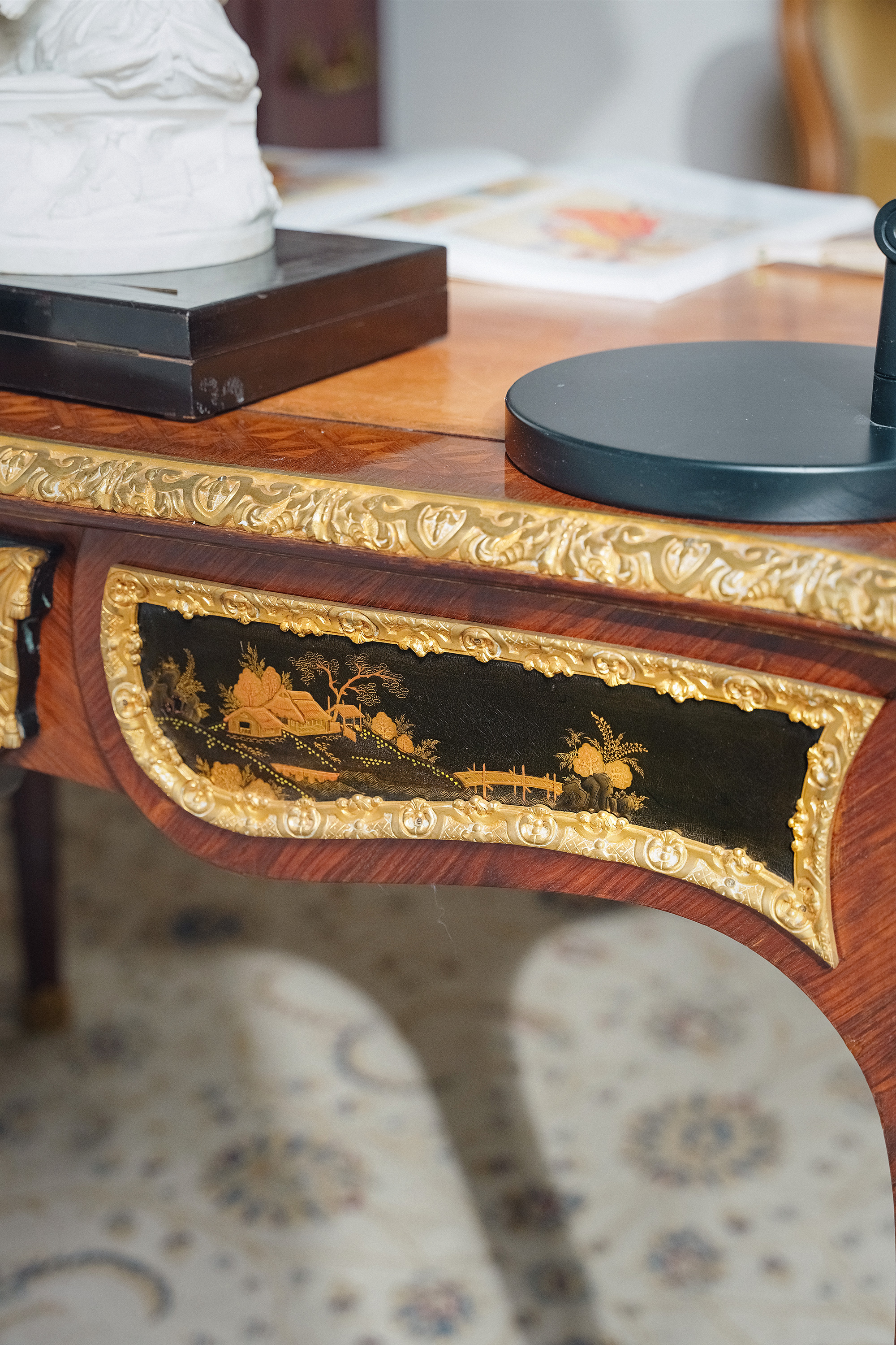 【已售】独角鹿西洋古董1880年代法国出品东方风格牛皮台面装饰卷叶人面纹铜鎏金精雕嵌山水主题黑地金漆莳绘硬木书桌