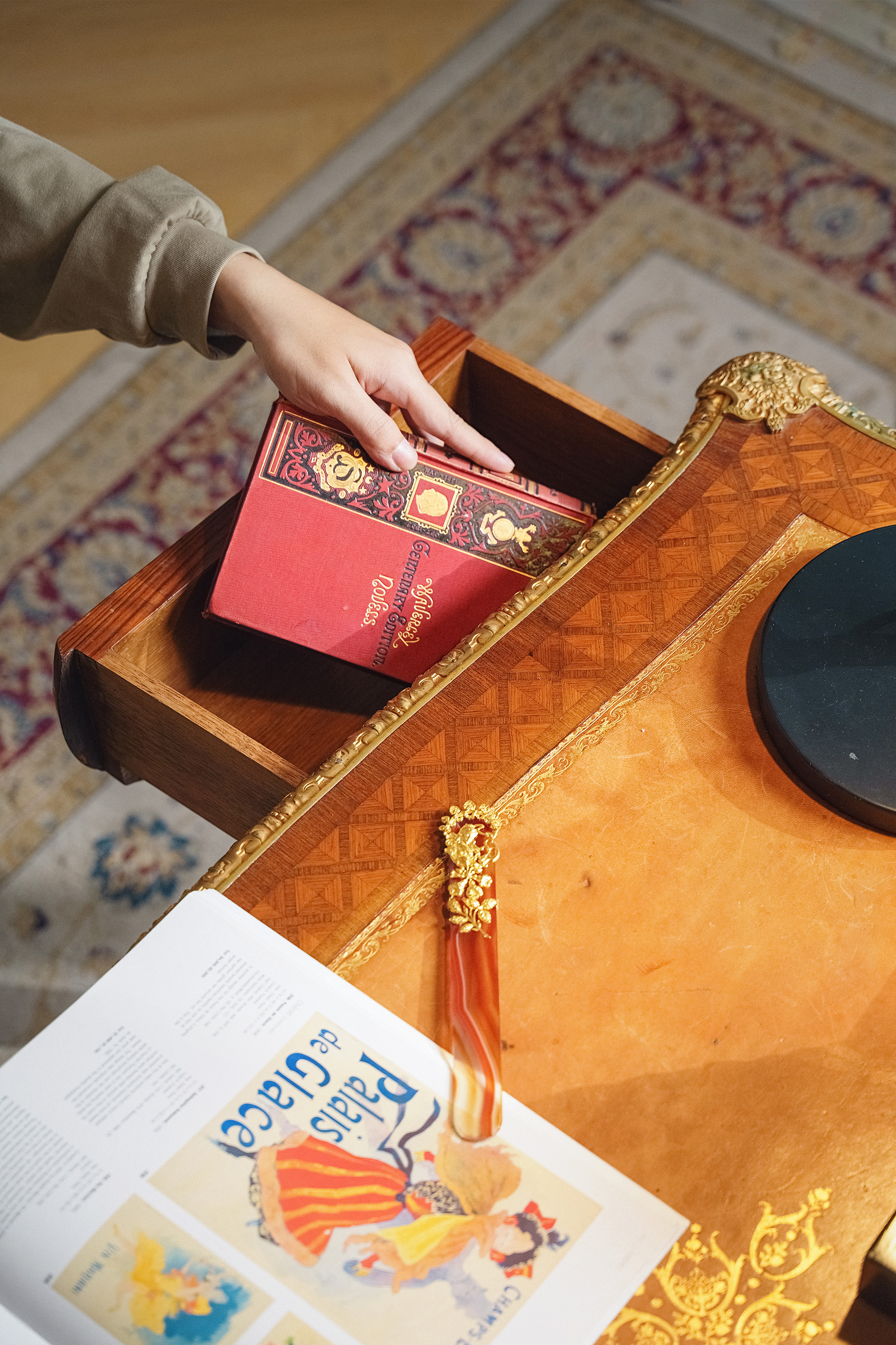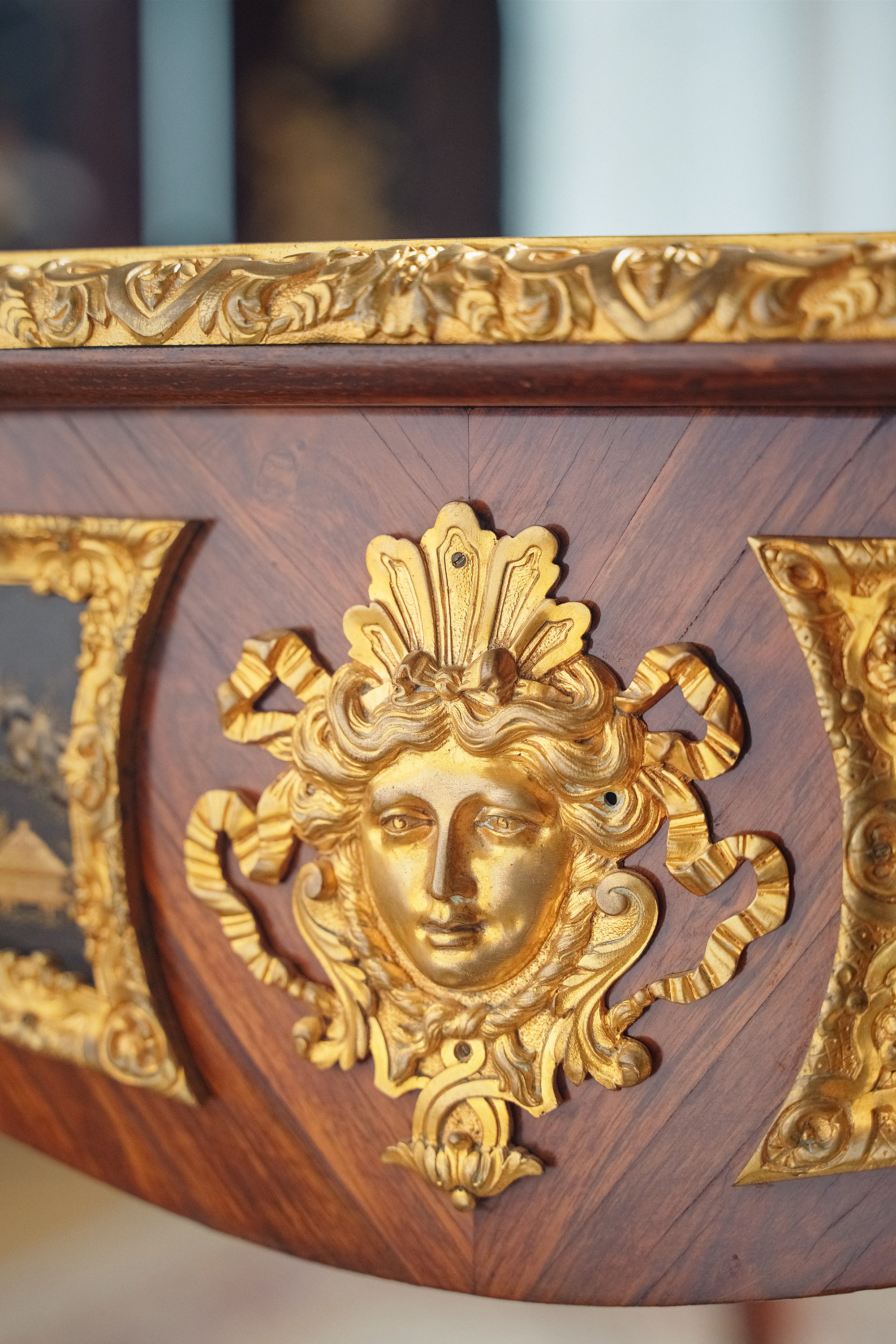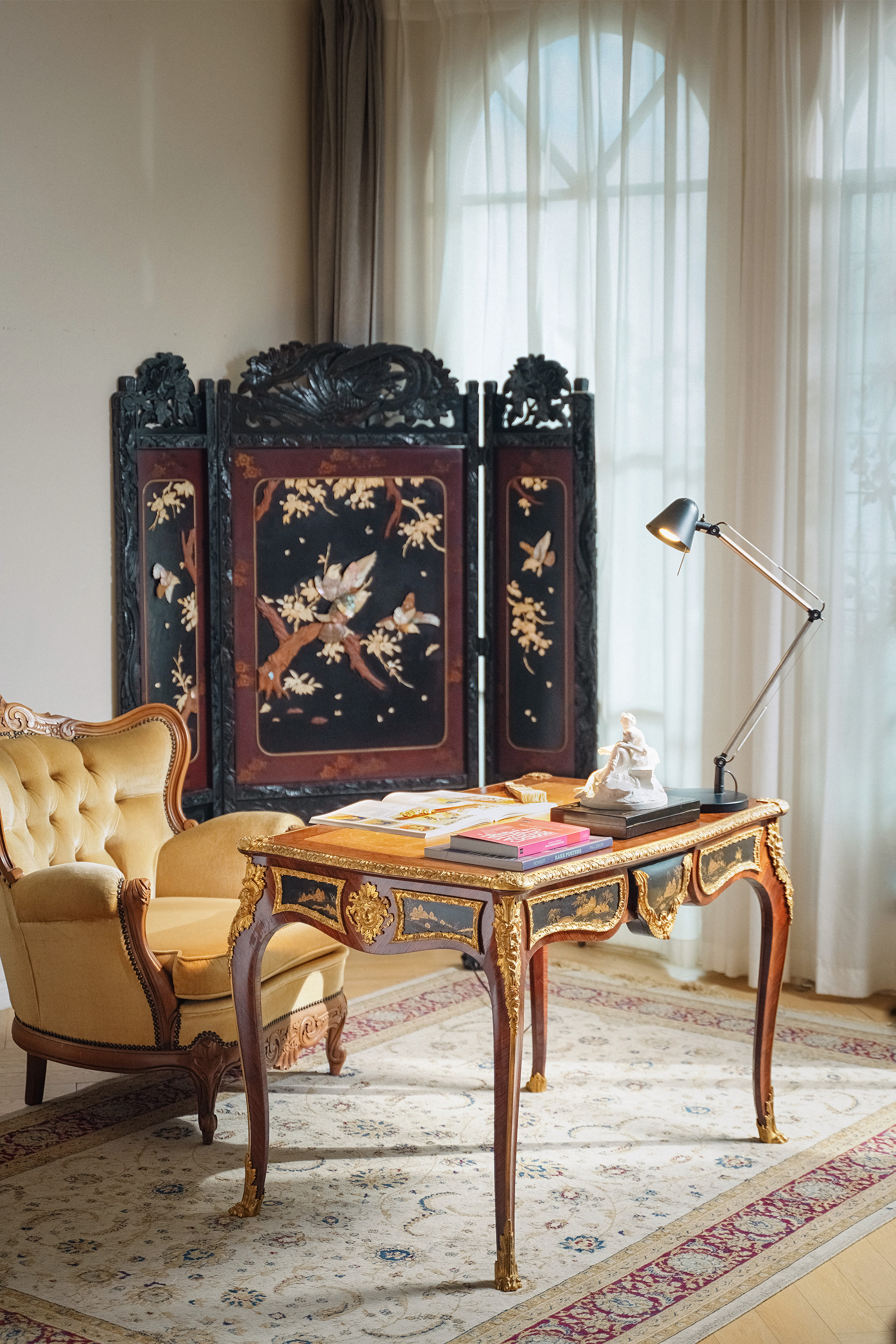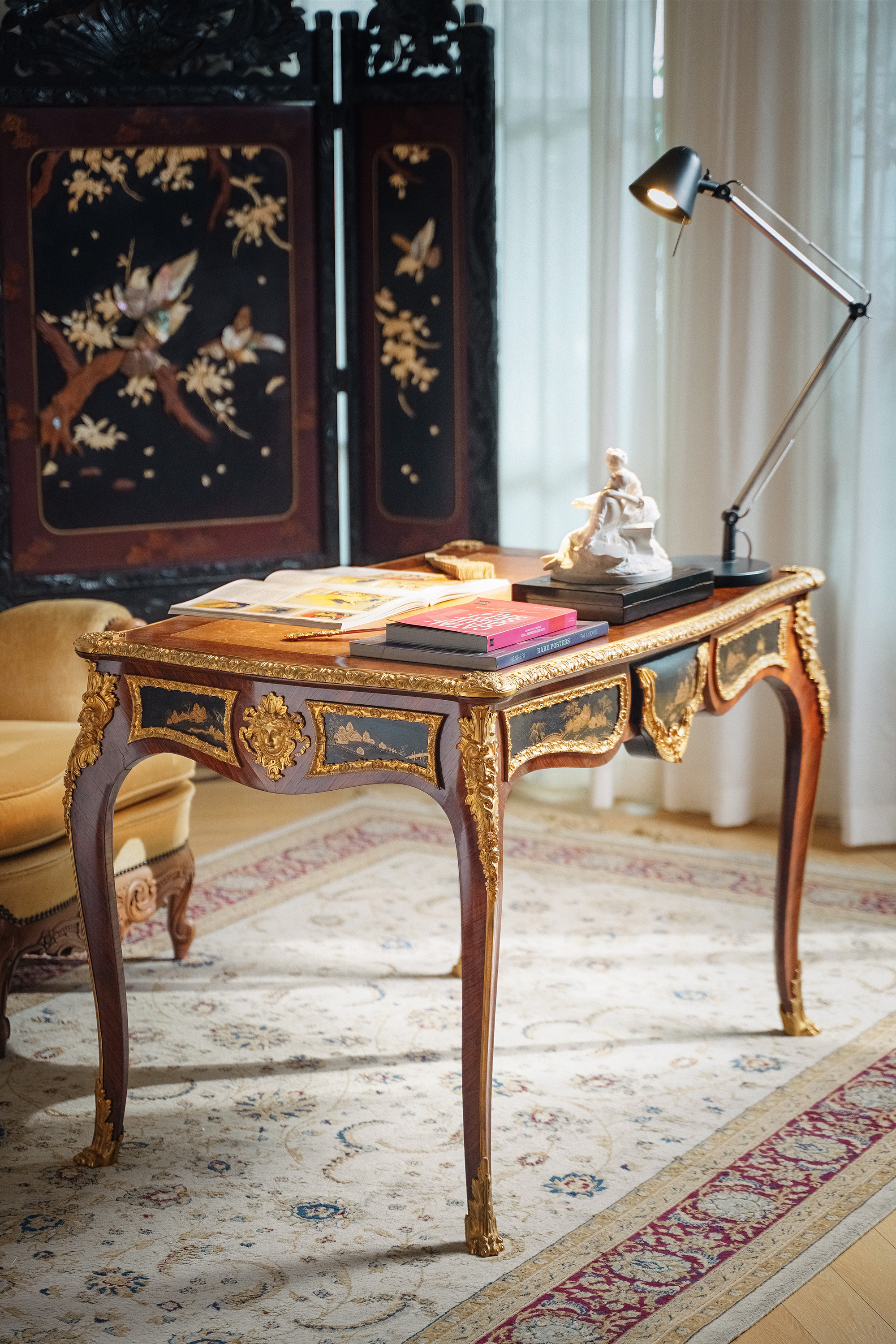 【已售】独角鹿西洋古董1880年代法国出品东方风格牛皮台面装饰卷叶人面纹铜鎏金精雕嵌山水主题黑地金漆莳绘硬木书桌