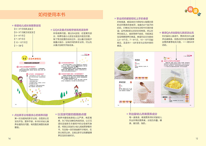 考虑到上班族妈妈时间有限,特别在作法上,提供简单不麻烦,而且每一道都是宝宝需要的营养料理。食谱的区分为:4~6、7~9、10~12个月副食品及1~3岁宝宝适合与父母共食的料理。