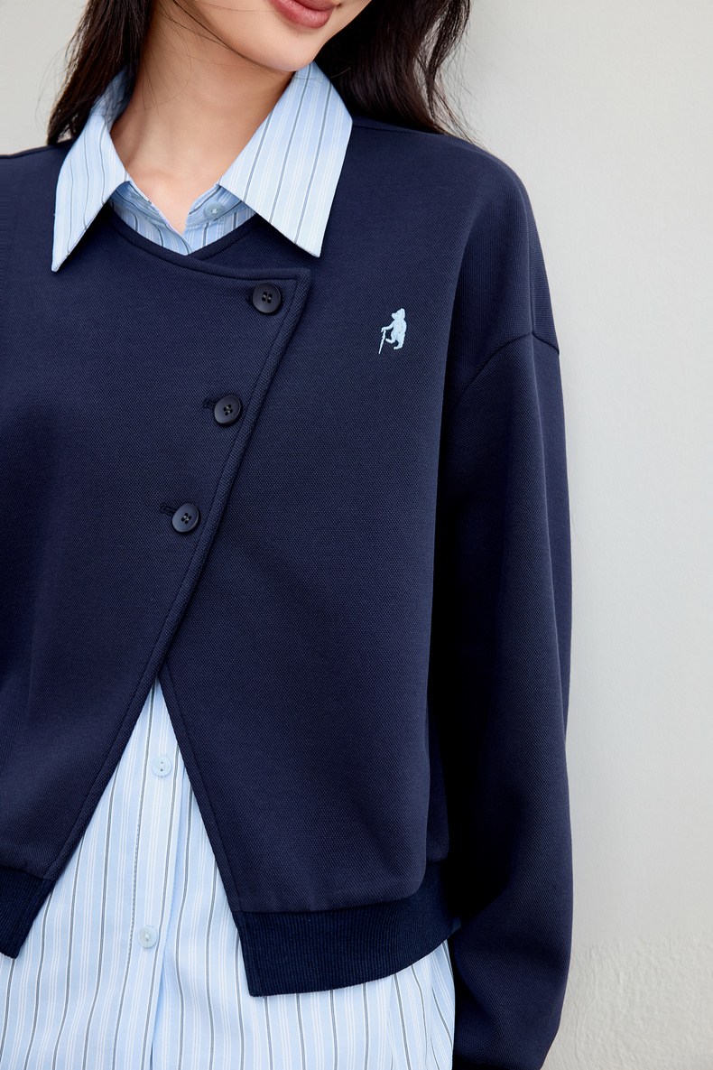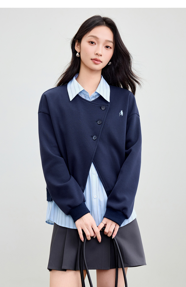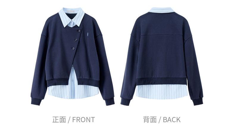【内购】【假两件】通勤设计感撞色拼接条纹翻领宽松落肩长袖空气层卫衣-153AB2931